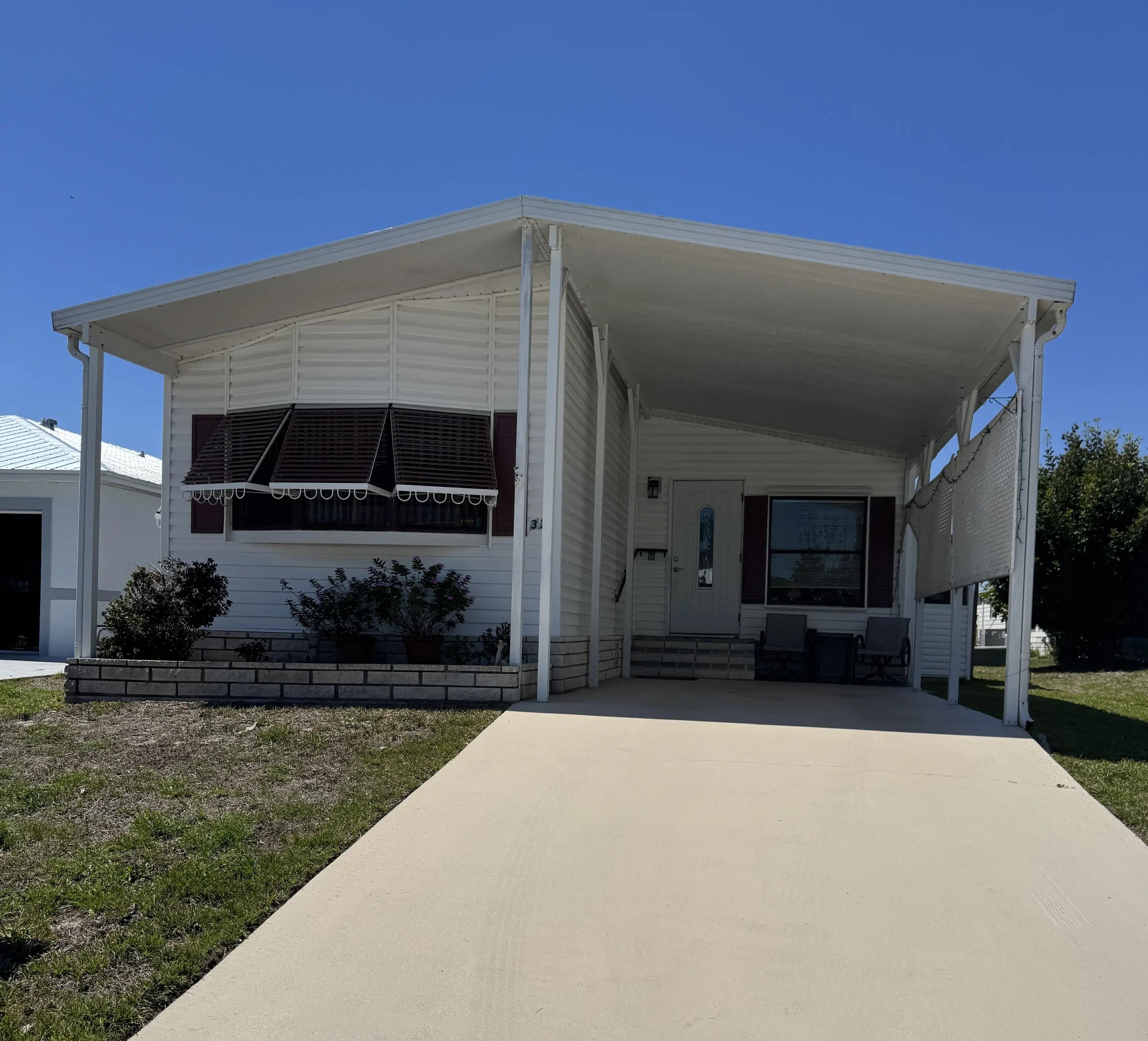 2-bedroom 2-bath home in the 55+ Spanish Lakes Country Club Village community. This home has newer roof 2024 new A/C unit 2025 and all the anchor strappings have been replaced in 2024. This home is being sold furnished. Home has a screened in patio with laundry inside of home. Home is priced to sell. The monthly land lease covers the private golf course ( no fees to play) 2 pools, pickleball, tennis, shuffleboard, bocce, gym, library, cards, Mah jong, bible study, wood workshop, golf cart parades, dinners, dances, trips, and so much more! Grass cutting is also included as is trash removal. 55+ community, no HOA fees just land lease.