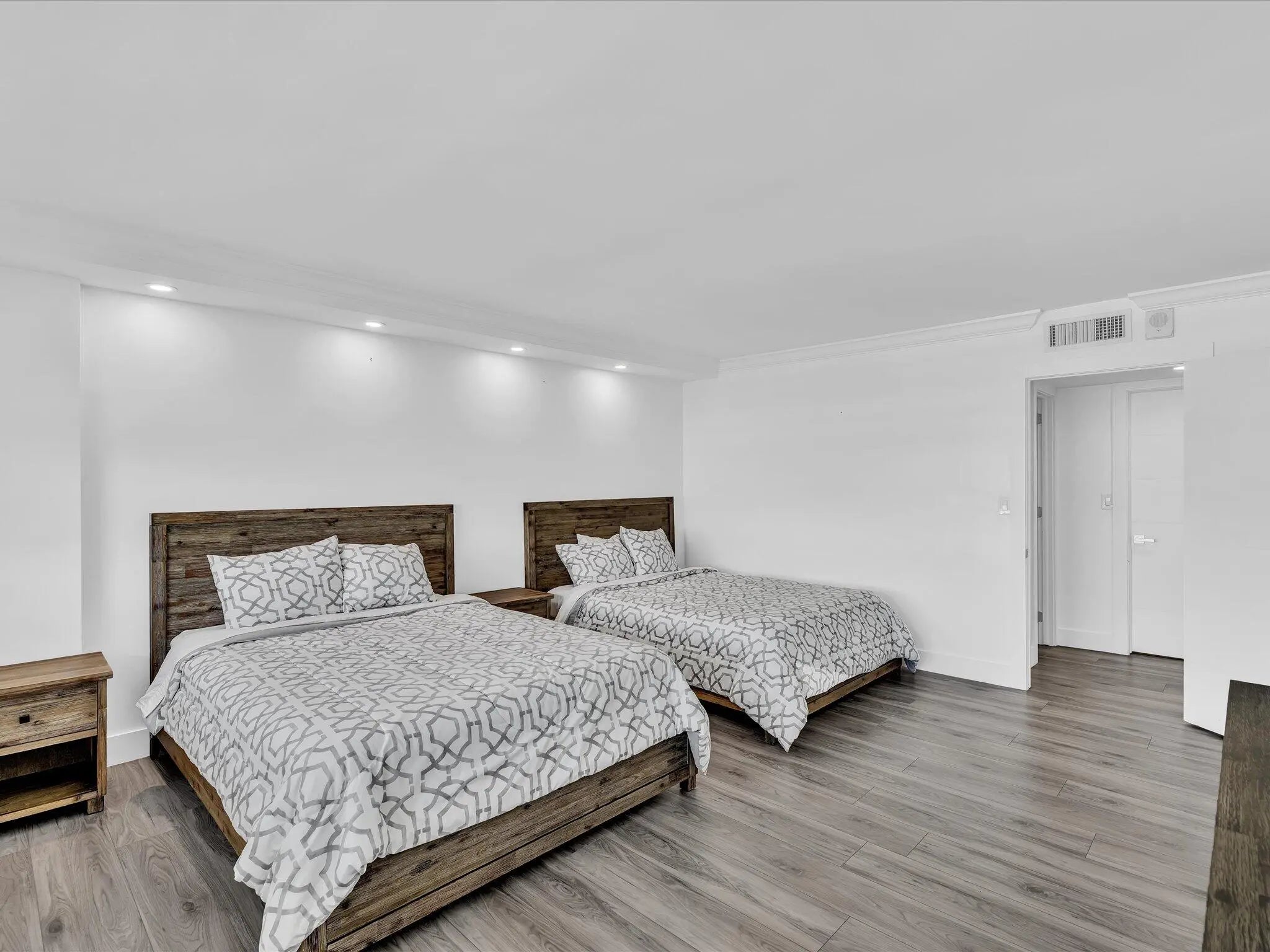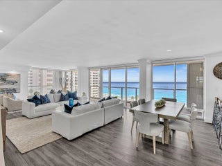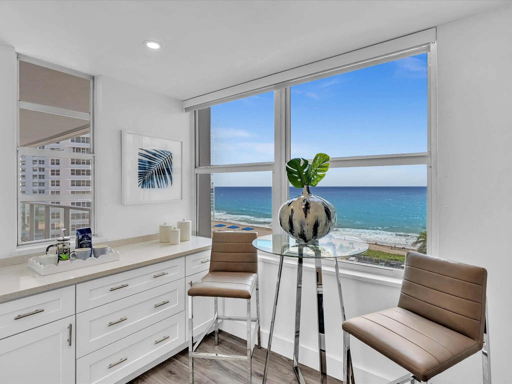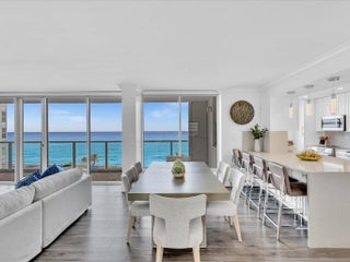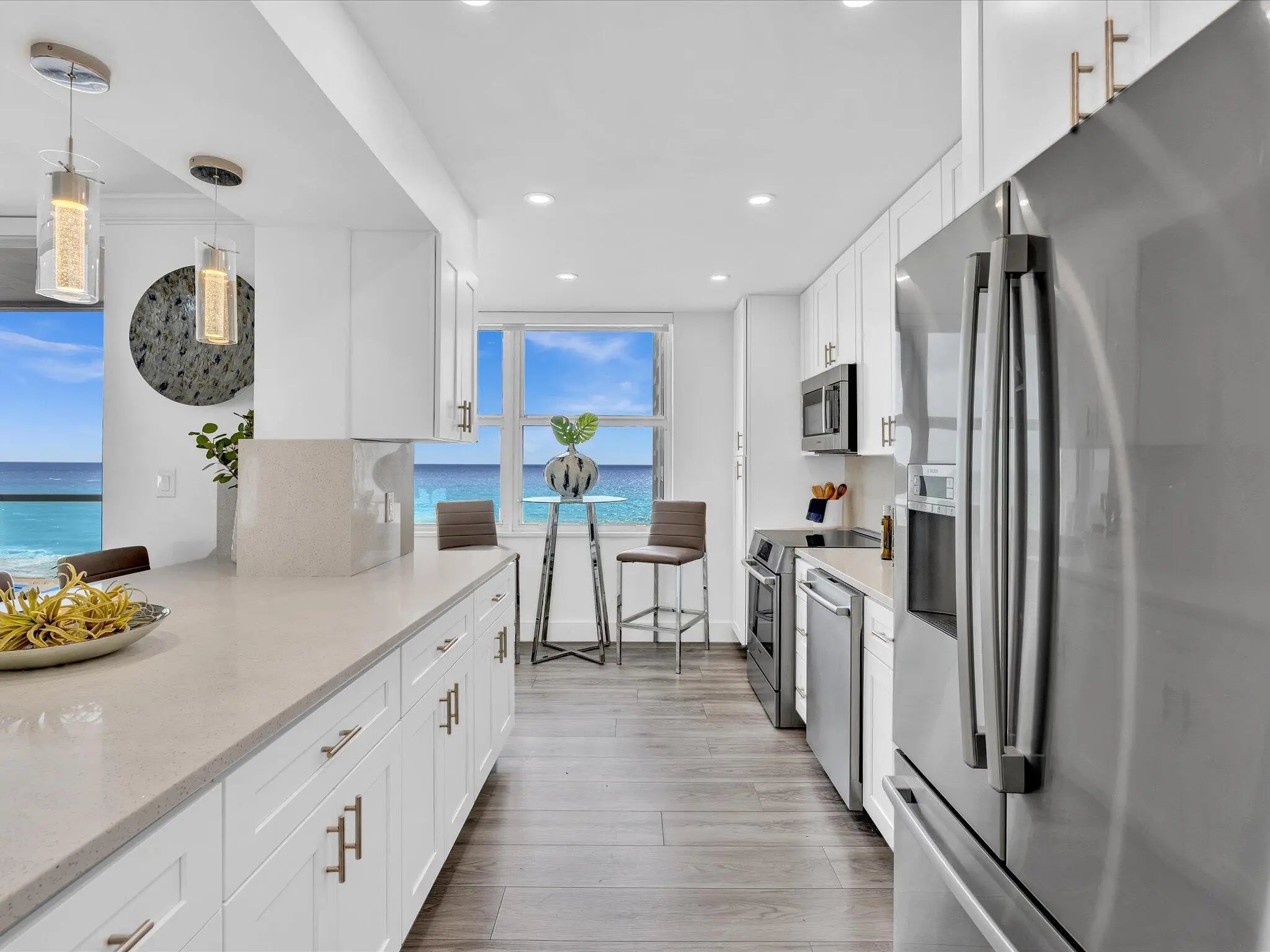 Experience over 2,000 square feet of direct oceanfront living in this beautifully renovated corner residence at Plaza East. This 3-bedroom, 2.5-bath home offers a bright, open layout with a semi-private elevator and stunning ocean views from the moment you enter. The modern kitchen features quartz countertops, shaker cabinetry, and Bosch stainless steel appliances, seamlessly connecting to the living and dining areas. Renovated bathrooms showcase high-quality finishes, while luxury vinyl flooring runs throughout. Accordion shutters provide added peace of mind. Plaza East offers resort-style amenities, a rentable guest suite, fully funded reserves, and completed 50-year recertification,SIRS and budgeted at full reserves. One of the few "vintage buildings" that is financially secure !