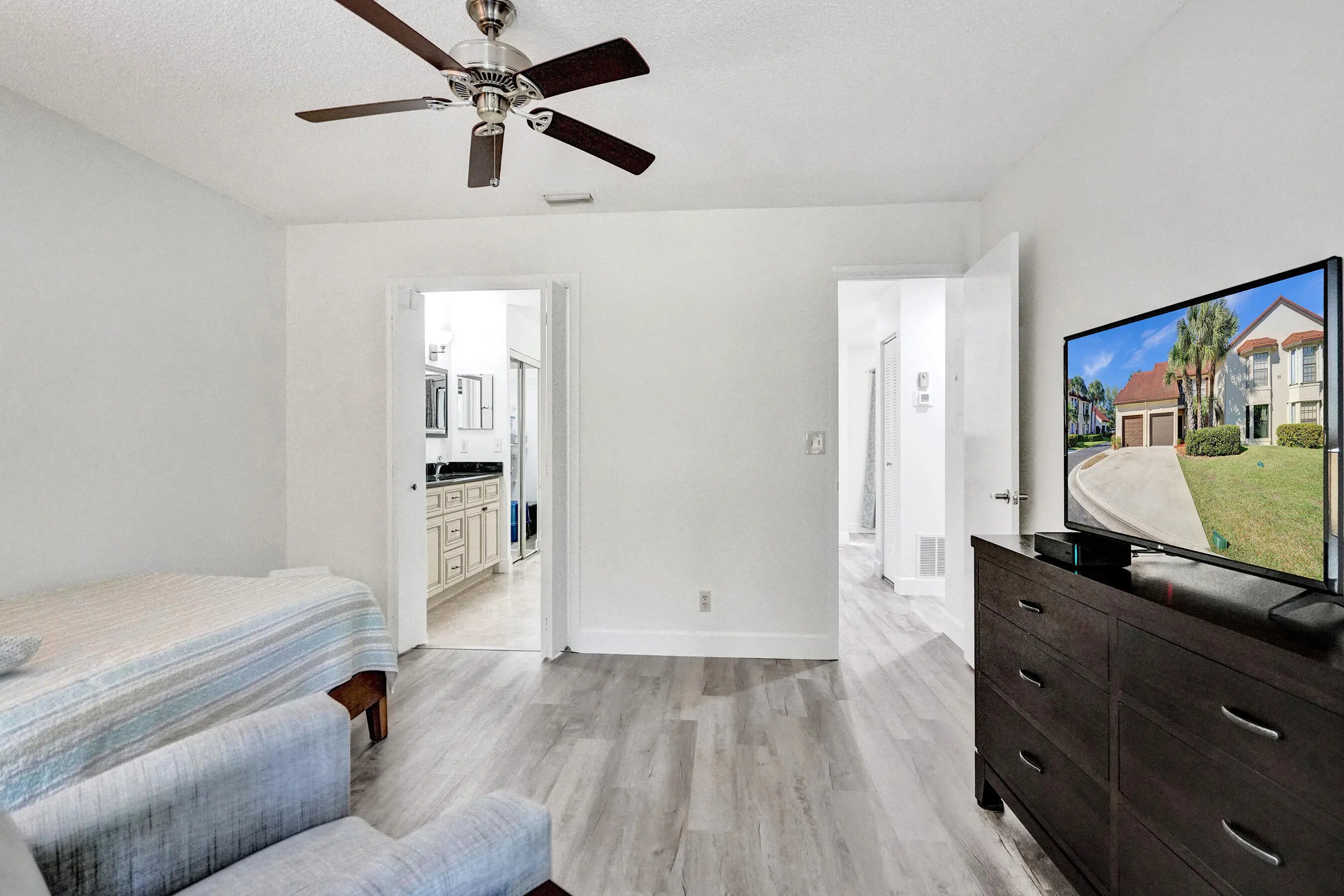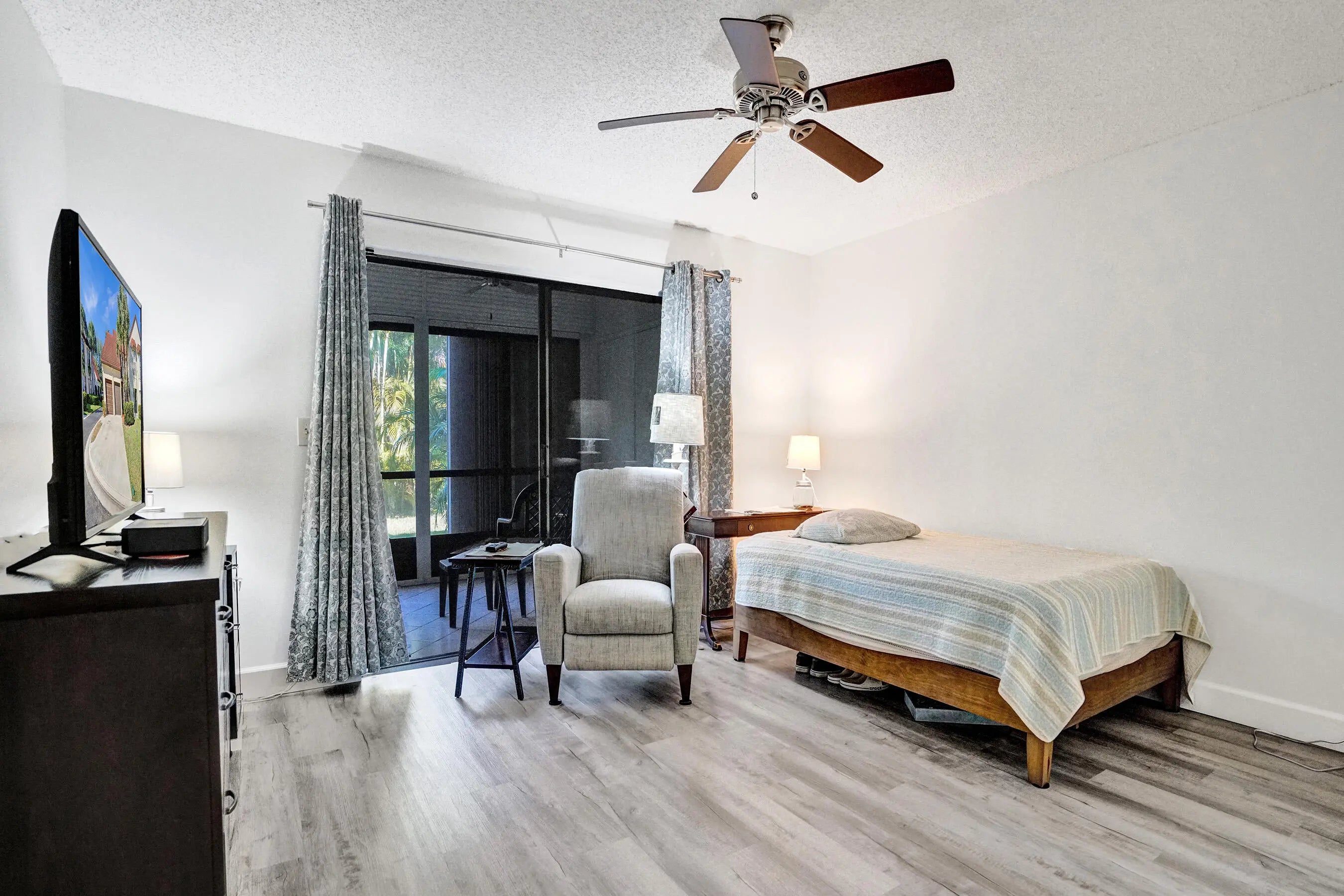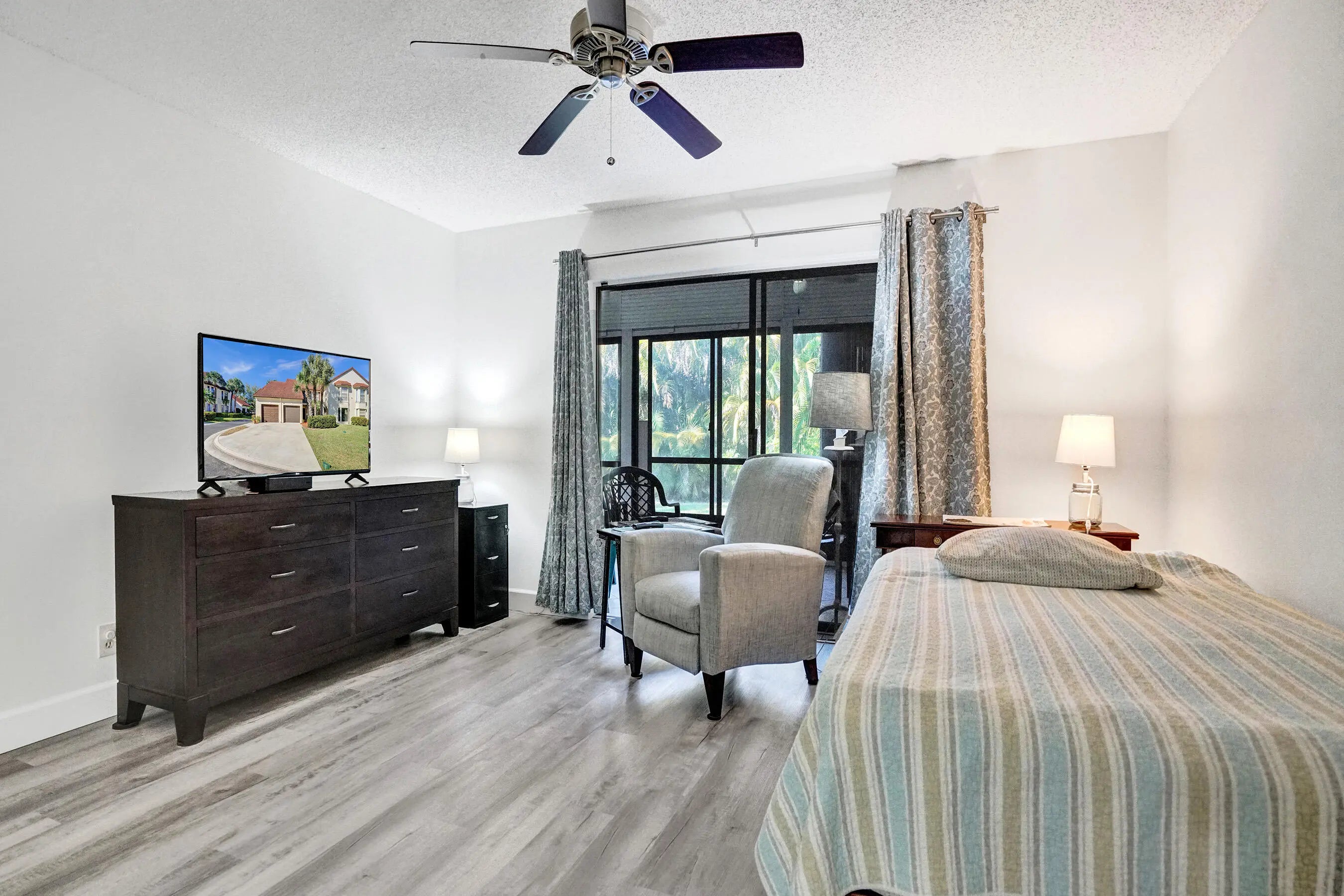 Welcome to this home in Greenacres—a vibrant active community where style, comfort, and peace of mind come together. This stunning 2-bedroom, 2-bath + den residence offers an expansive refined living space with a private entrance, tranquil garden views, and a one-car garage. Major upgrades are already complete, including a 2021 HVAC, 2022 hot water heater, and a long-life metal tile roof. Enjoy total storm protection with PGT impact, insulated, tinted windows, hurricane shutters, and a hurricane-rated garage door. Inside, every detail impresses—from sleek waterproof LVP flooring and fresh designer paint to a beautifully updated kitchen featuring granite countertops. The living and dining areas feel open and elevated, while both bathrooms have been luxuriously remodeled with new cabinetry, tile, and a redesigned master shower. Enhanced with new PEX plumbing, upgraded electrical, and thoughtful modern touches throughout, this home delivers effortless sophistication. Step outside to your private screened patio oasis with peaceful garden views—perfect for morning coffee or evening unwinding. The community elevates your lifestyle with a heated saltwater pool and meticulously maintained grounds, while small pets are welcome. Ideally located near shopping, dining, and major routes, this residence offers both convenience and exclusivity in one of the area's most desirable settings. Make this luxurious retreat your own and experience refined living in this exceptional residence.