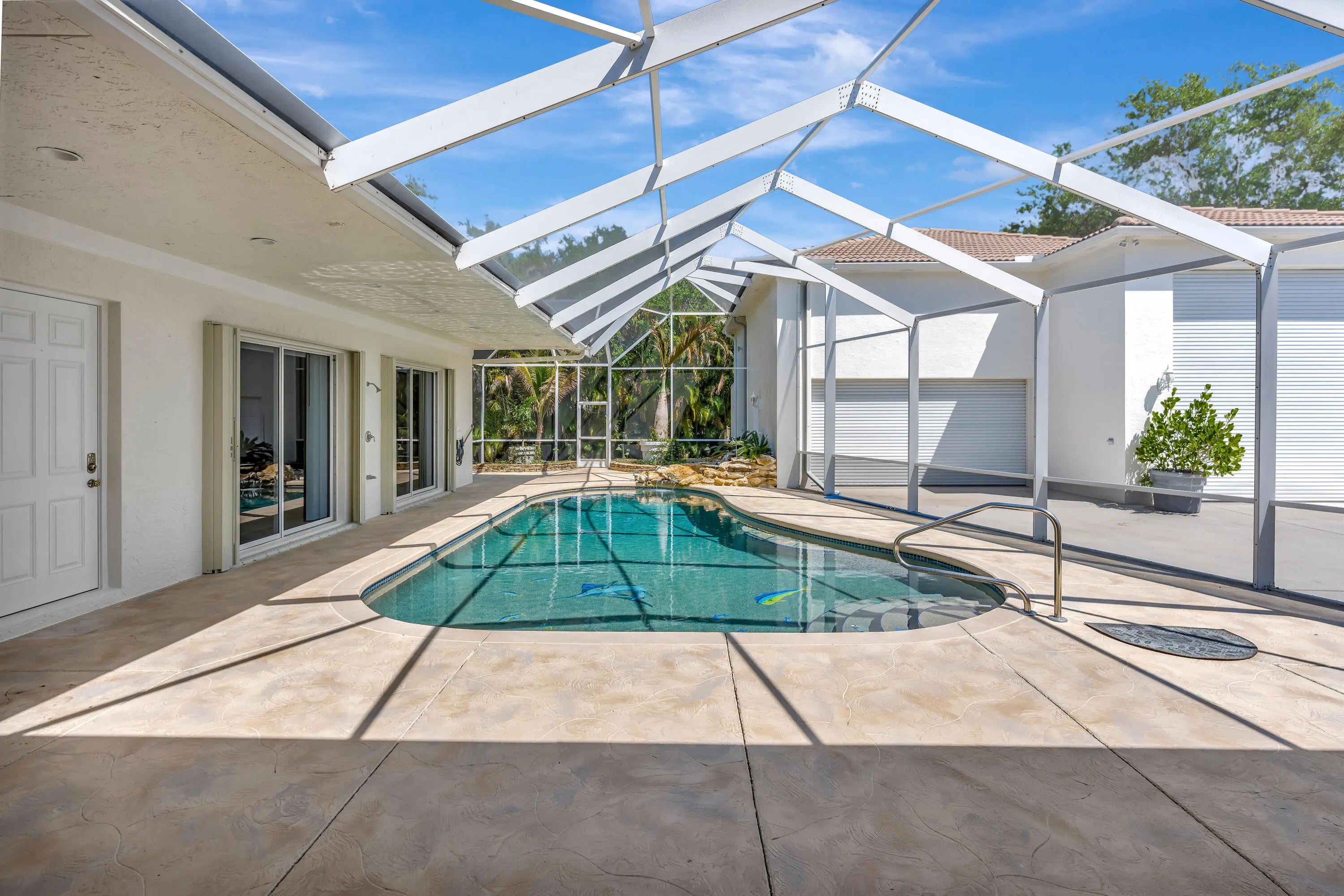 NO HOA! Welcome to this gem of a home - this rare 5-bedroom, 4-bathroom pool home in Hobe Hills offers exceptional versatility, including a private recreation suite or potential in-law quarters with its own entrance. Car enthusiasts and hobbyists will appreciate the attached 2.5-car garage plus an impressive 3-level, 6-car detached garage, offering approximately 1,400 sqft with an additional 1,500 sqft of storage (big enough to store boat or RV!). Built with concrete and steel I-beams, it accommodates (I repeat) up to 6cars, an RV, or boat, and includes 4 commercial roll-up doors, a trolley lift, and multiple 220V outlets. Built with solid poured concrete block construction, the home showcases soaring vaulted tongue-and-groove ceilings, custom trim and moldings, and skylights that flood the space with natural light. The expansive granite kitchen features a large bar, abundant counter space, top-of-the-line stainless steel appliances, a reverse osmosis system, and instant hot water throughout. The spacious primary suite is a true retreat, highlighted by a spa-like bathroom with a jetted tub, double shower, towel warmer, Grohe satin nickel fixtures, and an oversized walk-in closet. Tile flooring runs throughout the main living areas, with carpet in the bedrooms. A separate 38' x 15' wing functions as a recreation space complete with a full bath, easily convertible into a private guest suite or multi-room in-law quarters with direct pool access. Step outside to a screened, solar-heated pool with a tranquil waterfall feature and custom hand-painted mosaic tiles by artist Judy Nevins, all set within a lush half-acre lot. Additional features include a well water system, whole-house generator, security system, Ethernet wiring, satellite connections, central vacuum, intercom, propane tank, and hurricane shutters. This one-of-a-kind property combines space, function, and craftsmanship—truly a must-see for the most discerning buyer.
