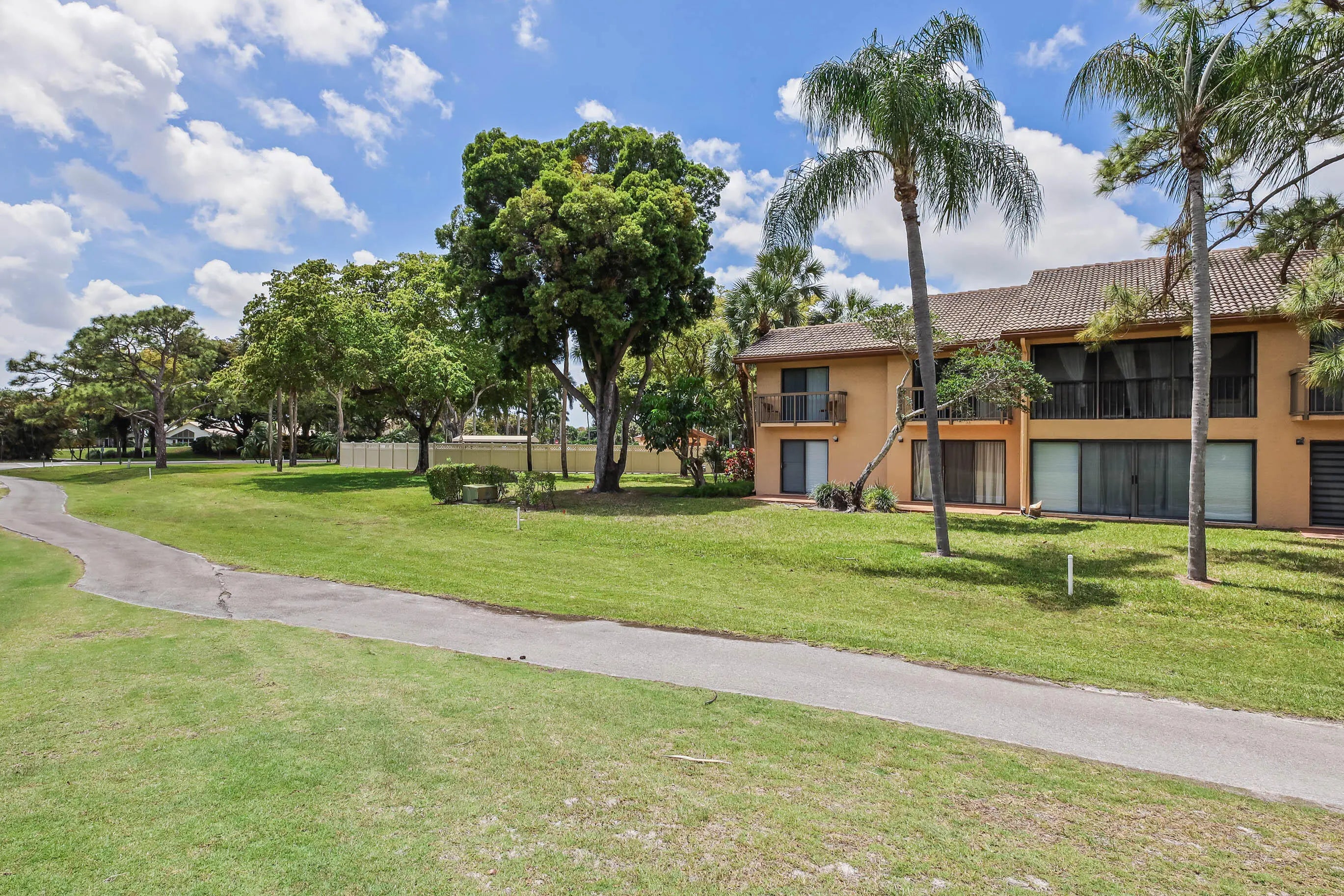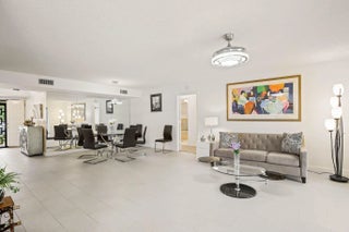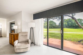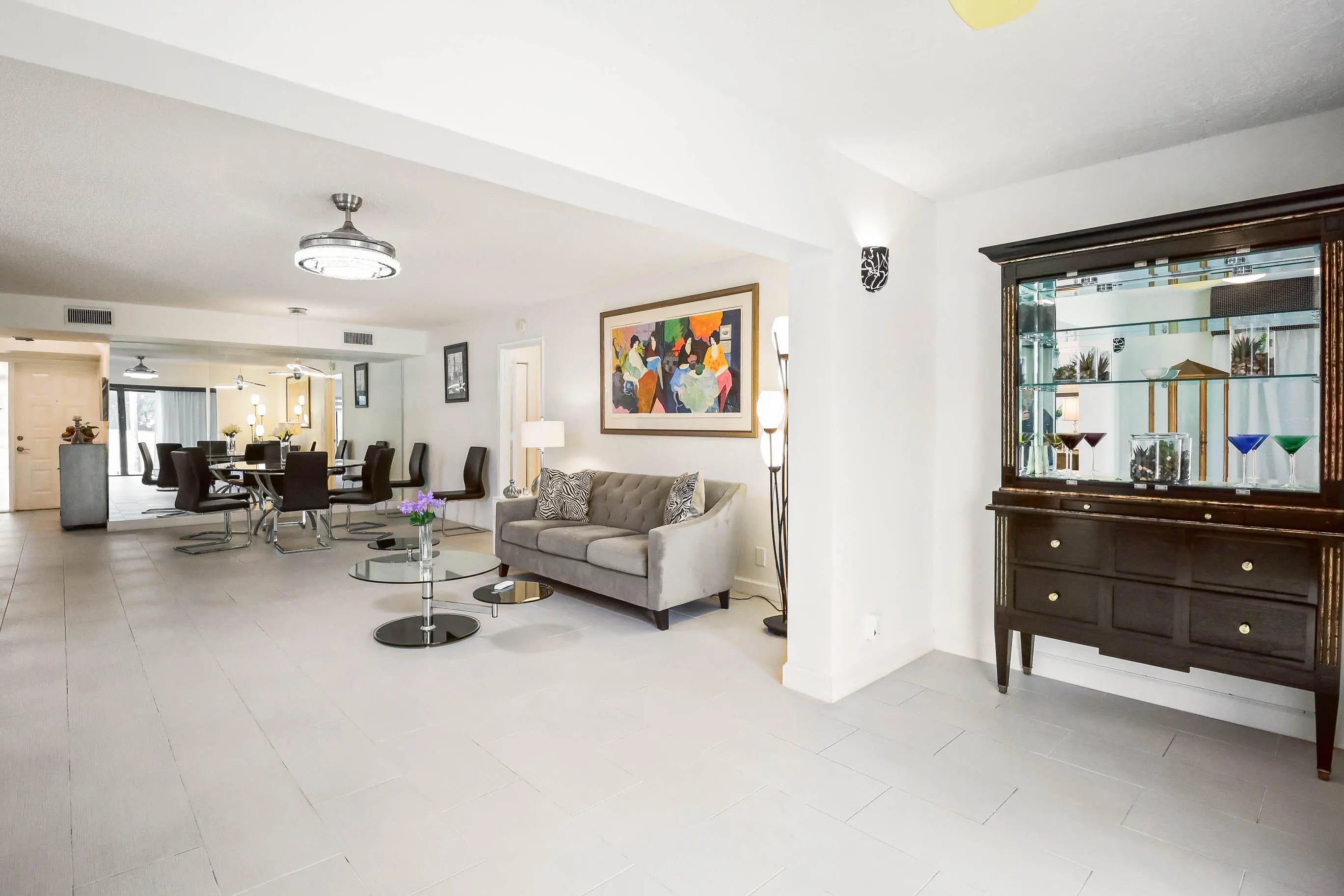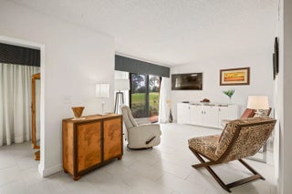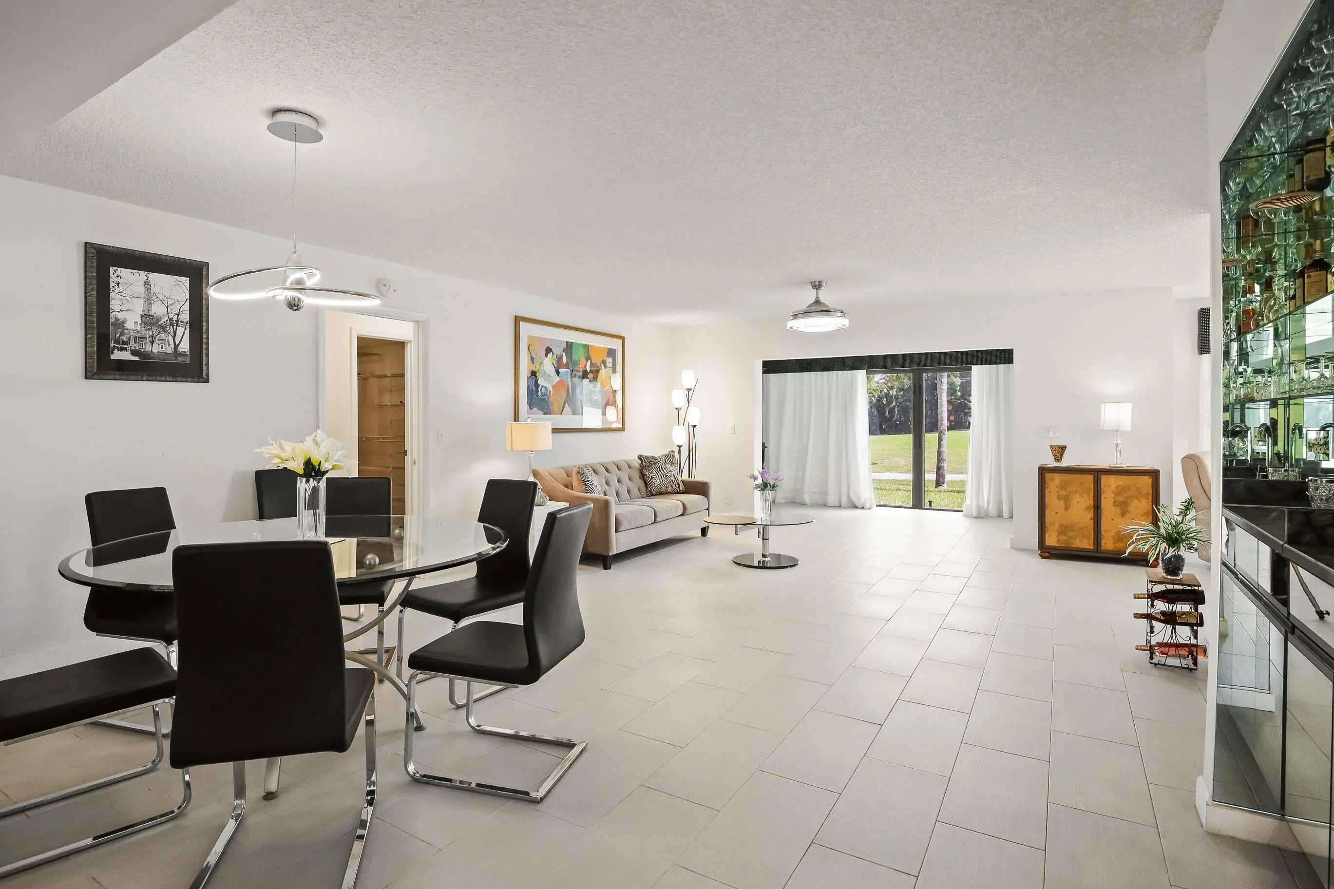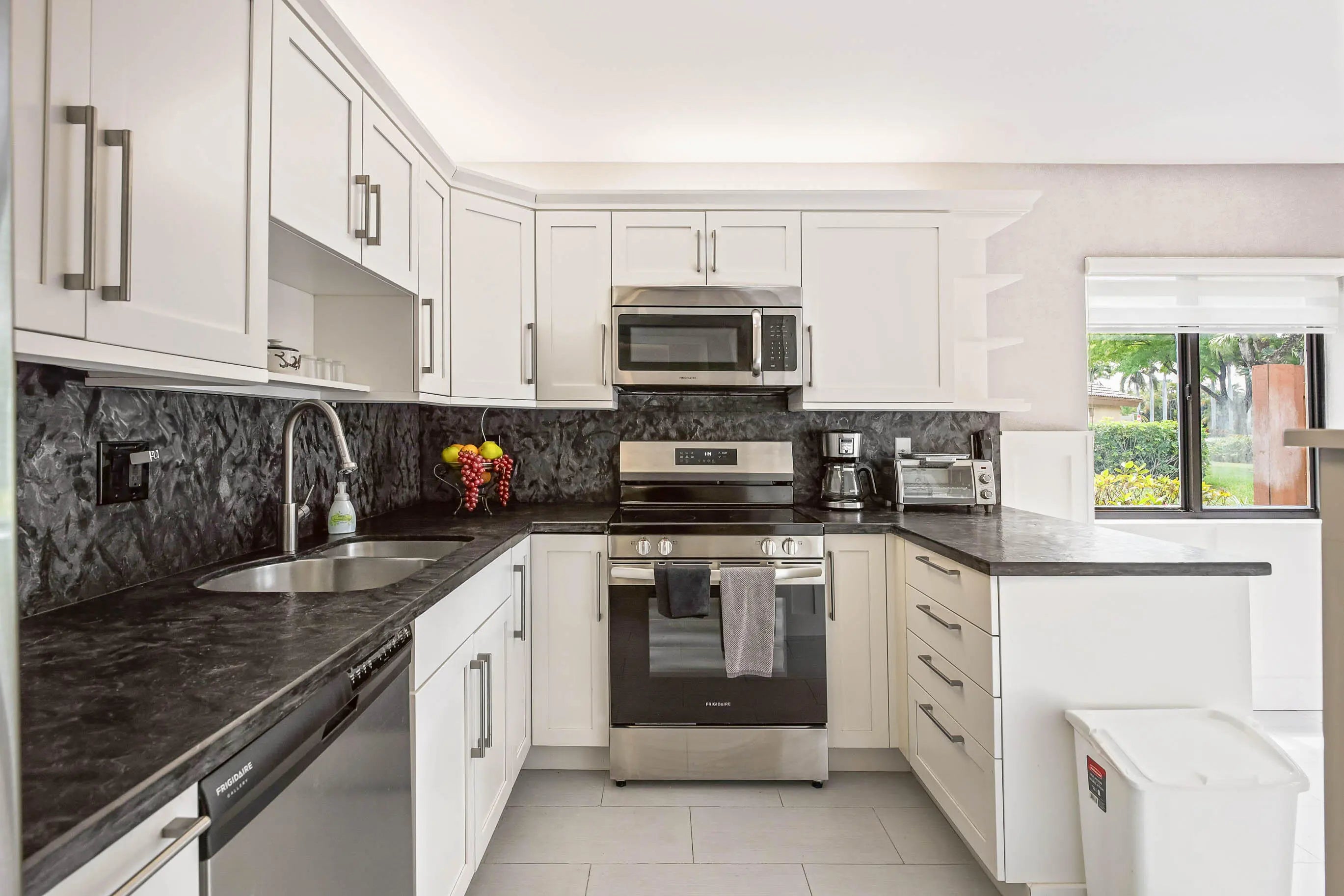 Updated 2-bedroom + den, 2-bathroom first-floor unit with golf course views. The home features a renovated kitchen with leathered granite countertops and stainless steel appliances, along with a breakfast nook area with custom wainscoting installed recently. Bathrooms have beautiful vessel sinks, marble countertops, and modern fixtures. Additional features include a tankless water heater, newer A/C, custom window treatments, and an in-unit laundry room. Enjoy two patios and extra living space throughout. The unit is being sold partially furnished for convenience. The den can be converted back into a third bedroom if needed. Located close to the community pool, this gated neighborhood offers manned security and 24-hour patrol. Conveniently close to the Florida Turnpike, I-95, shopping, dining, entertainment, airports, hospitals, and the beach.