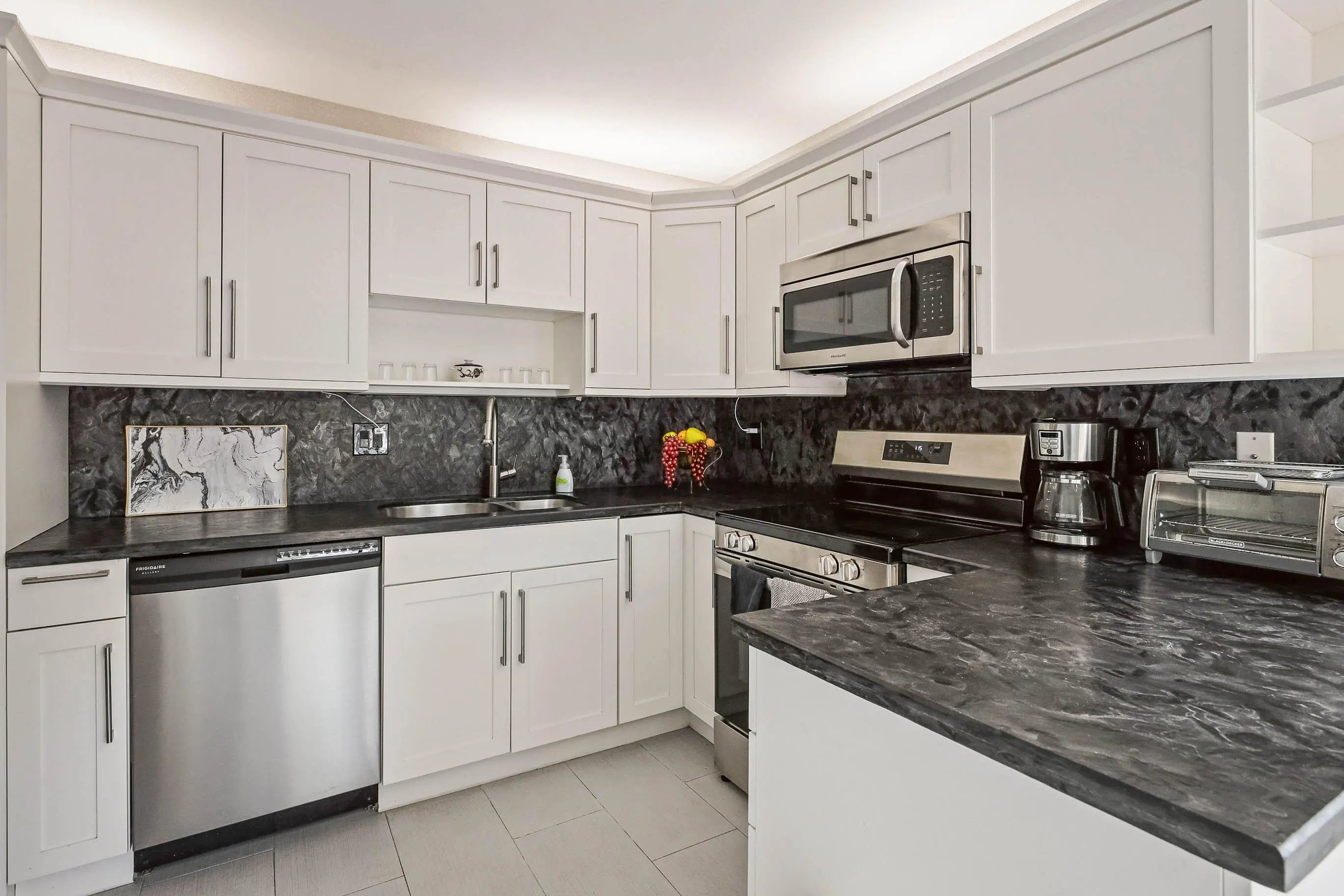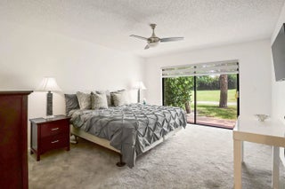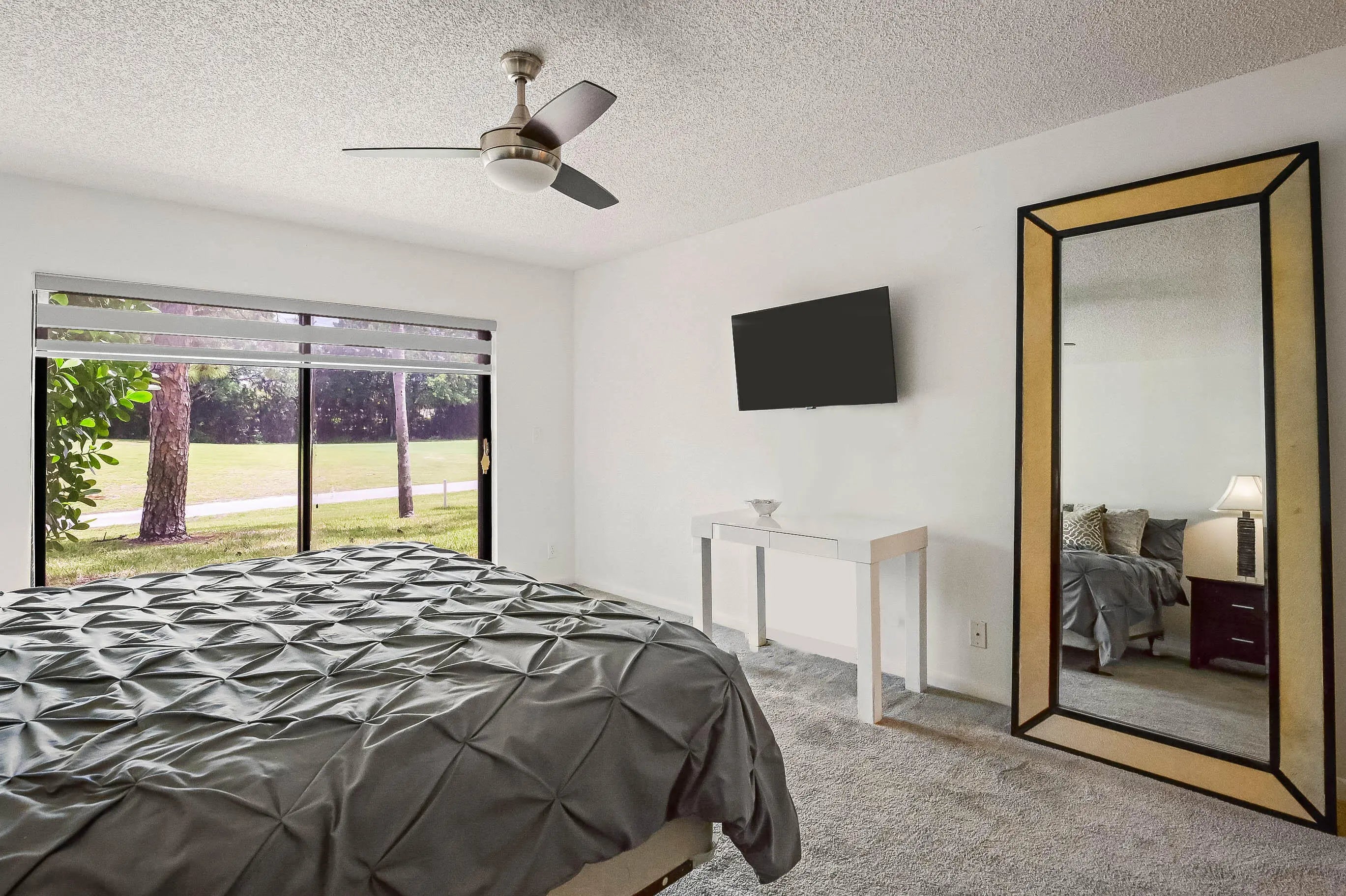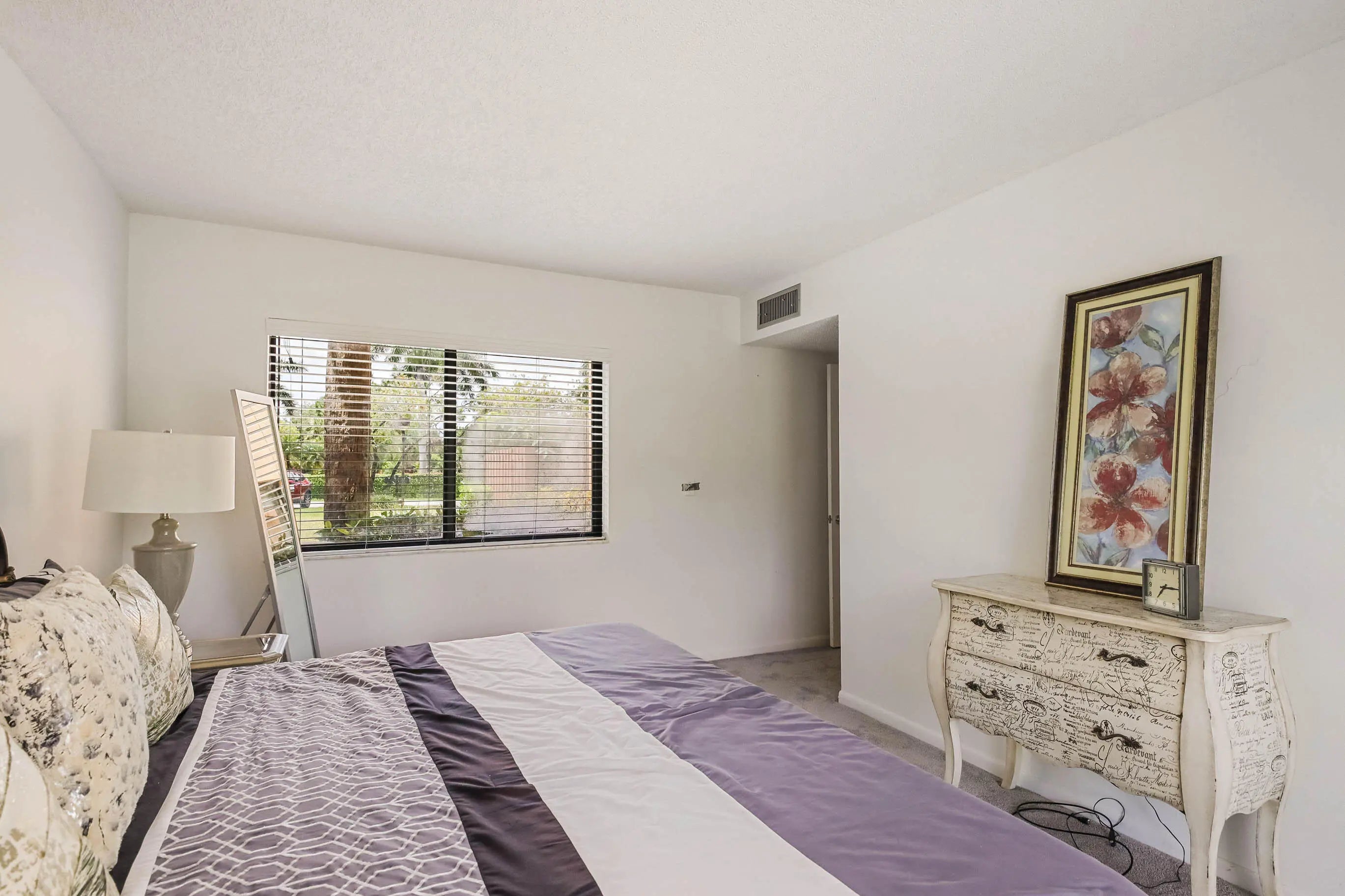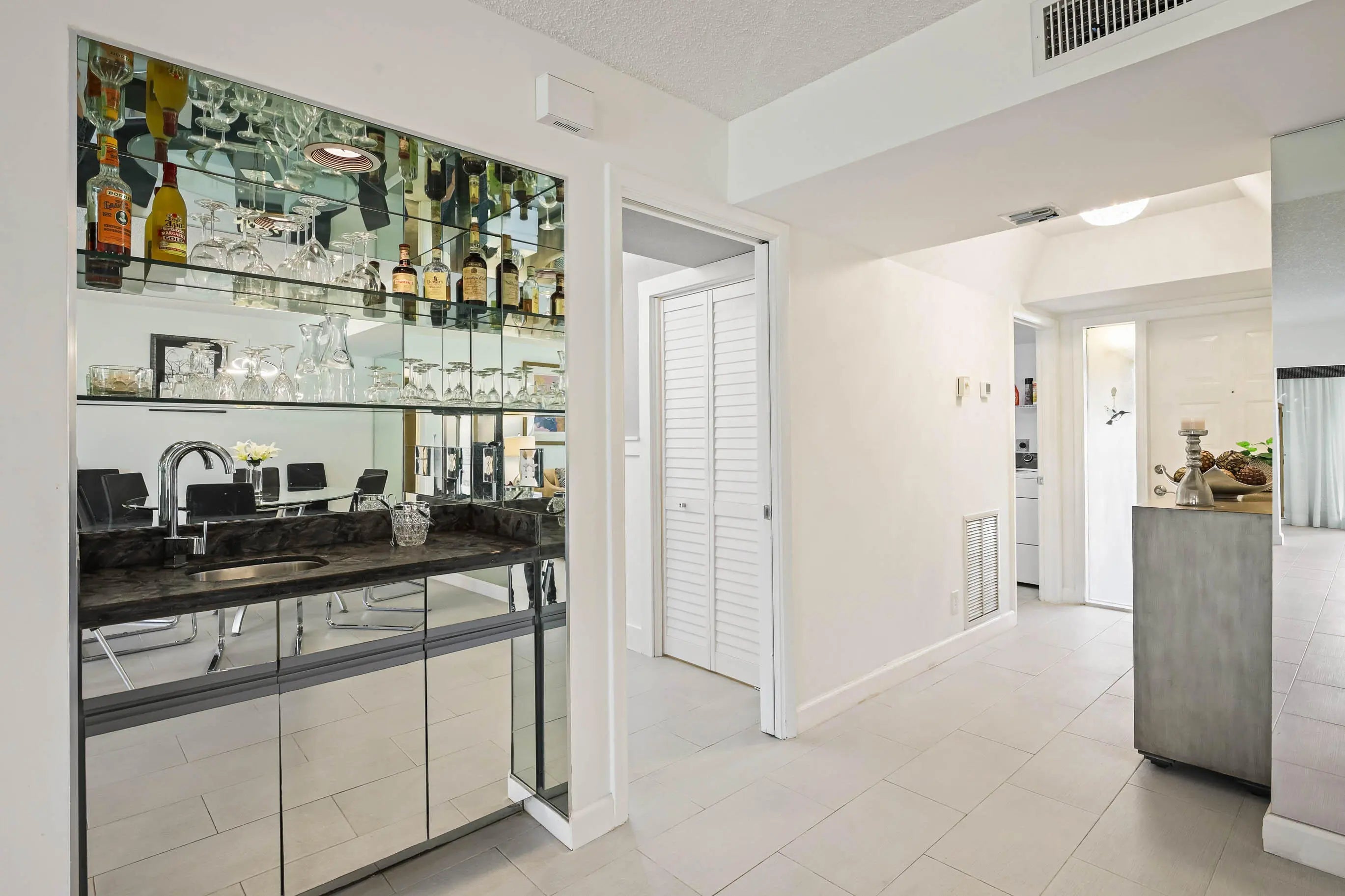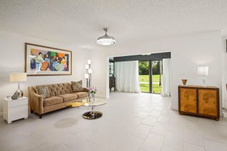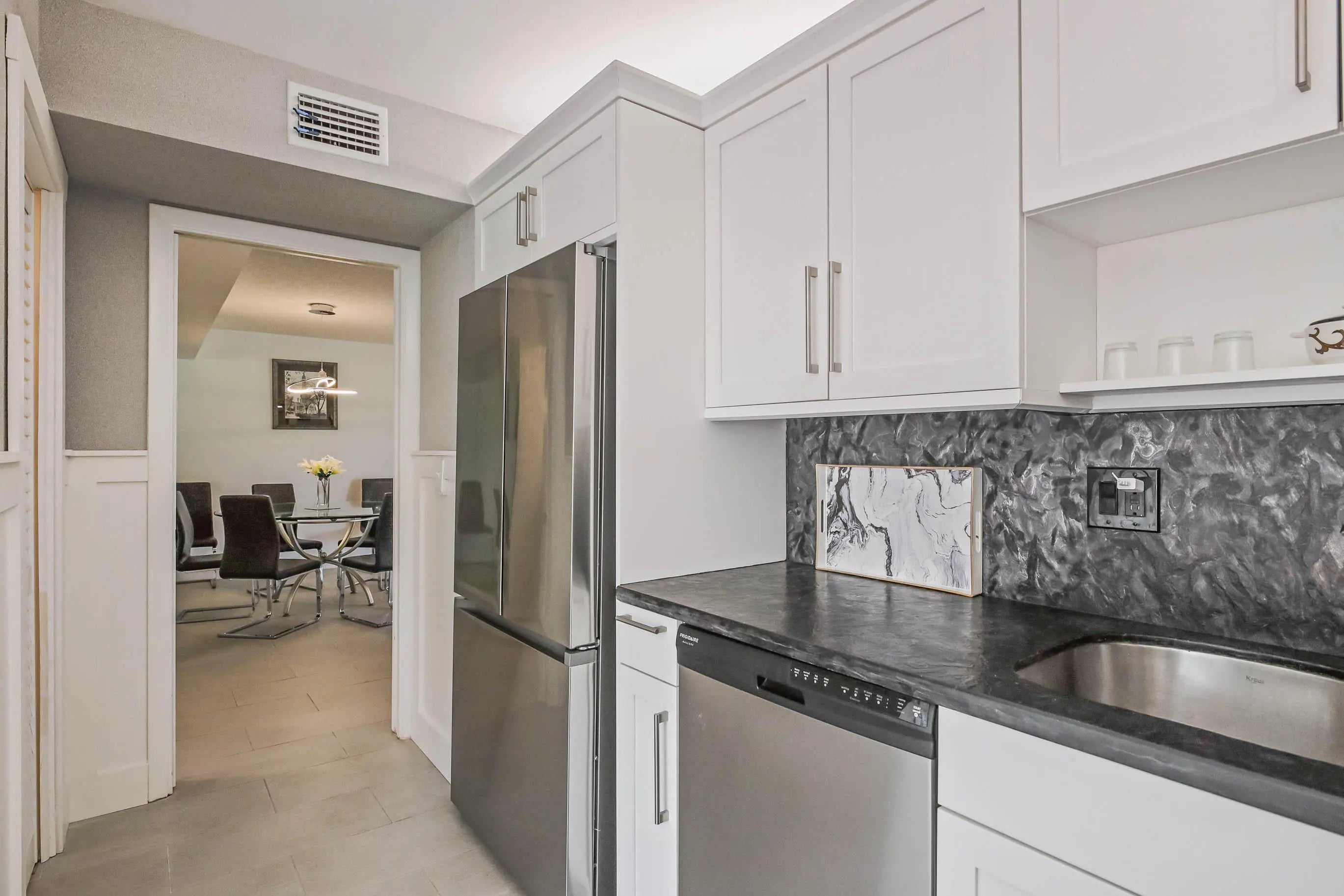 Updated 2-bedroom + den, 2-bathroom first-floor unit with golf course views. The home features a renovated kitchen with leathered granite countertops and stainless steel appliances, along with a breakfast nook area with custom wainscoting installed recently. Bathrooms have beautiful vessel sinks, marble countertops, and modern fixtures. Additional features include a tankless water heater, newer A/C, custom window treatments, and an in-unit laundry room. Enjoy two patios and extra living space throughout. The unit is being sold partially furnished for convenience. The den can be converted back into a third bedroom if needed. Located close to the community pool, this gated neighborhood offers manned security and 24-hour patrol. Conveniently close to the Florida Turnpike, I-95, shopping, dining, entertainment, airports, hospitals, and the beach.