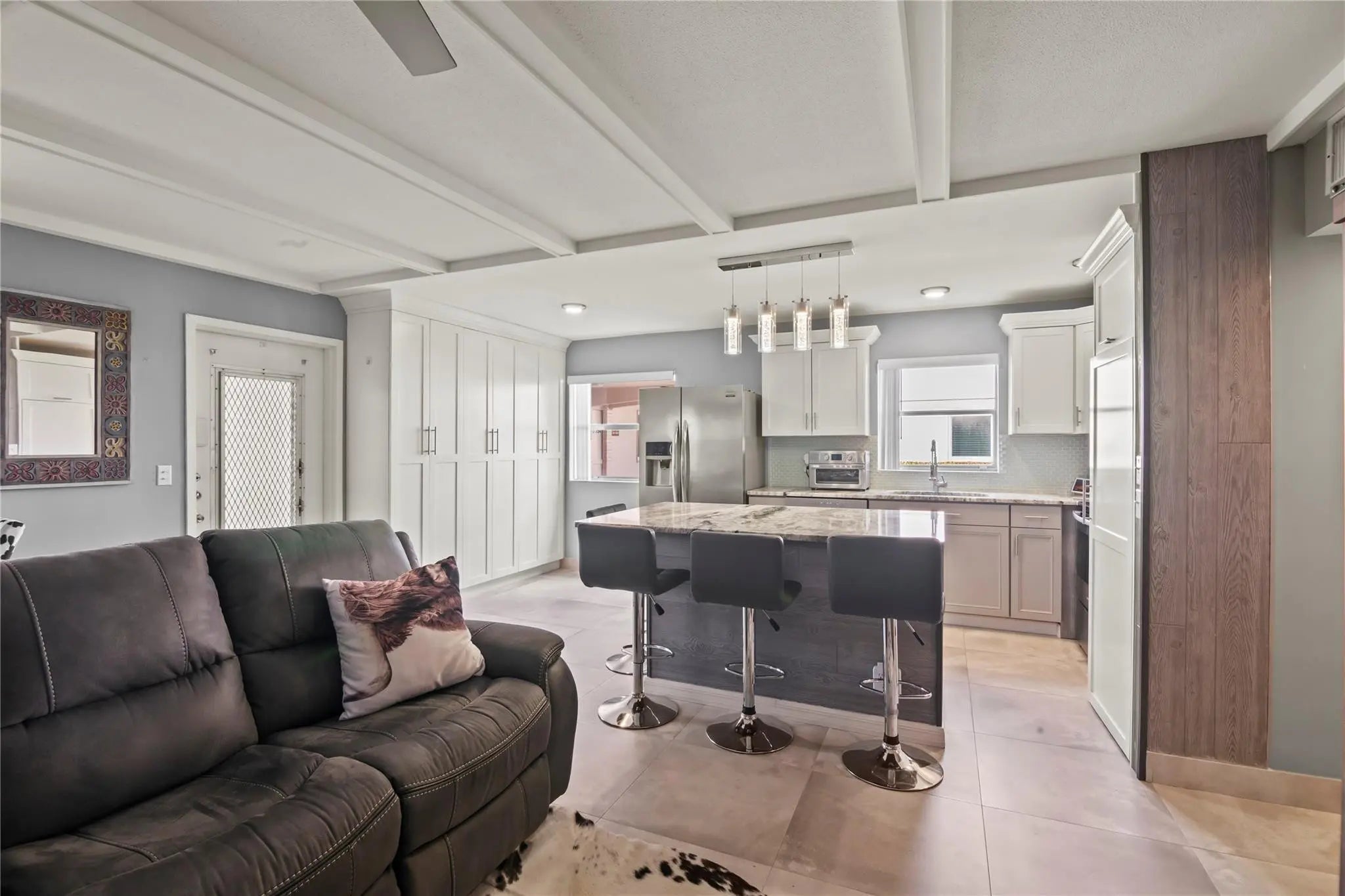 Gorgeous Remodeled First Floor Corner Condo in Kings Point, a desirable 55 Plus Guard Gated Community in Delray Beach. This modern Two Bedroom Two Bathroom unit has been completely updated with open concept chef's kitchen, granite countertops, cabinetry, stainless steel appliances, pantry & Island & brand new A/C unit! Spacious Living & Dining Room perfect for entertaining guests. Tile throughout the unit. Renovated Bathrooms have walk-in showers. Master Bedroom has Walk-In Closet. Large Florida Room has plenty of space for storage. Kings Point community offers many amenities: clubhouse, community pools, two restaurants, a theater, tennis courts, and a transportation system. Great location close to Atlantic Avenue, major highways and Delray beaches. Seller paid HOA fees through August!!