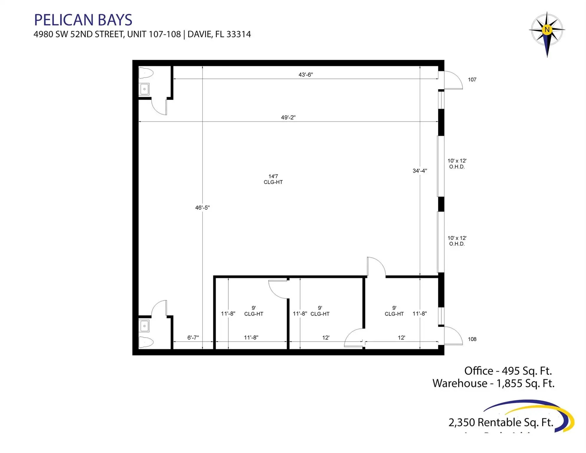 Pelican Bays is an 8-building warehouse complex located at SR 7 and SW 52nd St in Davie. On 1.5 miles from I-595, less than a mile from Turnpike, and adjacent to the Hard Rock “Guitar Hotel”, the industrial park spans 199,257 SF of flex, industrial and office space. The smallest office spaces at the property are 460 SF and the smallest warehouse spaces are 800 SF. Pelican Bays is an ideal location for auto dealers and related automotive businesses. Onsite management.