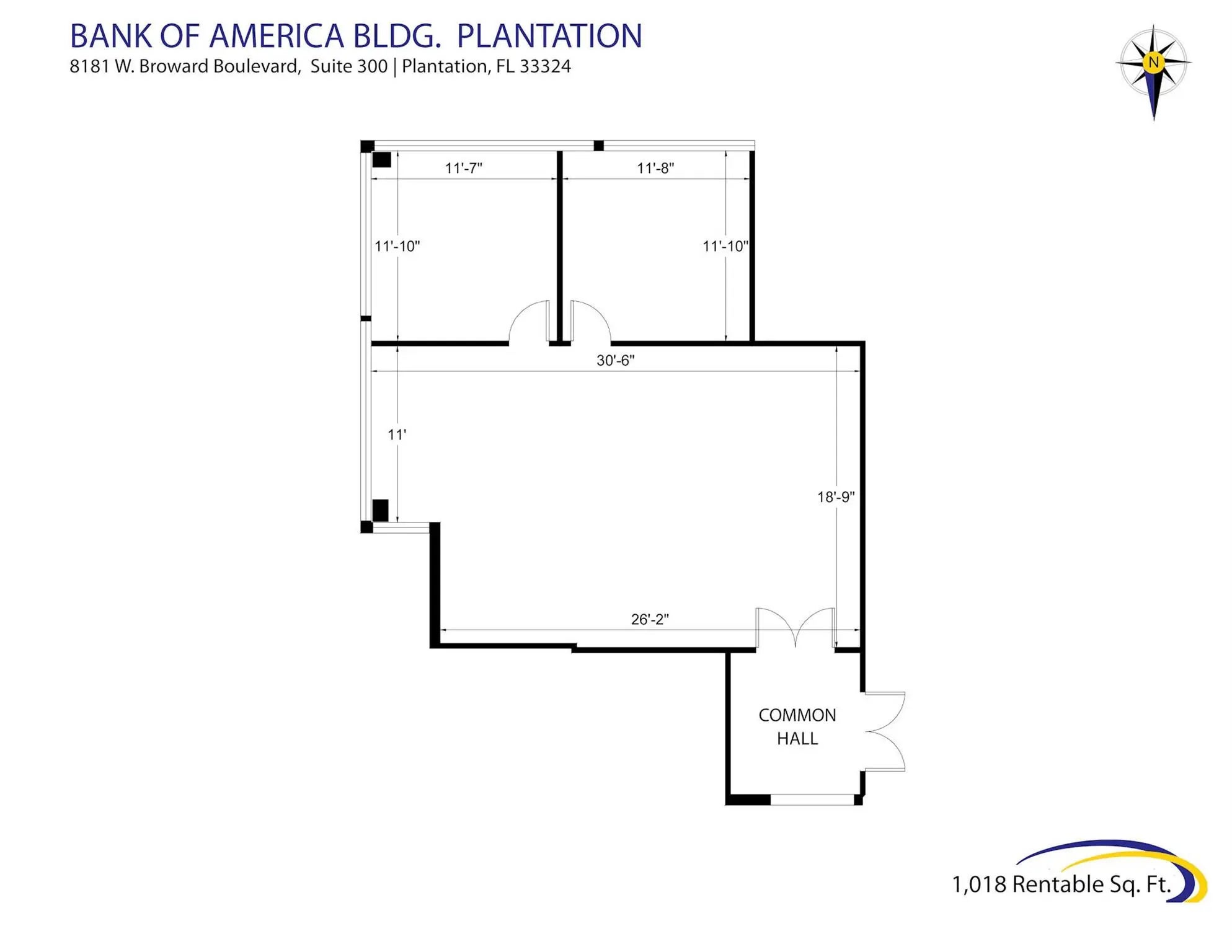 Built in 1984 and is a 28,000 square foot Class B+ Professional Office building located in the heart of the Plantation Midtown District just W of University Dr. and Broward Blvd in Plantation. The property has frontage on Broward Boulevard at a signalized corner with excellent access to the I-595 highway, proximity to restaurants and other amenities, such as the Westfield/Broward Mall, Planation Walk, the West Regional Courthouse, and Westside Regional Hospital. The property is a full-service building with electric and janitorial included and the office suites range in size from 1,500 square feet up to approximately 3,000 square feet. The property has a parking ratio of 4 spaces per 1,000 square feet of building area. The property is zoned M-PM for Master Plan Zoning Mixed Use.