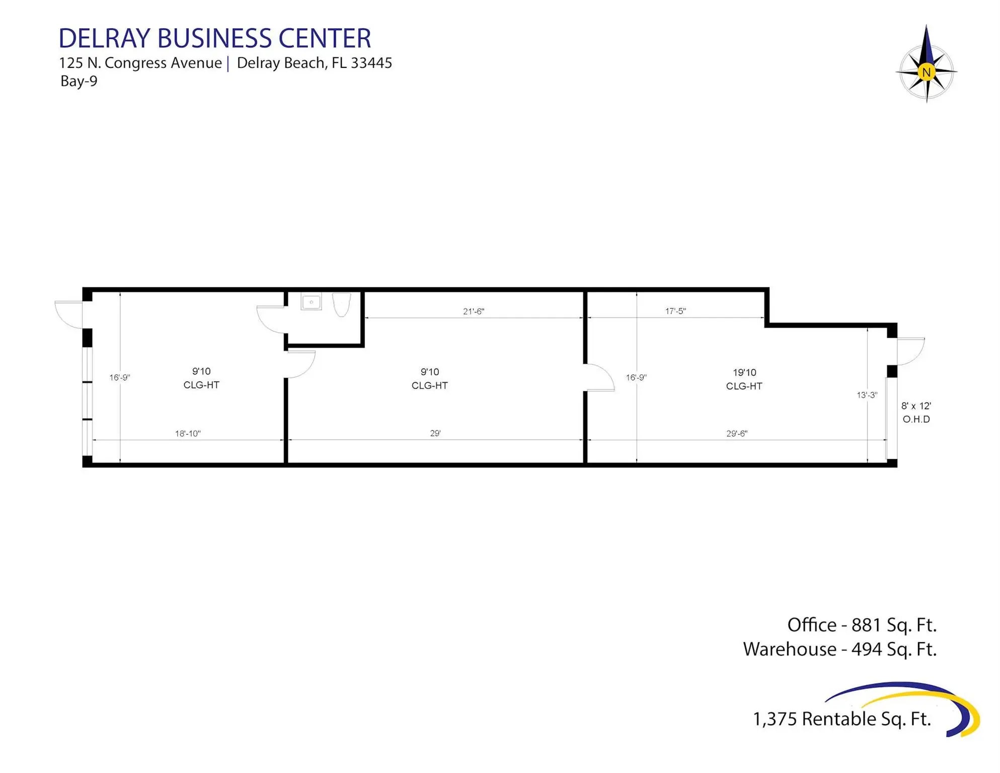 Built in 2000 and zoned MIC for Light Industrial and Commercial use. The property measures 24,803 SF and is on 2.2 acres. Tenants have excellent visibility on Congress Ave and are j1/2 mi from I-95 and Atlantic Ave; Turnpike is accessible from Atlantic Ave. The construction is concrete block and unit sizes range from 1,350 to 5,500 SF. This is a single-story commercial building, 10 bays with offices and warehouses. 20 foot ceiling and electrical service is 120/208 VAC, 3-Phase electric. The office and showroom entrances have a glass storefront look with aluminum framed windows. Many units have air conditioning in the warehouses. Each bay has oversized 10’ x 12’ grade level doors in the rear. Parking ratio of 3.6 spaces per 1,000 SF. The building shares one 675 SF gated loading dock.