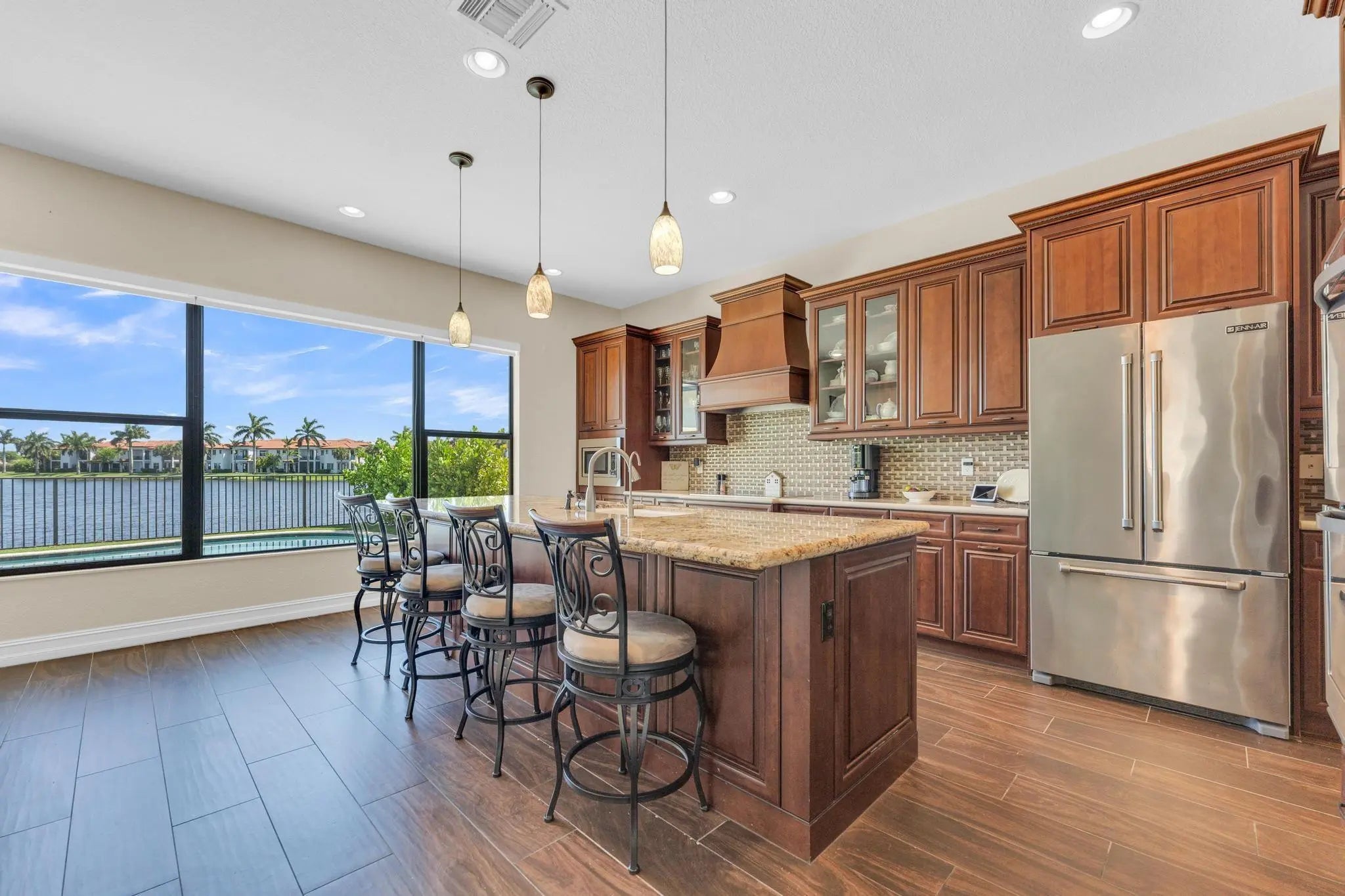 Live the South Florida lifestyle in this stunning lakefront estate—the largest model in Pembroke Pines’ exclusive Raintree community. This elegant 5-bed, 4.5-bath residence features soaring ceilings, a bonus upstairs den, & rare expansive 3-car garage. From the upgraded hardwood staircase, impact windows & porcelain tile floors, every detail exudes quality. The beautiful gourmet kitchen boasts an oversized island, induction stove & top-of-the-line stainless-steel appliances. The luxurious primary suite includes French doors, dual walk-in closets, and spa-inspired finishes. Entertain guests & relax poolside in your private retreat w/ serene lake views & AstroTurf yard. Raintree is an immaculate gated community w/ 24-hour security, a community pool, fitness center and clubhouse facilities.
