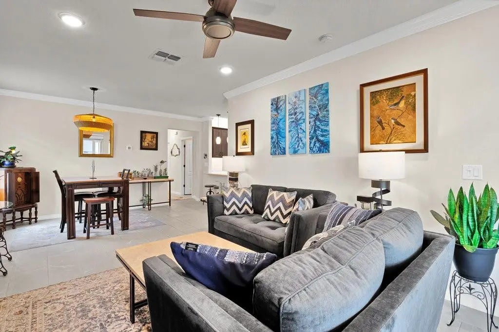 Harmony Reserve, a resort-style 55+ highly sought-after community featuring a fabulous clubhouse, pool, pickleball, fitness center, social events, etc. This 1,458 sq ft, 2-bed-2-bath + FLEX/Office home offers upgraded tile floors, entertainment kitchen w/ quartz counters, wood cabinets, backsplash, pendants, pantry, SS appliances, nat. gas cooking, snack bar. The large main bedroom has a walk-in closet, walk-in shower. Home finished with Recessed lighting, tankless WH, impact windows, 1-car garage w/storage closet & epoxy floors. Screened covered paver lanai with extension and view of pond. HOA incl roof replacement, exterior paint & power washing.