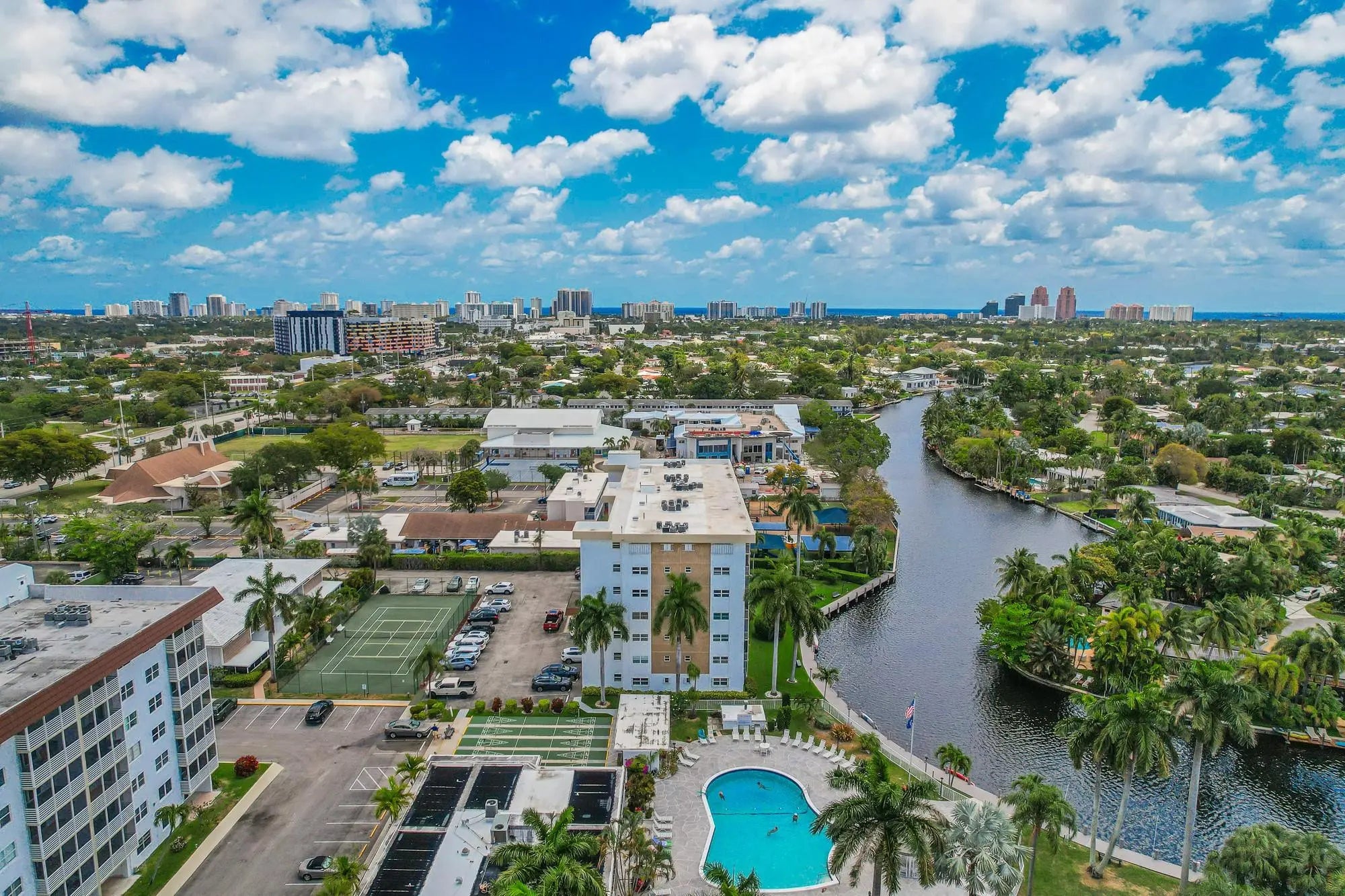 Overlooking the Middle River with views of downtown Ft Lauderdale and the pool is this oversized corner fourth floor condo with windows on three sides offering an abundance of natural light. New ceramic flooring throughout, new baseboards, stainless steel appliances in kitchen (2022), AC (2022), Hot water heater (2022). Screened in balcony off of the living room and primary bedroom with sweeping views of the river and slyline provide the perfect respite for your morning cup of jo. Convenient location close to the beach, downtown, and Wilton Manors. The community offers an array of recreational facilities including a waterside pool, tennis courts, ,fitness center and shuffleboard. 40 year certification complete.