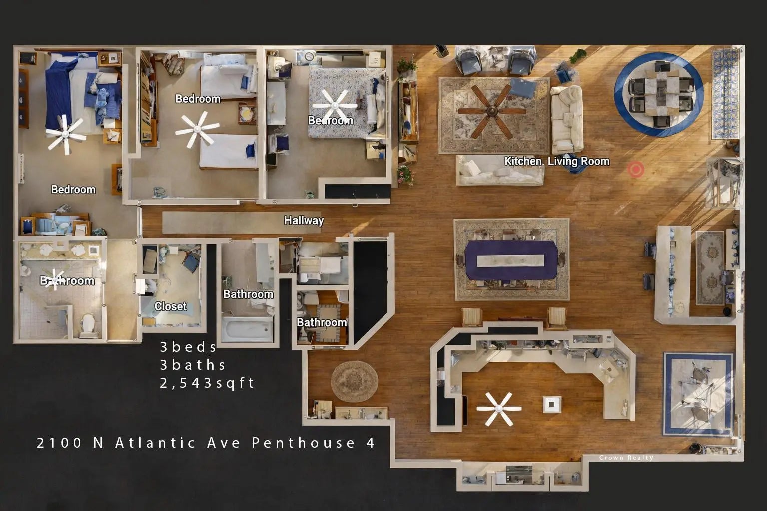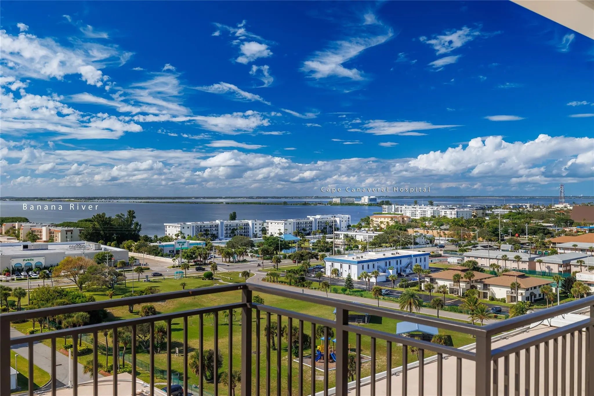Experience luxury coastal living in this rare, renovated penthouse at the iconic 2100 Tower in world-famous Cocoa Beach. This spacious 3-bedroom, 2.5-bath residence offers 2,543 sq. ft. of refined comfort with sweeping ocean and river views from every room. Enjoy breathtaking sunsets and rocket launches from the wraparound balcony. Upgrades include stainless steel appliances, custom cabinetry, luxury title floors, and two new HVAC units. The secured building offers resort-style amenities—private beach access, heated pool, fitness center, tennis and pickleball courts, clubhouse, and grilling area. Perfectly located next to Sidney Fischer Park and across the street from Publix, shops, and dining, this residence blends elegance with convenience. Less than an hour from Orlando Airport.