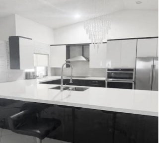 Stunning modern-style home, completely move-in ready. This spacious and well-designed 3-bedroom, 2.5-bath home has been beautifully updated and is ready for your private viewing. All three bedrooms are generously sized, including a large master suite. The fully renovated European-style kitchen features 43-inch two-tone glossy wood cabinets and Italian white quartz countertops, offering a sleek and modern aesthetic. Bathrooms have been upgraded with glass tile finishes and porcelain wall-to-wall accents, creating a luxurious spa-like atmosphere. The home boasts 32x32 Alaska White polished porcelain flooring throughout, providing a clean, cohesive, and elegant look. Additional highlights include two extended living rooms, perfect for entertaining and relaxation, 2 convenient car garage. FYI: The home features a new roof installed in 2018. Both living rooms have been upgraded with polished porcelain flooring, glass tile accents, and LED light chandeliers, creating a clean, modern, and futuristic style—consistent with the fully renovated bathrooms as well.
