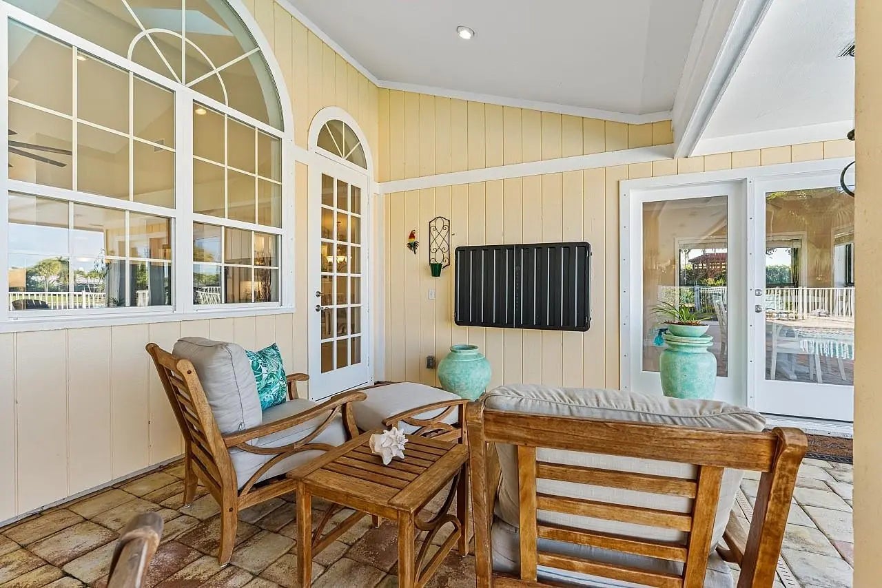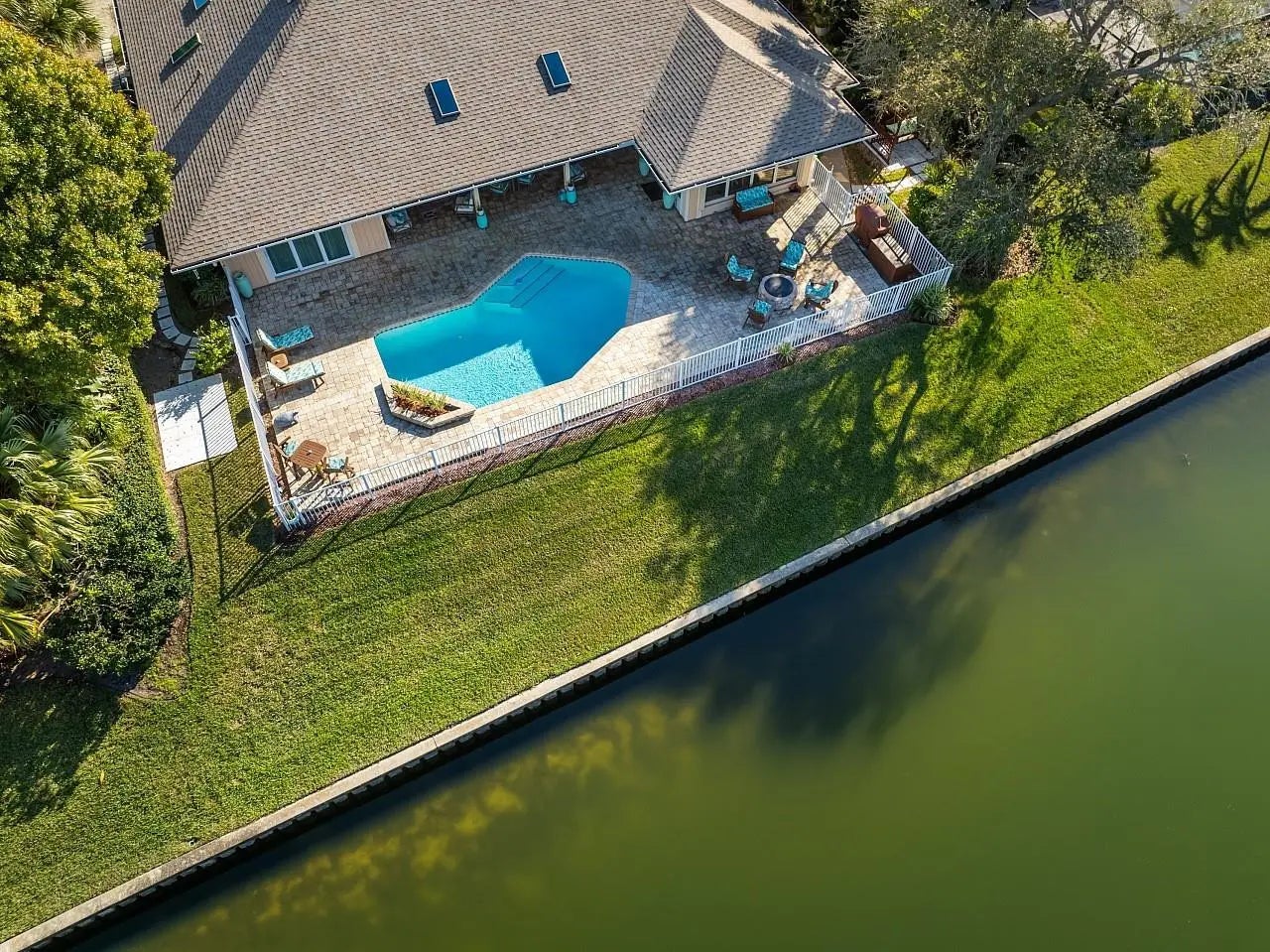Cache Cay. Over 3,000 square feet of updated living space in this gated island community just minutes from the beach and Ocean Drive. Inside, enjoy an indoor stone fireplace and a spa-like primary suite with soaking tub, walk-in shower, double vanity, and an oversized walk-in closet fit for a queen. The kitchen features a gas range, coffee bar, and top-of-the-line appliances. Outdoor living shines with a pool, fire pit, covered dining area with TV, and a loveseat swing overlooking the lake. Huge laundry room and newer roof. Updated homes this close to Central Beach are rare.