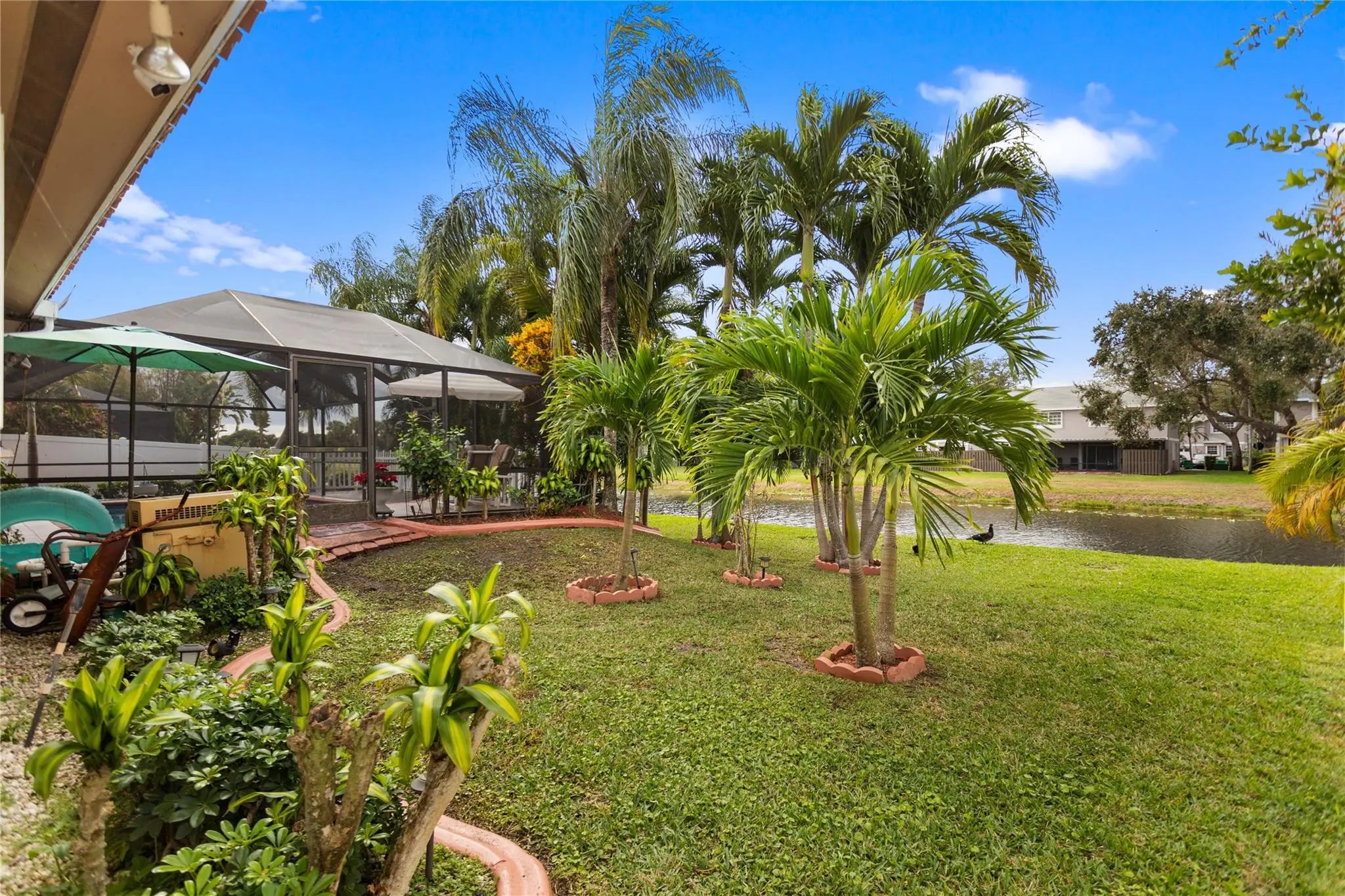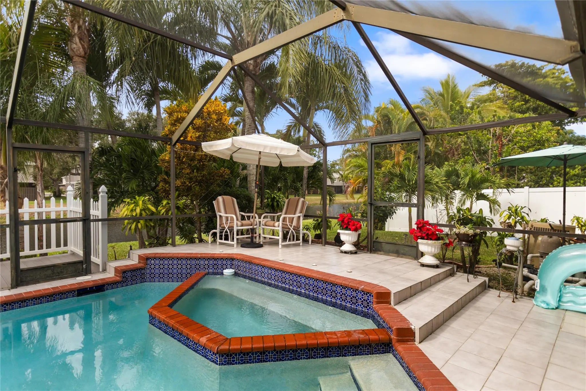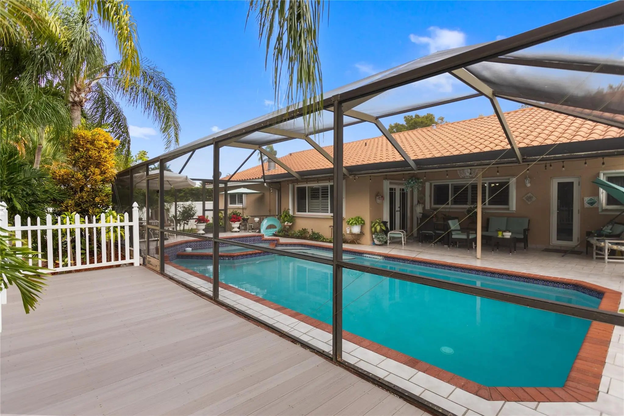 Beautiful cozy 3-bedroom 2-bathroom pool home, lake front with a new gorgeous deck, 2-car garage, and large drive-through with stunning landscaping, one of the largest lots in the neighborhood with gorgeous fruit trees, high ceilings, and recently installed Impact Windows, open living areas, and direct access to the pool and patio for family entertainment with a lot of privacy.Located in a desirable neighborhood with no association.