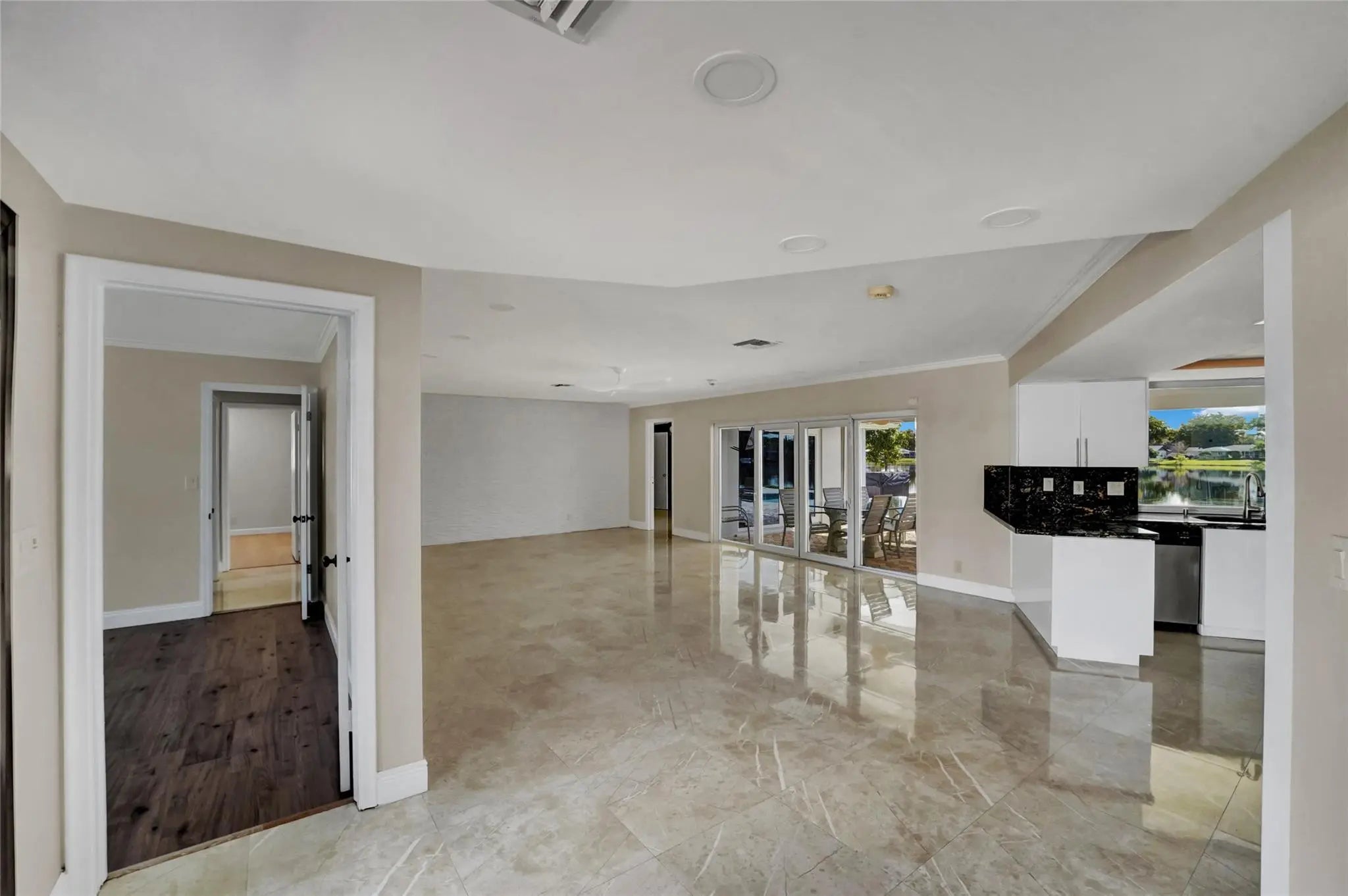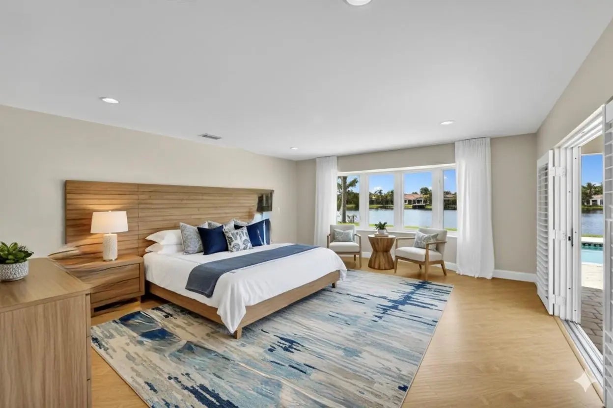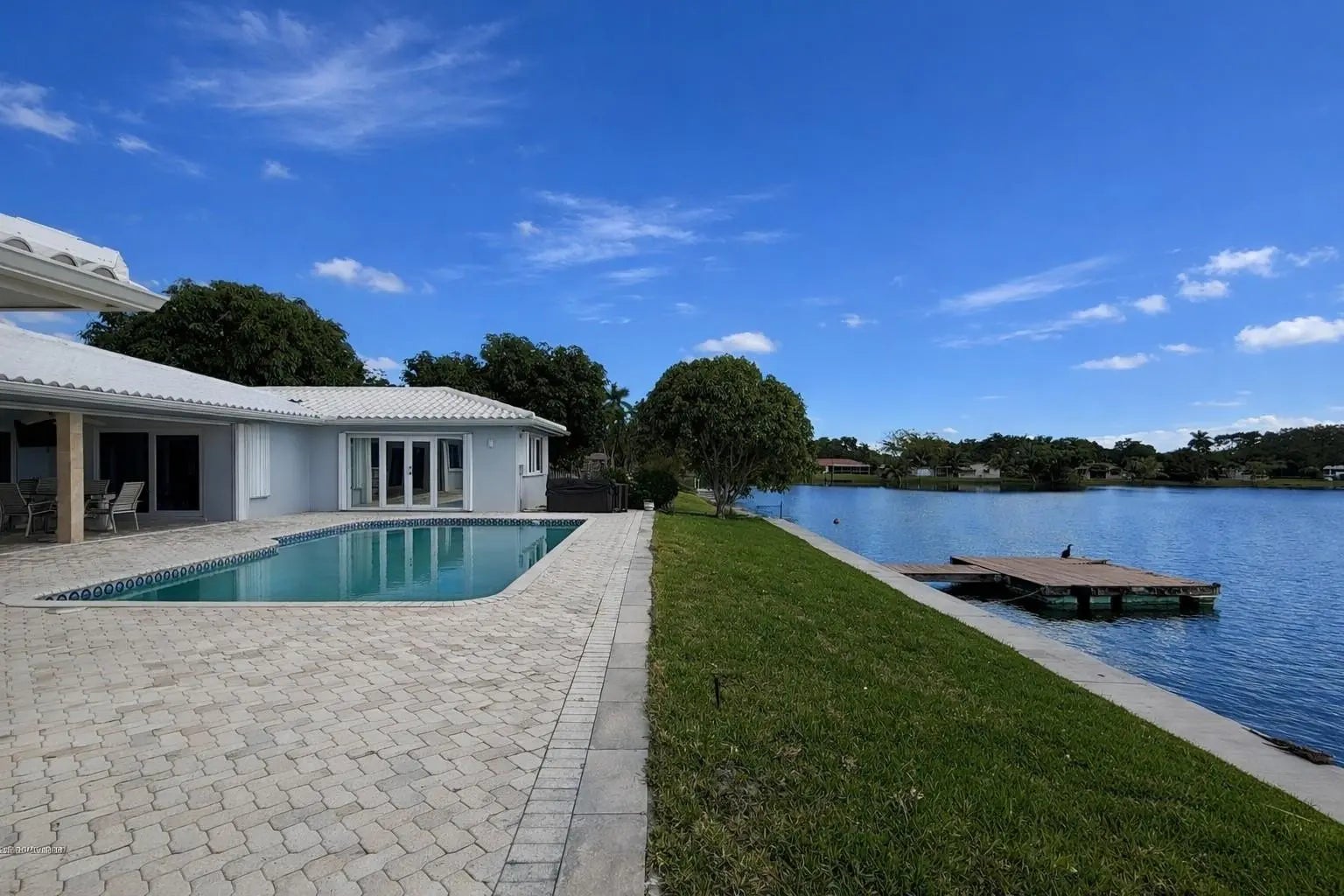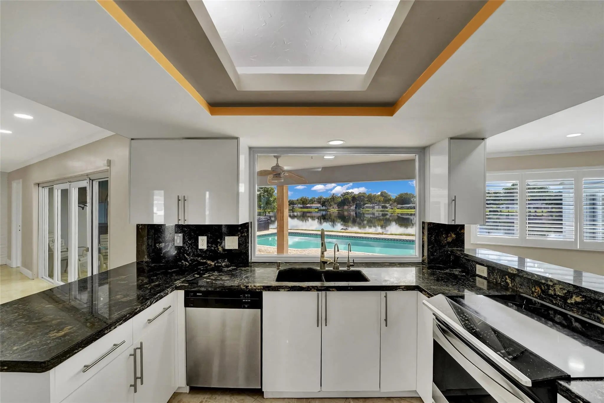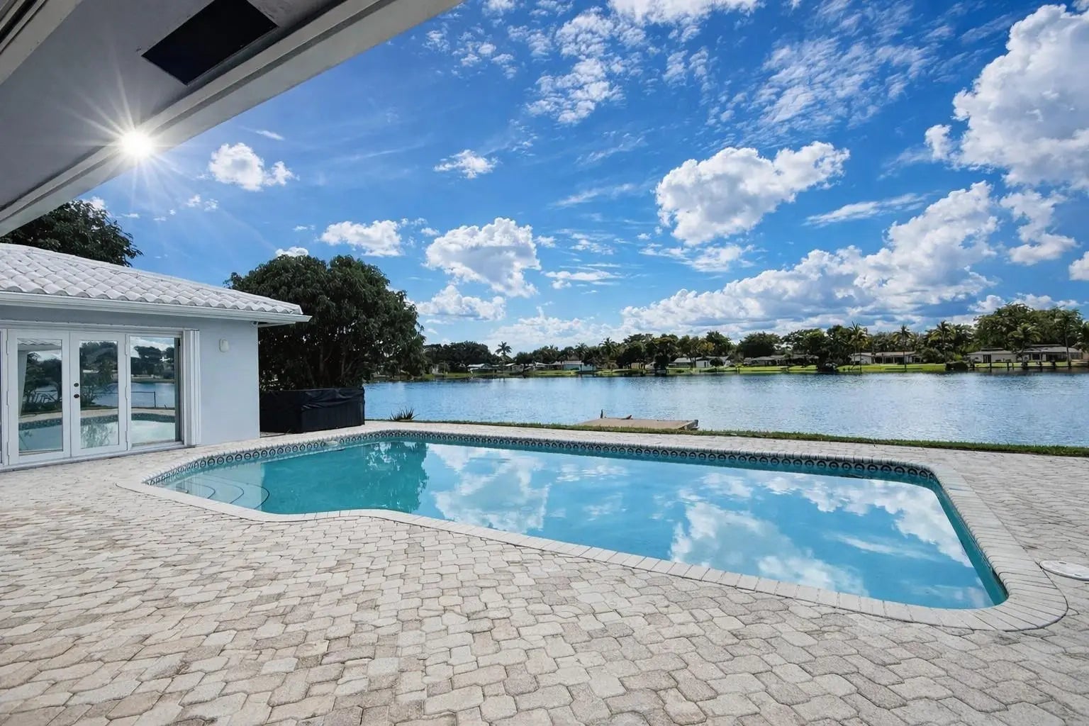 Stunning 4 bed 3.5 bath lakefront pool home with in-law/multi-generation quarters in Royal Palm Estates. Enter to impressive great room with rectified porcelain floors and sweeping panoramic views of the sparkling sports pool & serene lake. The open-concept flows to the chef's kitchen featuring granite counters, SS appliances, full walk-in pantry, & adjacent family room/dining area that's ideal for gatherings. The master suite wing is a true retreat, with extremely large walk-in closet, home office & cozy sitting area or gym. The standout feature is the separate suite with private entry–ideal for extended family. This wing includes a living room, laundry, oversized walk-in closet & bath with dual sinks & massive shower with seating bench. Newer METAL roof & full hurricane protection! Celebrate your life in a resort-like breath-taking home with a view. Bring your Kayak, Canoe or fishing boat -- you can drop into the lake and relax from your private dock -this home is protected by one of the few seawalls on the lake. The home is thoughtfully designed with an effortless flow between the outdoors and your living space. Huge windows overlooking the lake enables you to watch the various wildlife including the wood storks, ducks, coots, anhinga, turtles, jumping fish and more!New sprinkler system uses lake water.Close to all the shopping including Trader Joes, Publix, Aldi, Whole Foods, Costco etc.