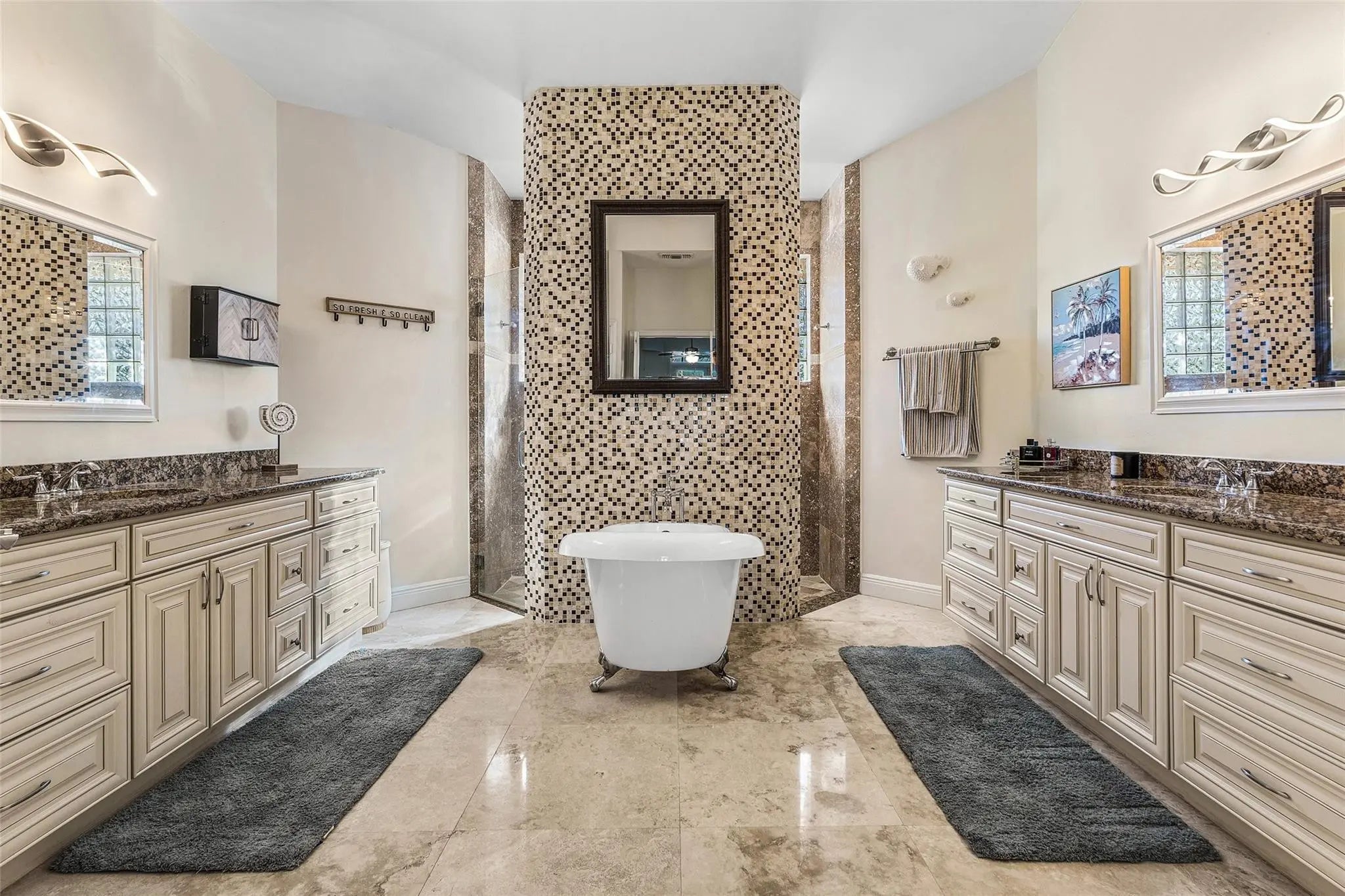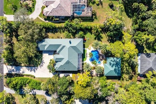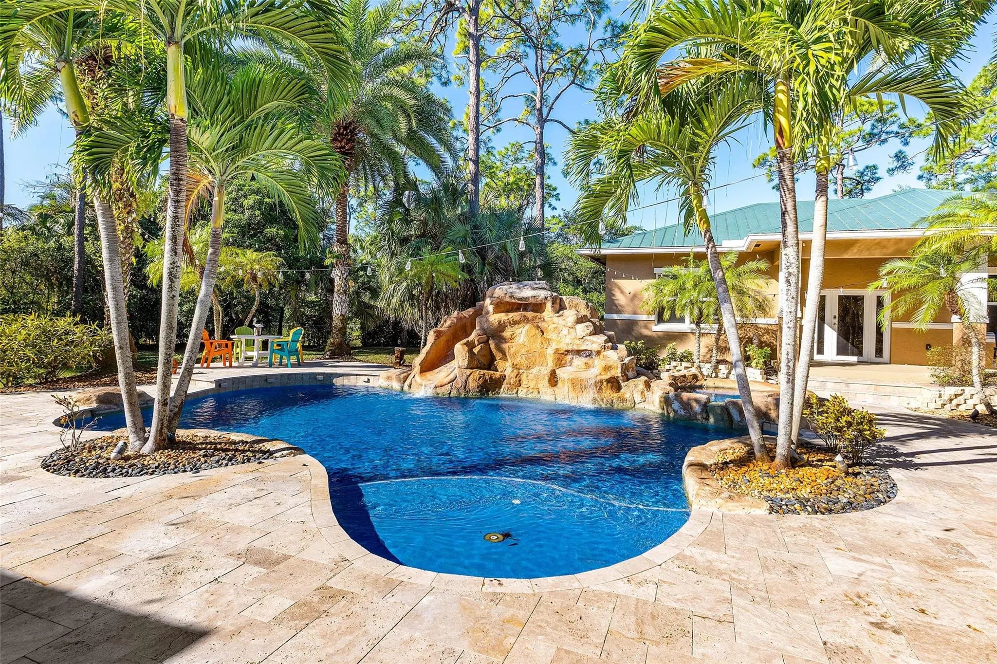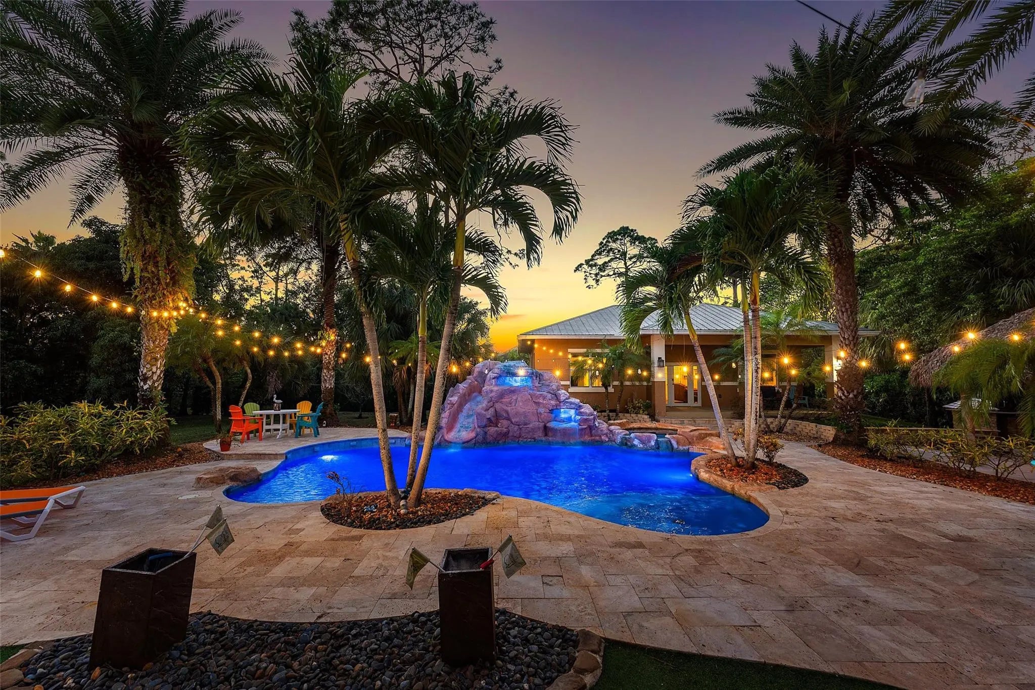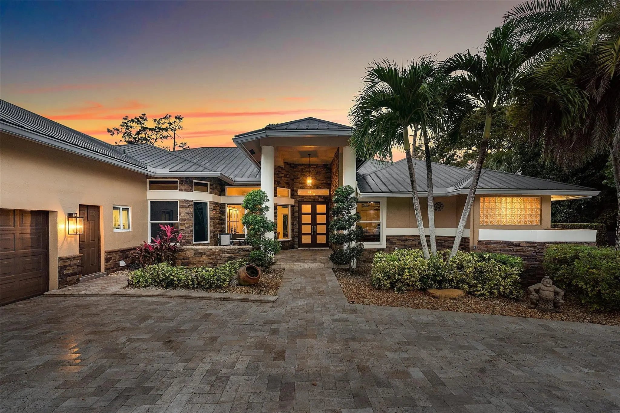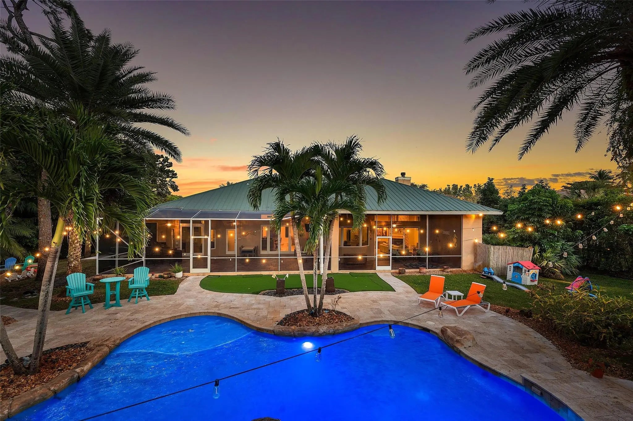 Impressive family compound with a guest house set on 1.09 acres, perfect for multi-generation households. Large living areas framed by impact glass create seamless indoor/outdoor flow with tranquil views of the tropical pool & backyard. A striking exterior features a long driveway, manicured lawn, & stunning double-door entry. The open kitchen/family room offers wood cabinetry, top-shelf appliances, a fireplace & generous space. The impressive primary suite boasts a spa-like bath, custom closets, & serene pool views. Enjoy a private backyard retreat with a tiki hut, oversized pool with waterfall & slide, multiple outdoor living spaces & when the sun goes down the magic begins. Fabulous guest house with a front porch, great room, full kitchen & bath—ideal for guests or in-laws.