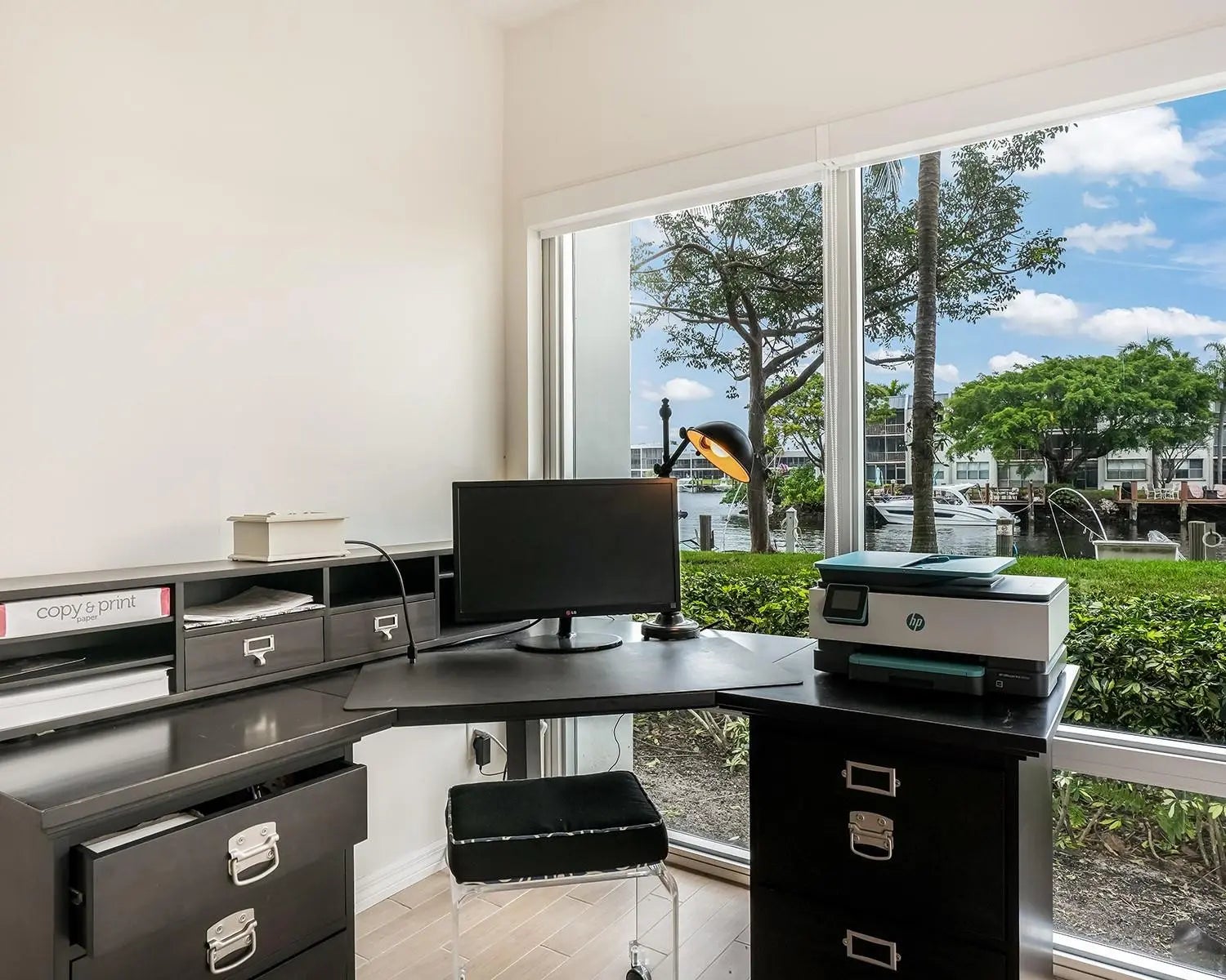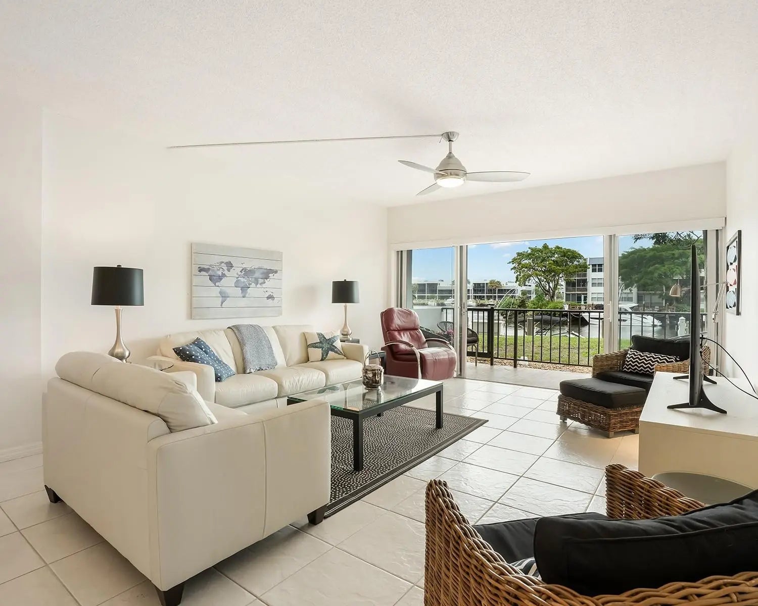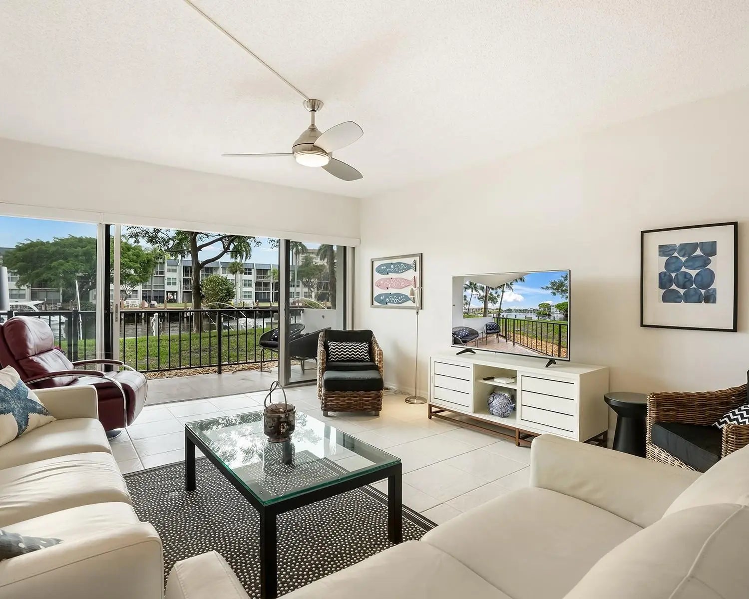 Enjoy stunning waterway and dock views from the large private porch, overlooking a peaceful no-wake zone with a relaxing parade of boats. This 2-bedroom, 2-bath residence offers convenient access and resort-style amenities including a heated saltwater pool, fitness center, clubhouse, BBQ area, and billiard room. Building certification completed with no pending assessments. Internet and cable included in maintenance. Ideally located near restaurants, golf, and shopping, and less than two miles to the beach. A move-in-ready coastal opportunity in a prime location.