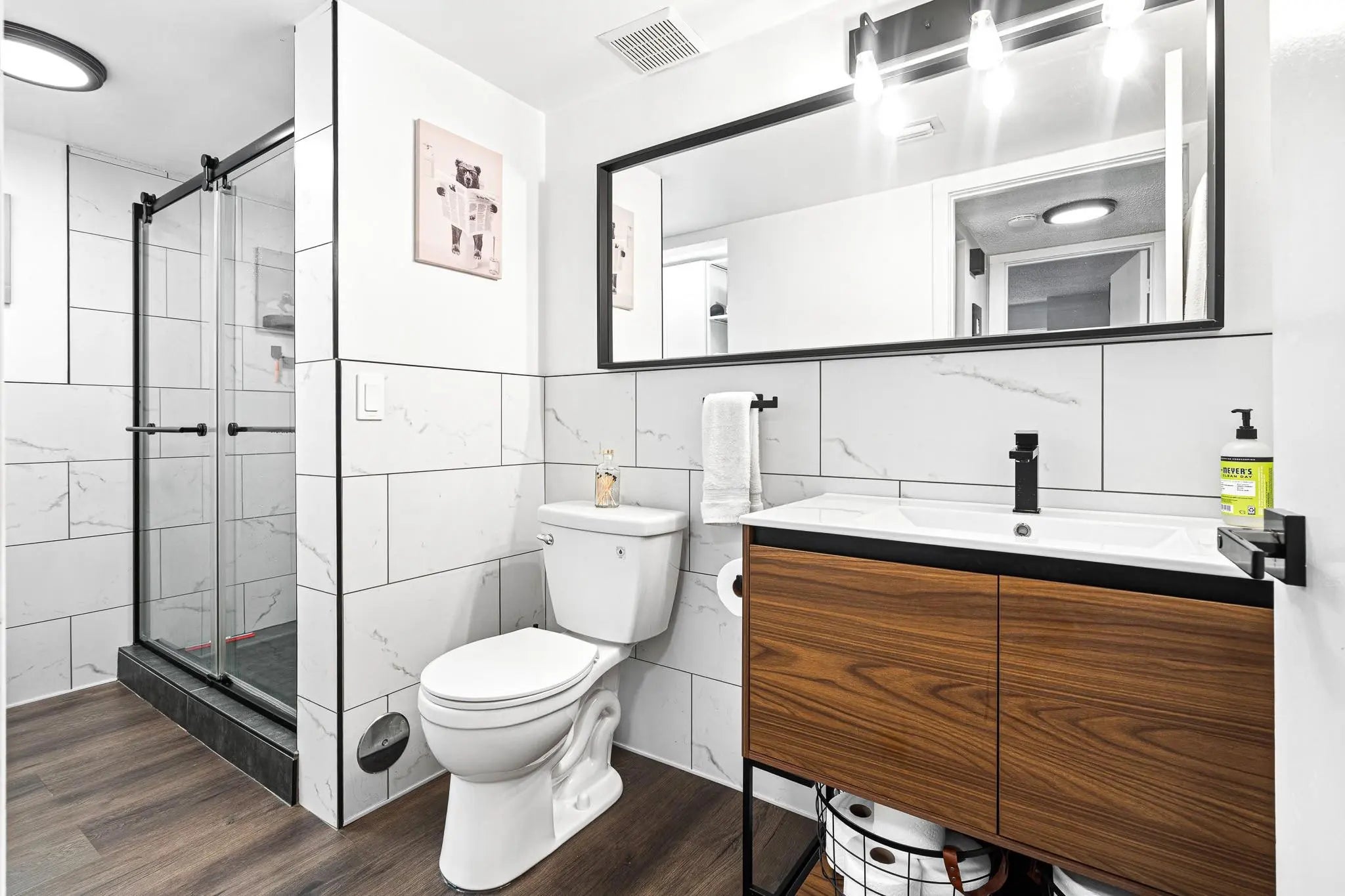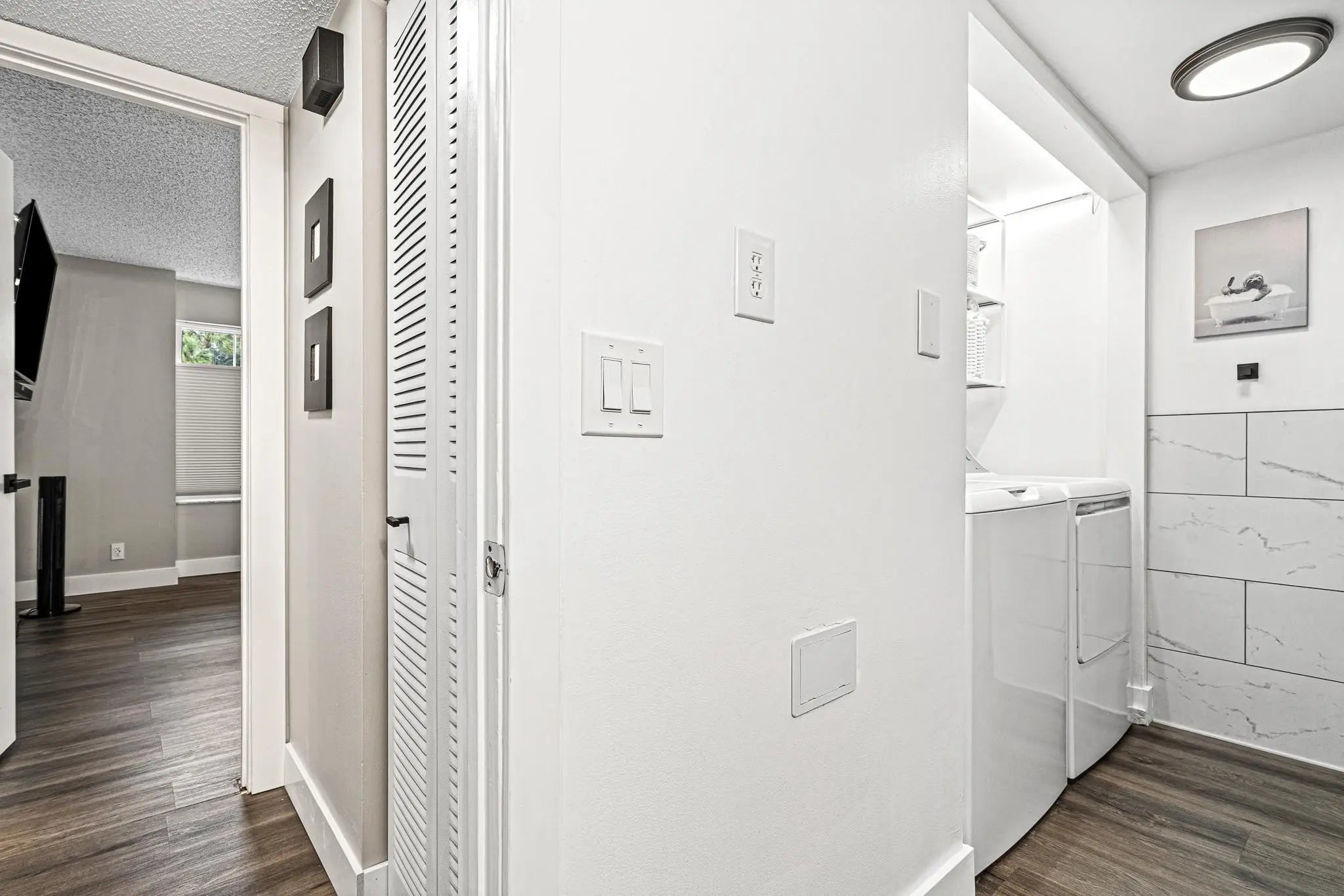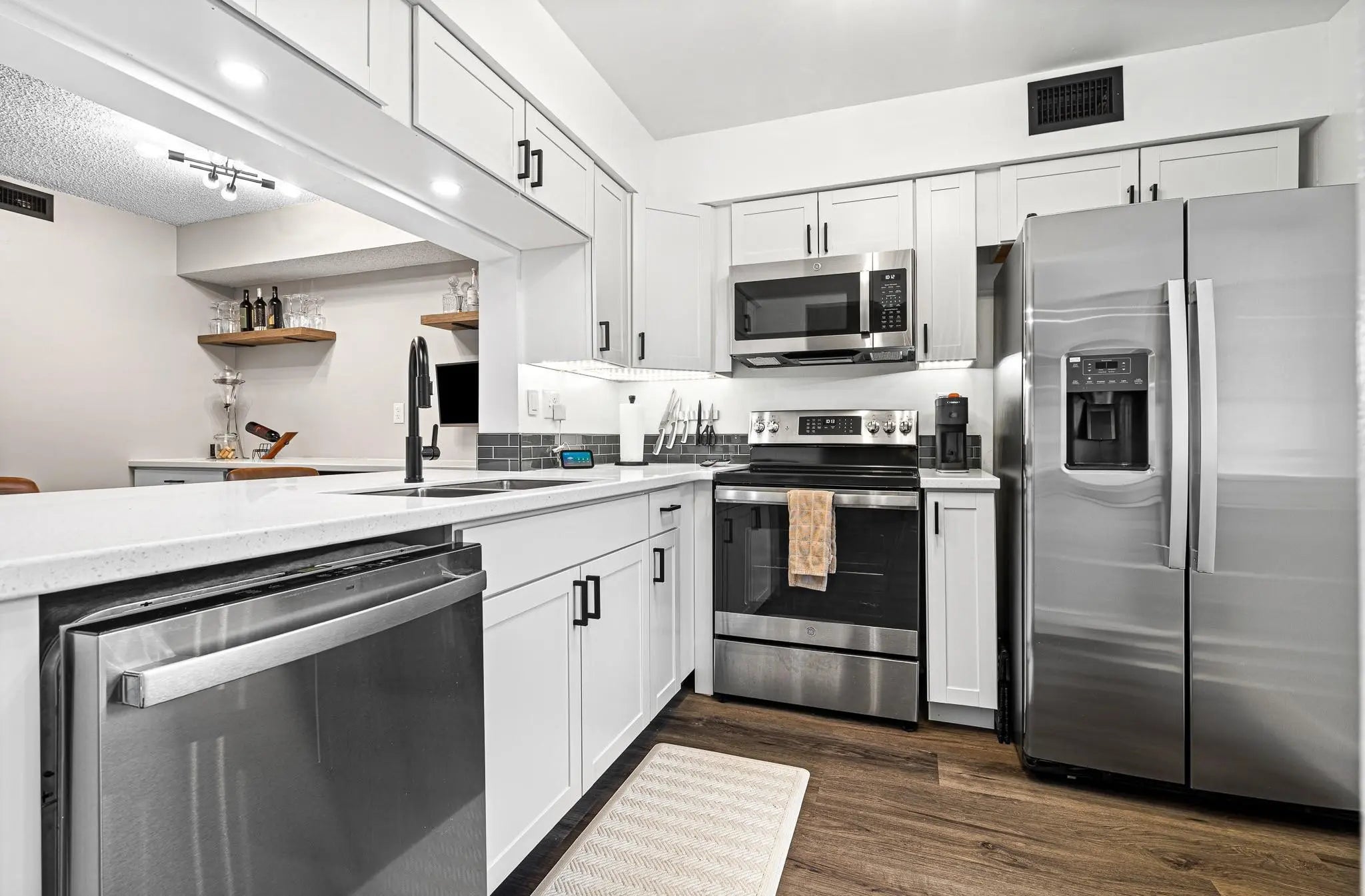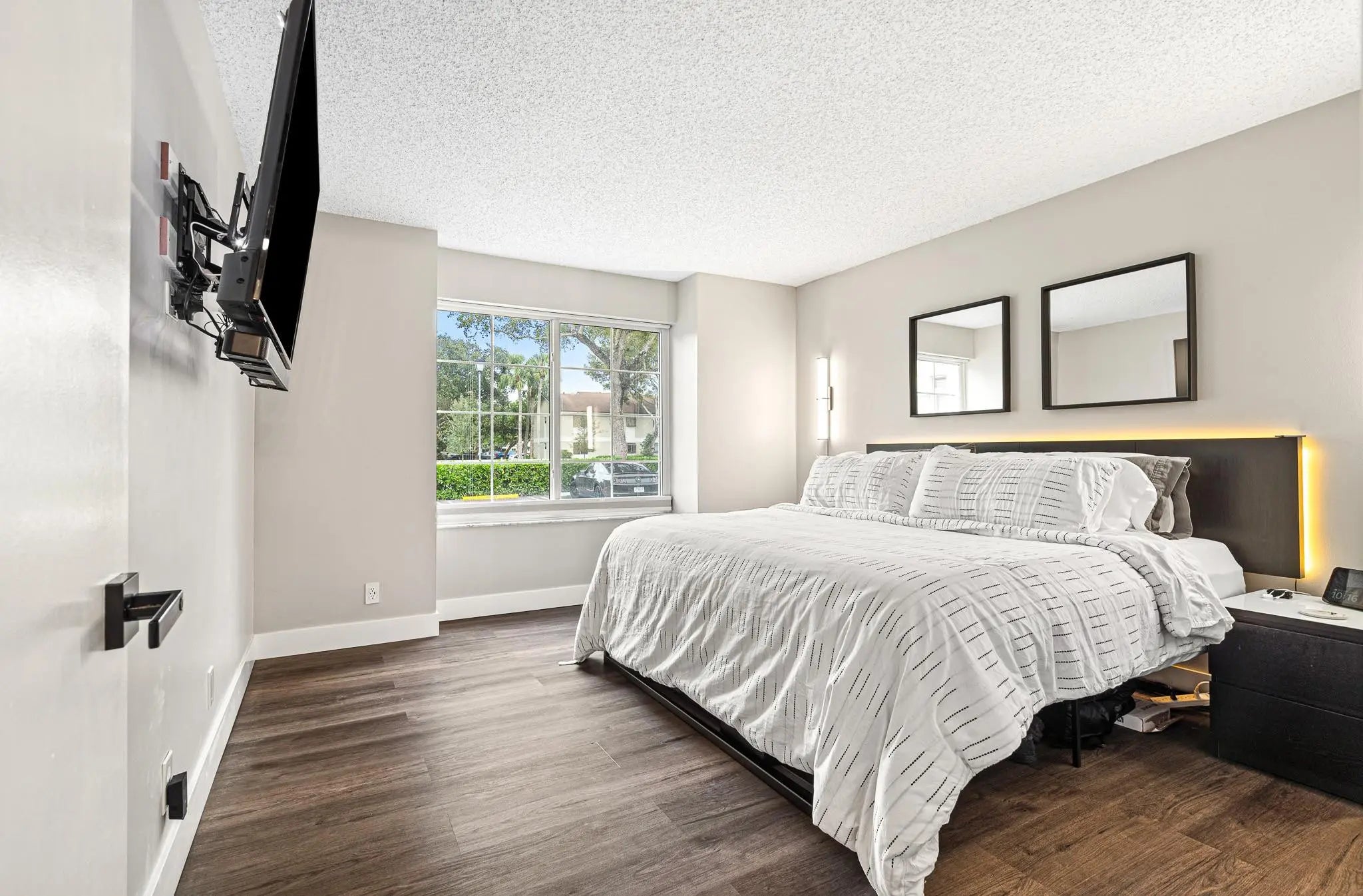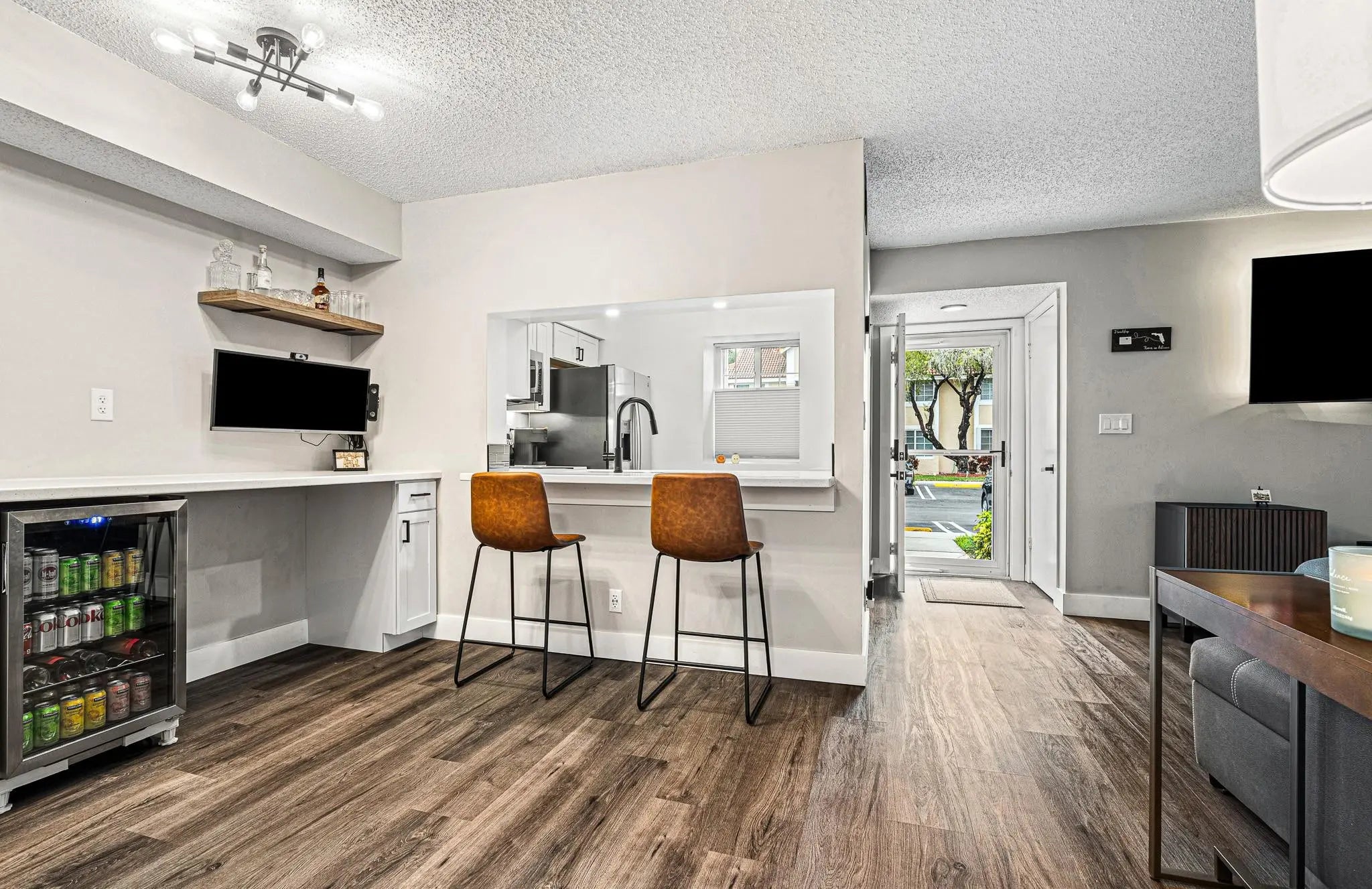 Stylish and fully renovated, 'pet friendly', 1st floor condo in La Bonne Vie. Renovations: laminate floors/baseboards, kitchen remodel w/beverage bar, all new appliances, bathroom remodel w/towel warmer, utility area shelving, double-pane windows (2024) w/top-to-bottom shades and sliding glass door, lanai flooring, bedroom built-in closet organizer, storm door with retractable screen, smart home switches, ring doorbell and smart lock, plus TV mounts x2. Also, hurricane shutters, washer/dryer, assigned parking and screened-in patio/lanai. AC and water heater 2019. Amenities: fitness center, Olympic size heated pool, tennis/pickleball/basketball courts, running track. Fully funded HOA reserves. La Bonne Vie is a quiet community close to restaurants, shopping, Turnpike and I95. Come see it!