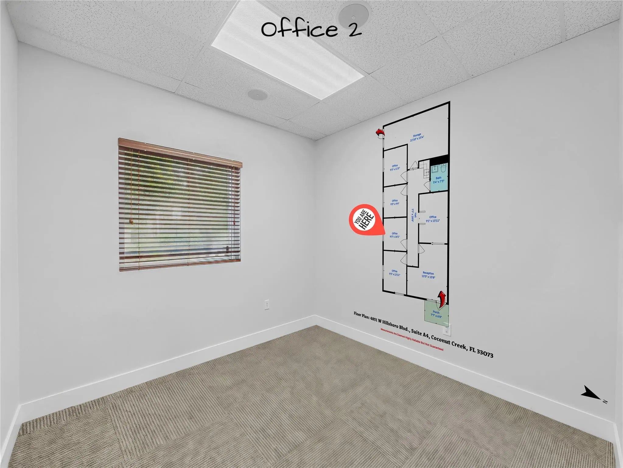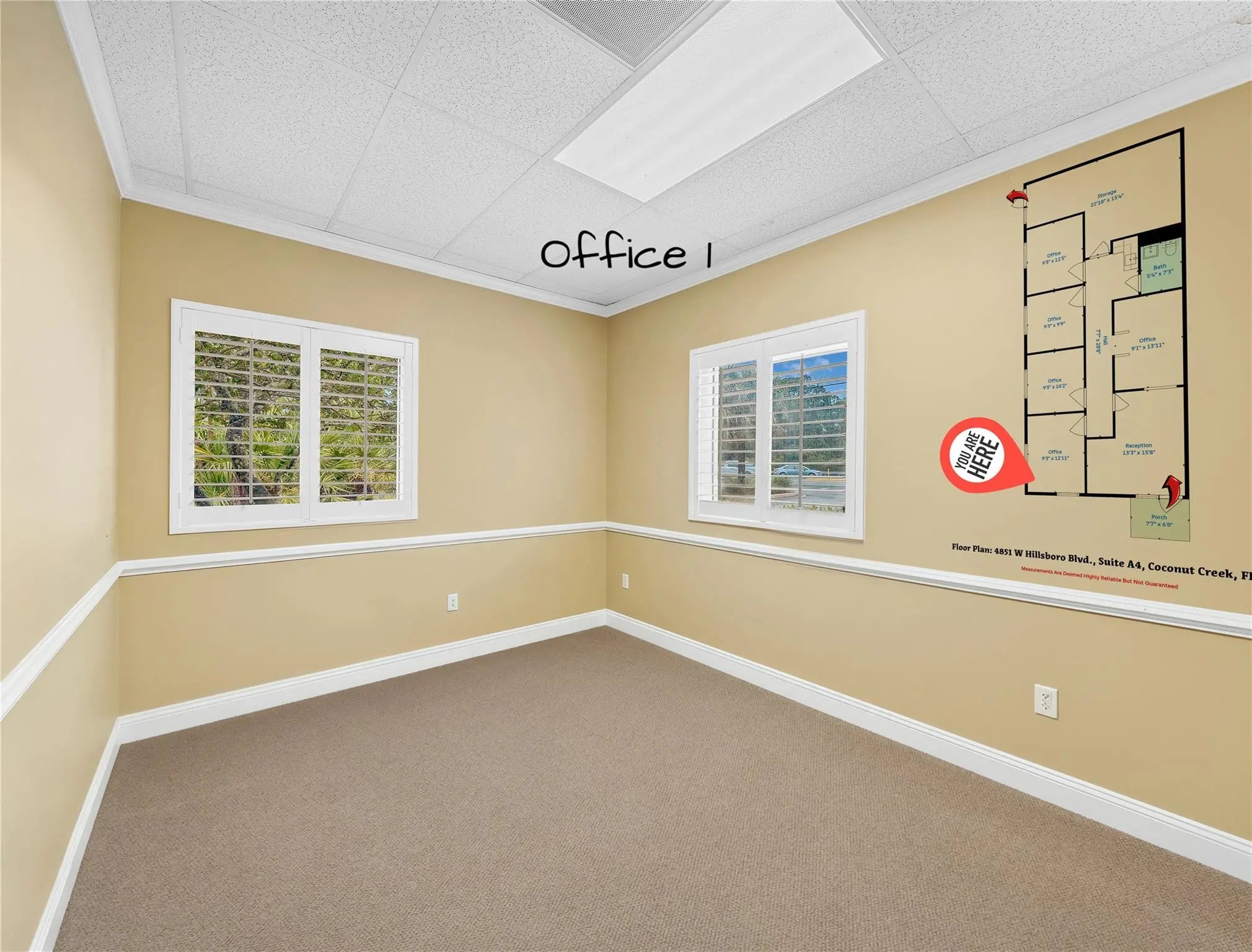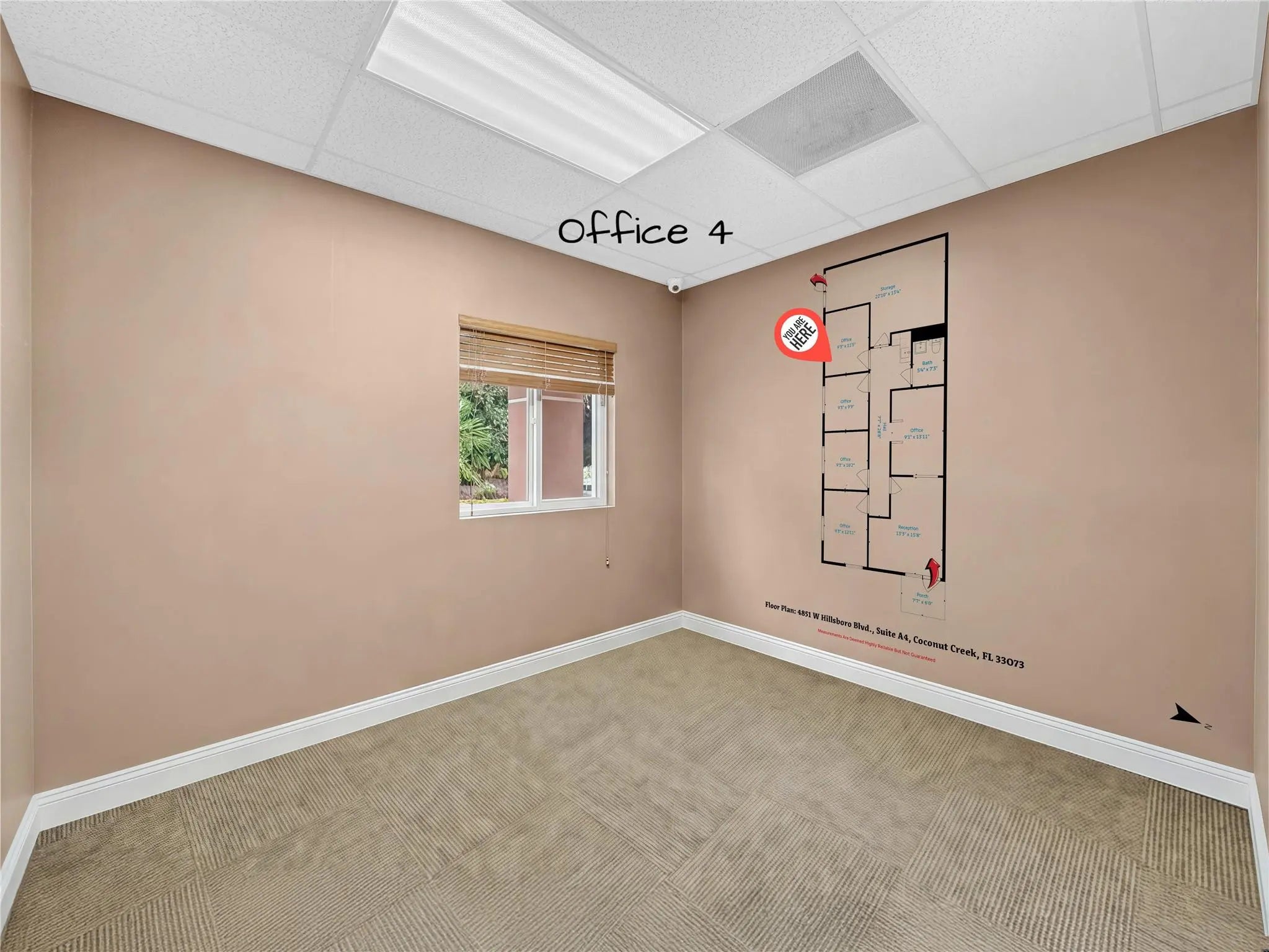 Reduced Price! Bright corner unit with windows in every office, offering excellent natural light throughout. This turnkey space may include furnishings and features impact windows and doors for added peace of mind. Includes four private offices, a stylish lobby and reception area, and a spacious warehouse with high ceiling in the rear. Thoughtfully built out and ready for immediate occupancy. 1 assigned parking space and ample visitor parking. Security camera and inactive alarm system included. Convenient North Coconut Creek location, close to major roads and highways, dining and shopping.