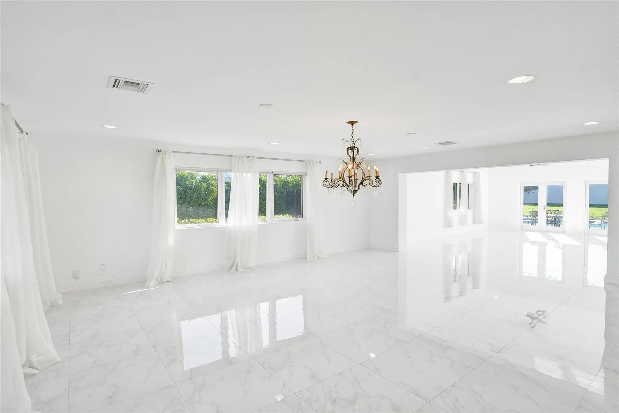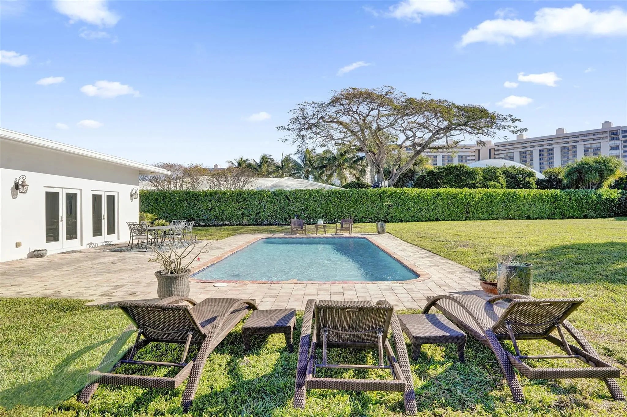 Located in the exclusive guard-gated community of Sea Ranch Lakes, this spacious 3BR/3BA home with a 2-car garage sits on an oversized lot, offering relaxed coastal living within walking distance to the beach. Enjoy access to the Sea Ranch Lakes private beach club, creating an easy connection to the ocean year-round. The home features impact windows and doors, an alarm system, and a bright, open layout with French doors leading to the pool and large fenced backyard. The kitchen is equipped with JennAir appliances and a wine refrigerator. The primary suite includes a walk-in closet and en-suite bath with Jacuzzi tub and large shower. A second bedroom offers an en-suite bath, while the third opens directly to the pool. Pool maintenance and landscaping included. Pet considered with deposit.