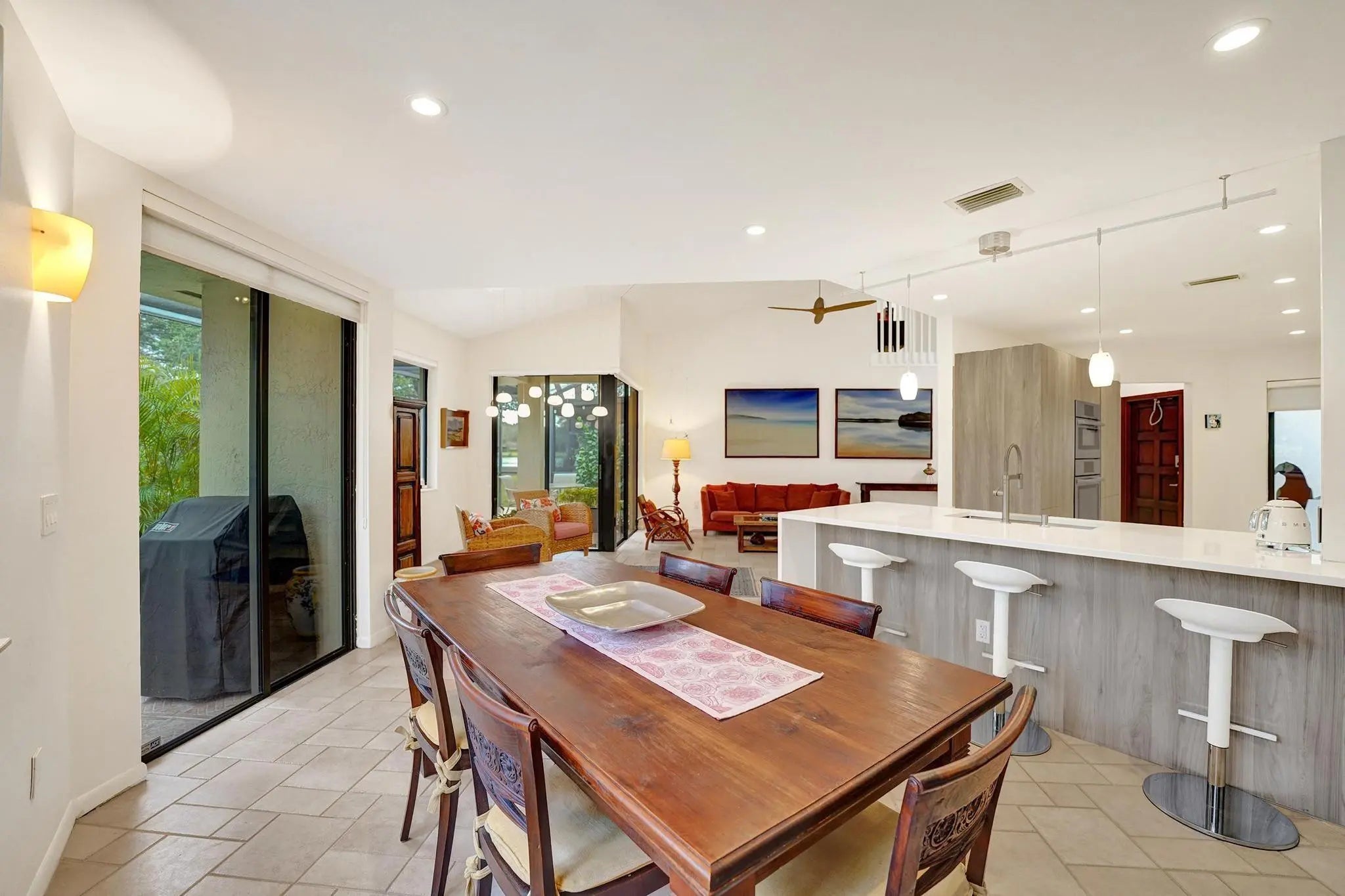 This charming three-bedroom, two-and-a-half-bath home showcases modern finishes and a bright, open-concept design perfect for everyday living and entertaining. The beautifully renovated kitchen features custom cabinetry, sleek quartz countertops, a spacious breakfast bar, and premium Bosch appliances, all flowing seamlessly into the living area for easy gatherings. Enjoy abundant natural light and contemporary LED lighting throughout. The spacious living room opens to a screened patio with tranquil lake views—an ideal spot for morning coffee or evening relaxation. The primary suite offers a private sitting area and a spa-inspired walk-in shower with modern tile and glass enclosure, creating a peaceful retreat. Prime location in the highly desirable community of Chelsea III