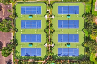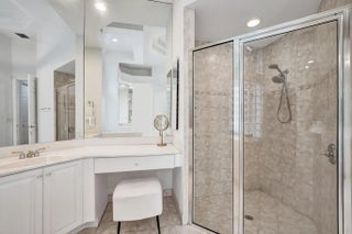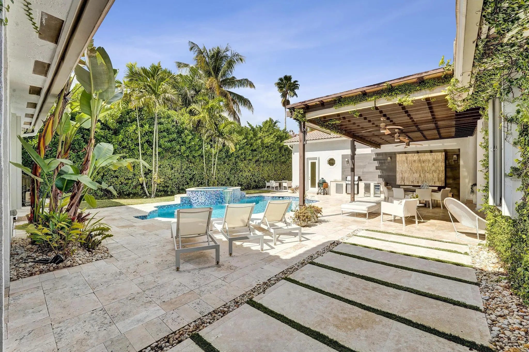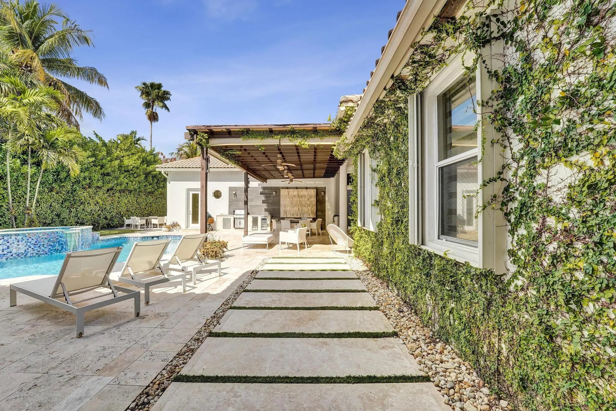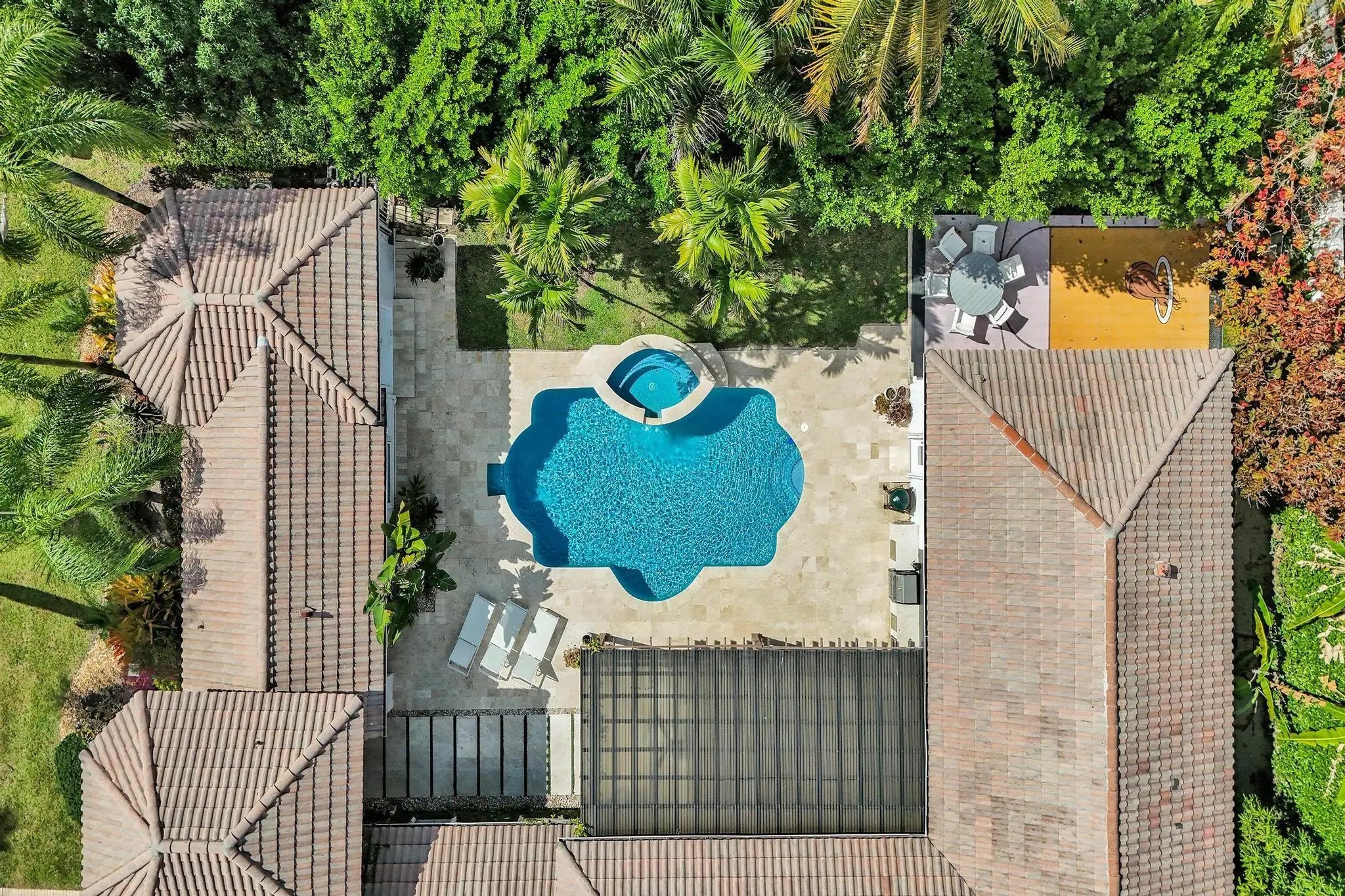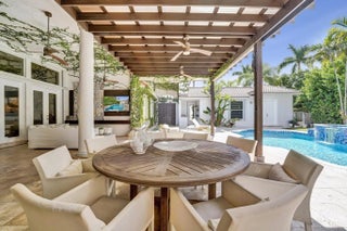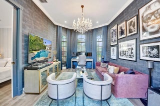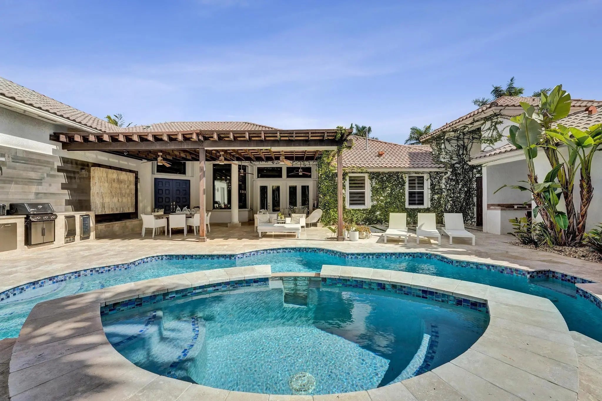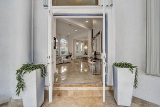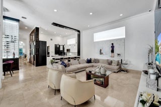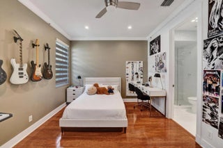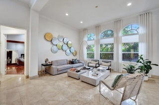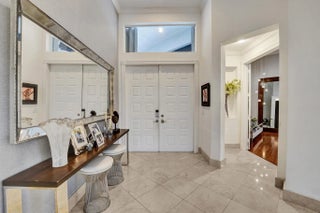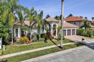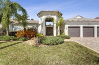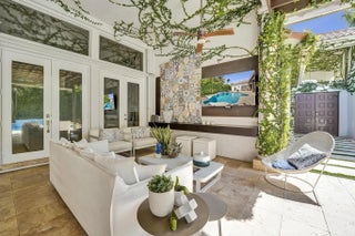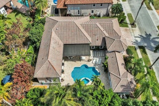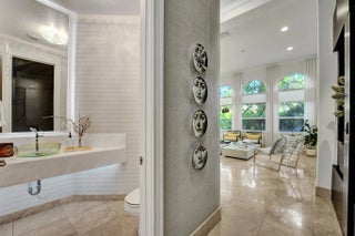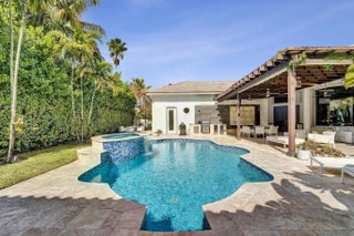Very rare extended Courtyard Model with an expanded freestanding guest suite and built-in office. 4 bedrooms 4 1/2 baths with all bedrooms having en-suite bath. Home features include a stunning master bedroom with large sitting area, double ovens, crown molding, custom drapes, decorative wine storage wall, central vac, marble floors throughout, accordion hurricane shutters and more beautiful upgrades. Enjoy outdoor luxury with a covered patio, stunning heated pool with spa waterfall, sport court built in grill. This is a unique opportunity to own an upgraded and rare floorplan in the falls with access to a plethora of community amenities. Property is designer decorated with furniture negotiable.
