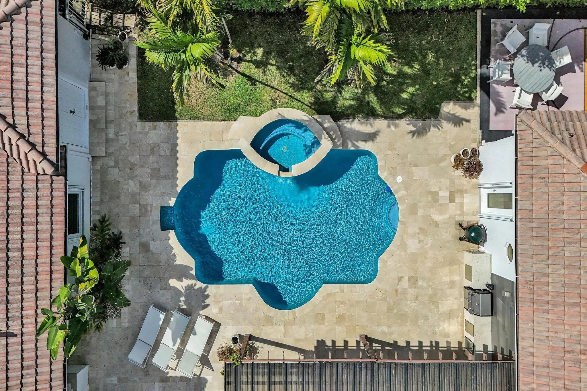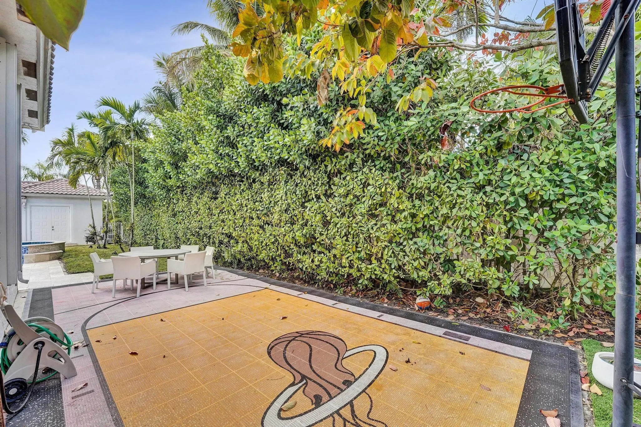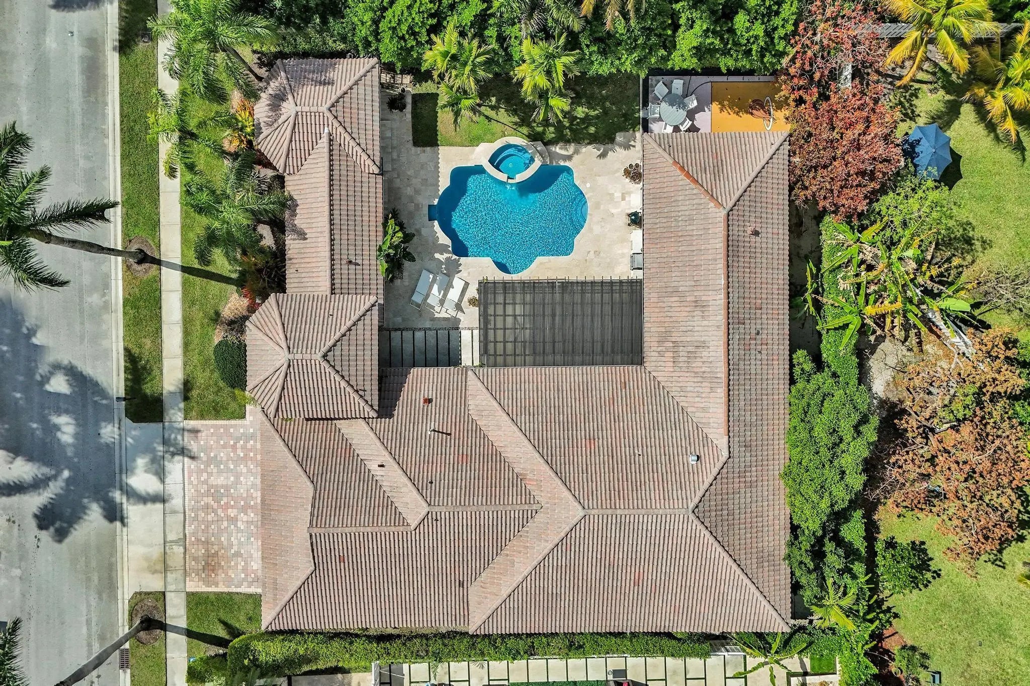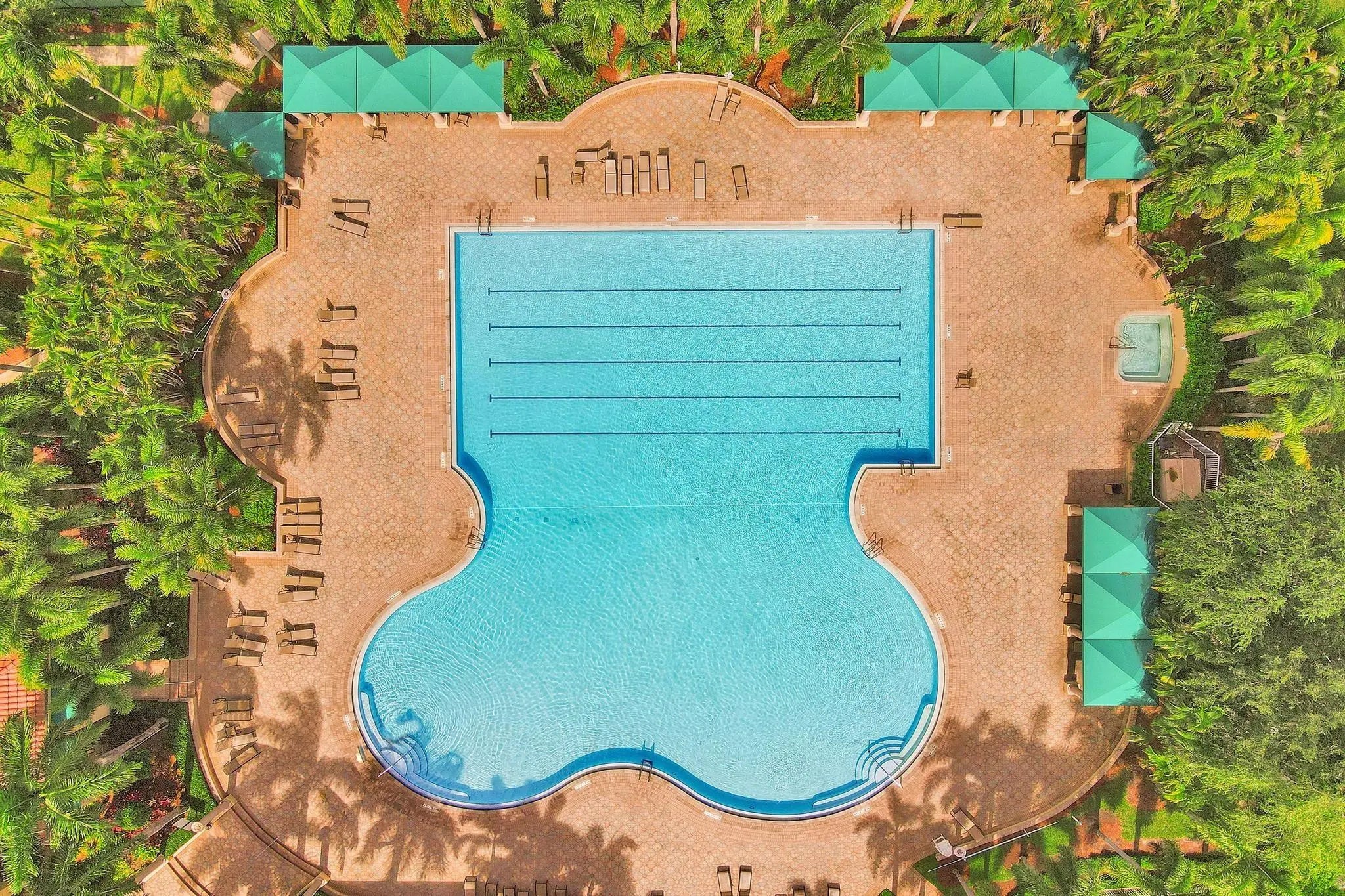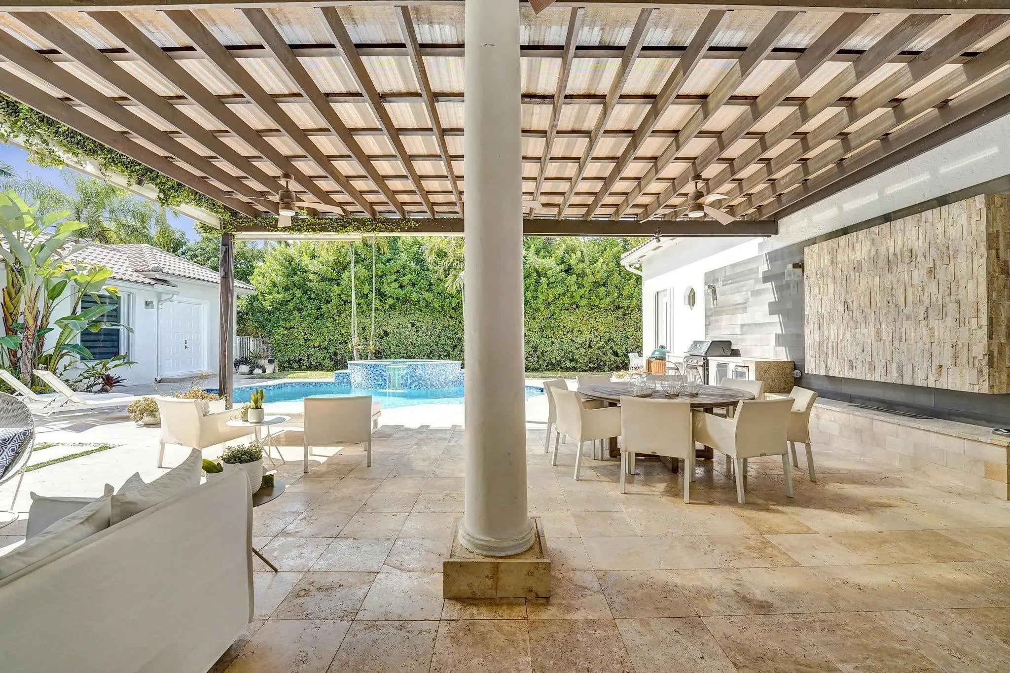 Very rare extended Courtyard Model with an expanded freestanding guest suite and built-in office. 4 bedrooms 4 1/2 baths with all bedrooms having en-suite bath. Home features include a stunning master bedroom with large sitting area, double ovens, crown molding, custom drapes, decorative wine storage wall, central vac, marble floors throughout, accordion hurricane shutters and more beautiful upgrades. Enjoy outdoor luxury with a covered patio, stunning heated pool with spa waterfall, sport court built in grill. This is a unique opportunity to own an upgraded and rare floorplan in the falls with access to a plethora of community amenities. Property is designer decorated with furniture negotiable.