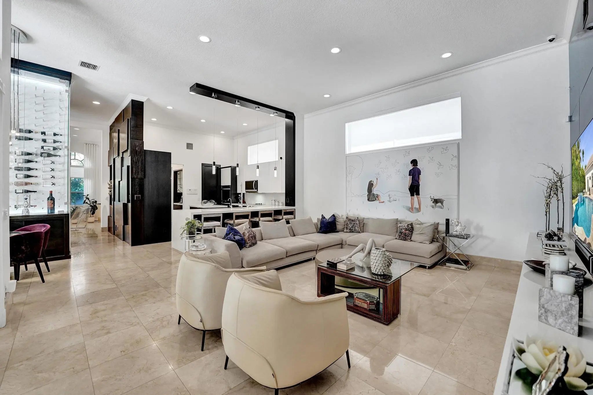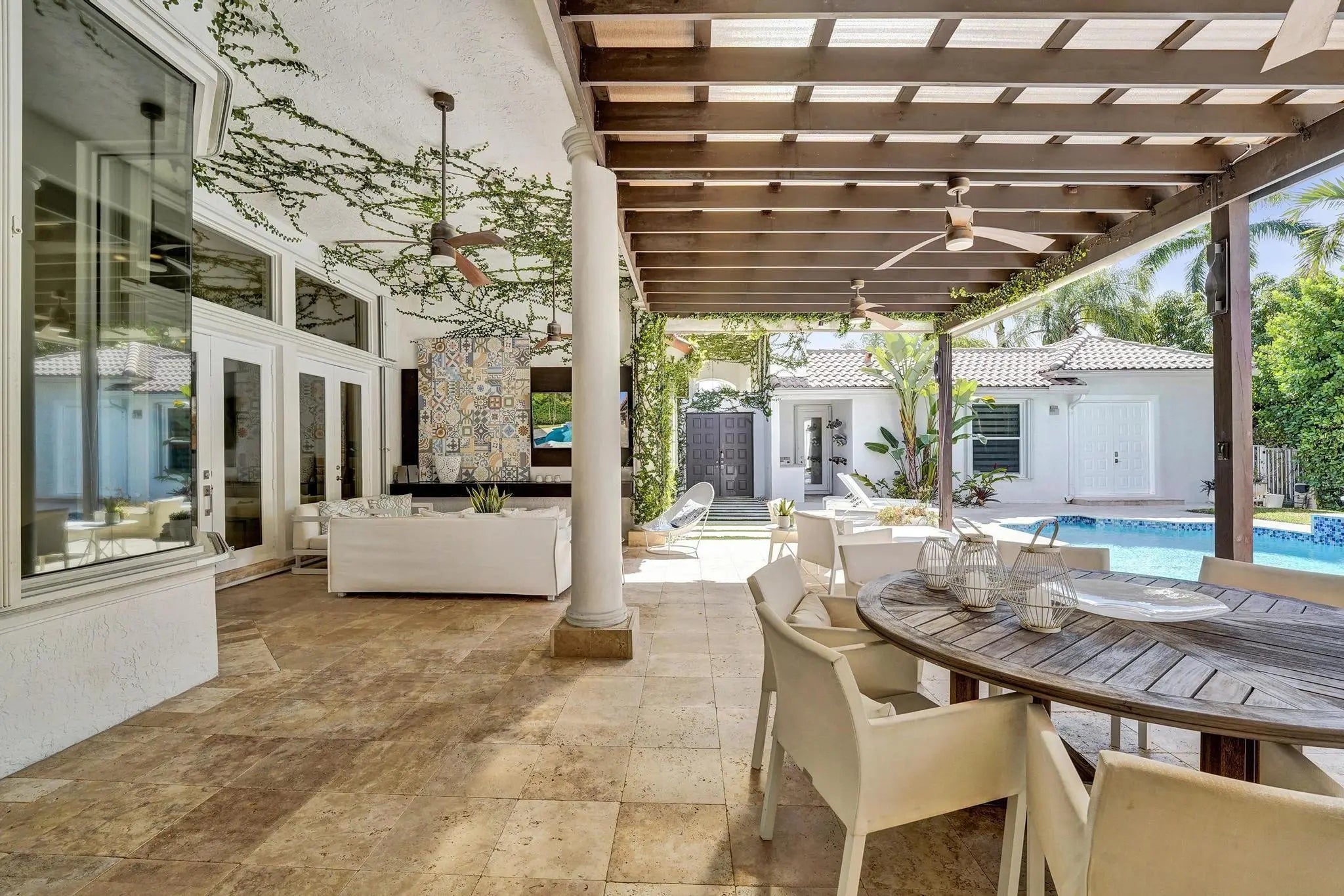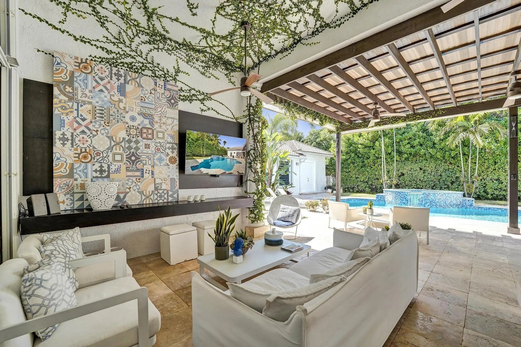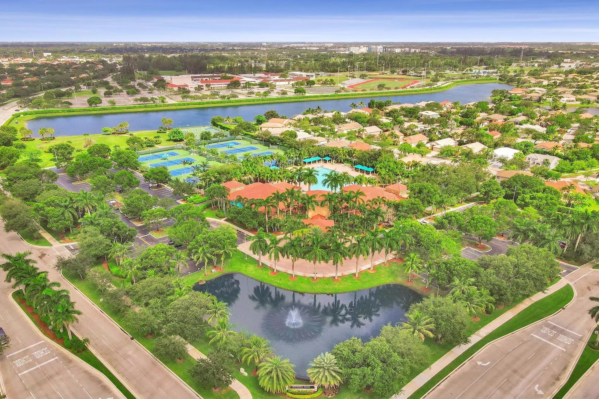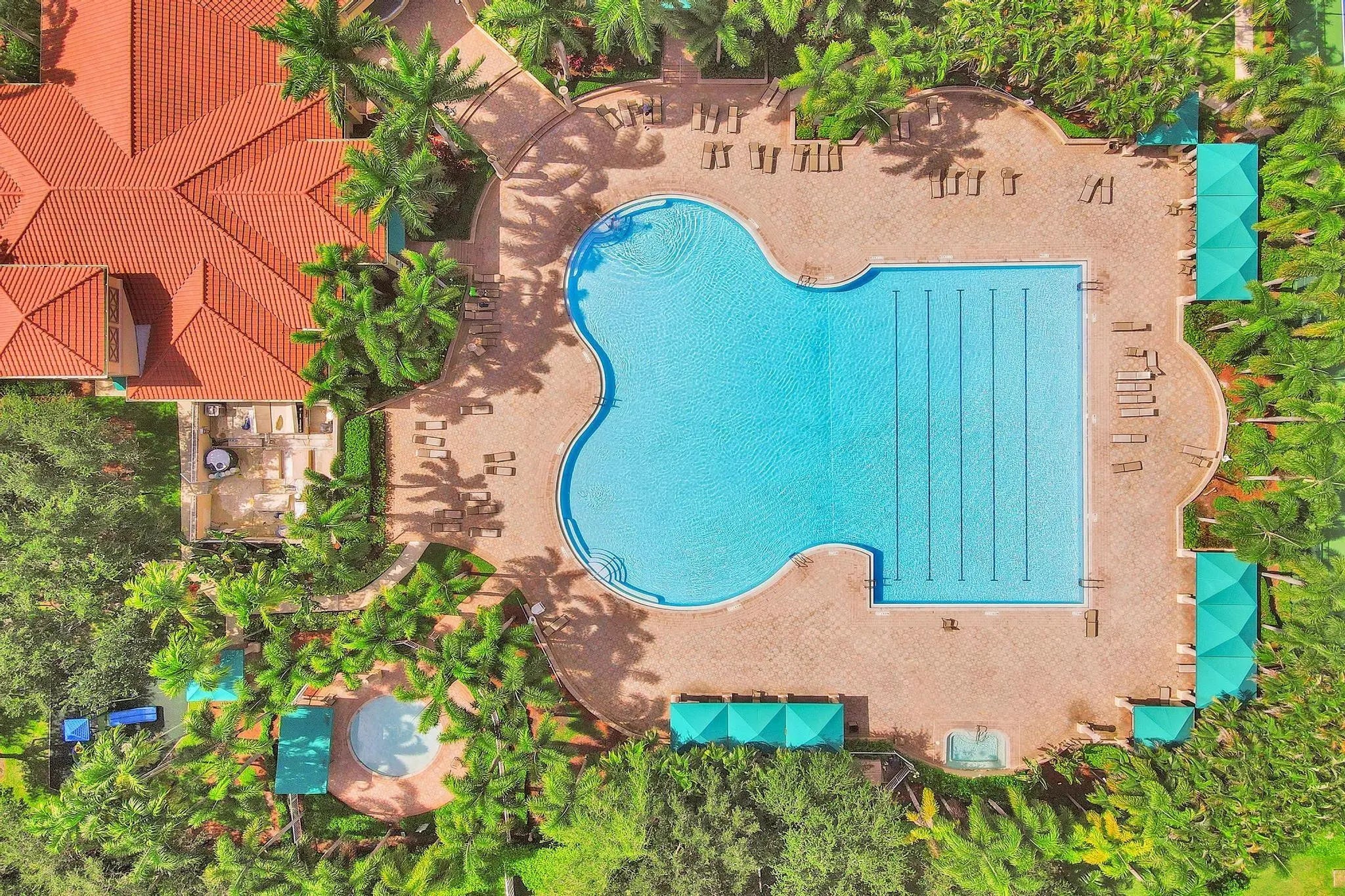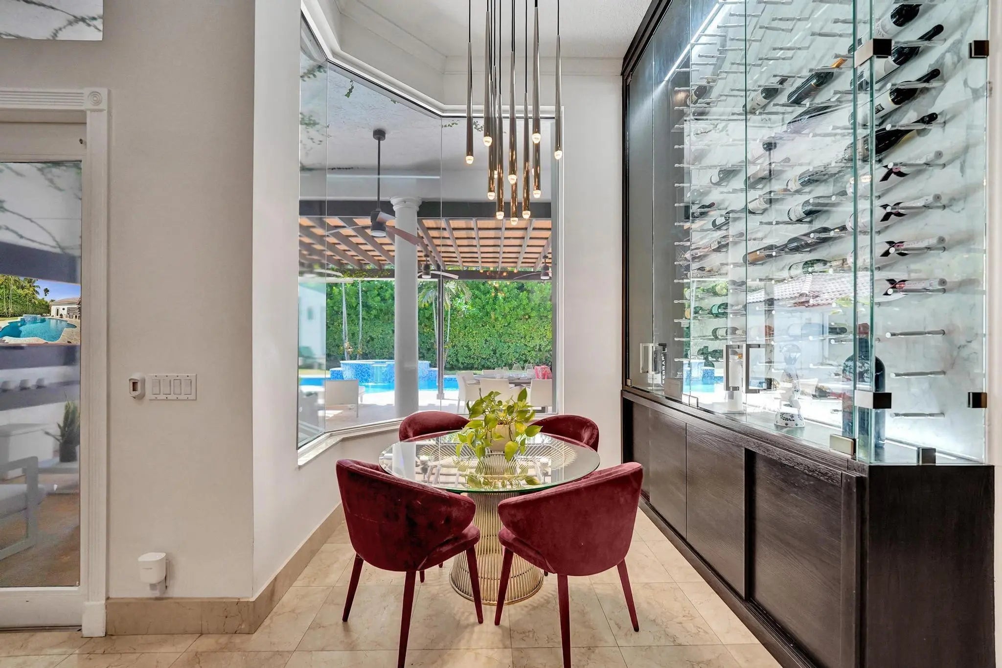 Very rare extended Courtyard Model with an expanded freestanding guest suite and built-in office. 4 bedrooms 4 1/2 baths with all bedrooms having en-suite bath. Home features include a stunning master bedroom with large sitting area, double ovens, crown molding, custom drapes, decorative wine storage wall, central vac, marble floors throughout, accordion hurricane shutters and more beautiful upgrades. Enjoy outdoor luxury with a covered patio, stunning heated pool with spa waterfall, sport court built in grill. This is a unique opportunity to own an upgraded and rare floorplan in the falls with access to a plethora of community amenities. Property is designer decorated with furniture negotiable.