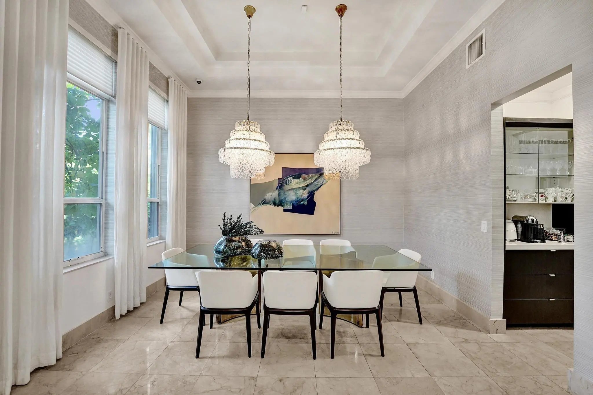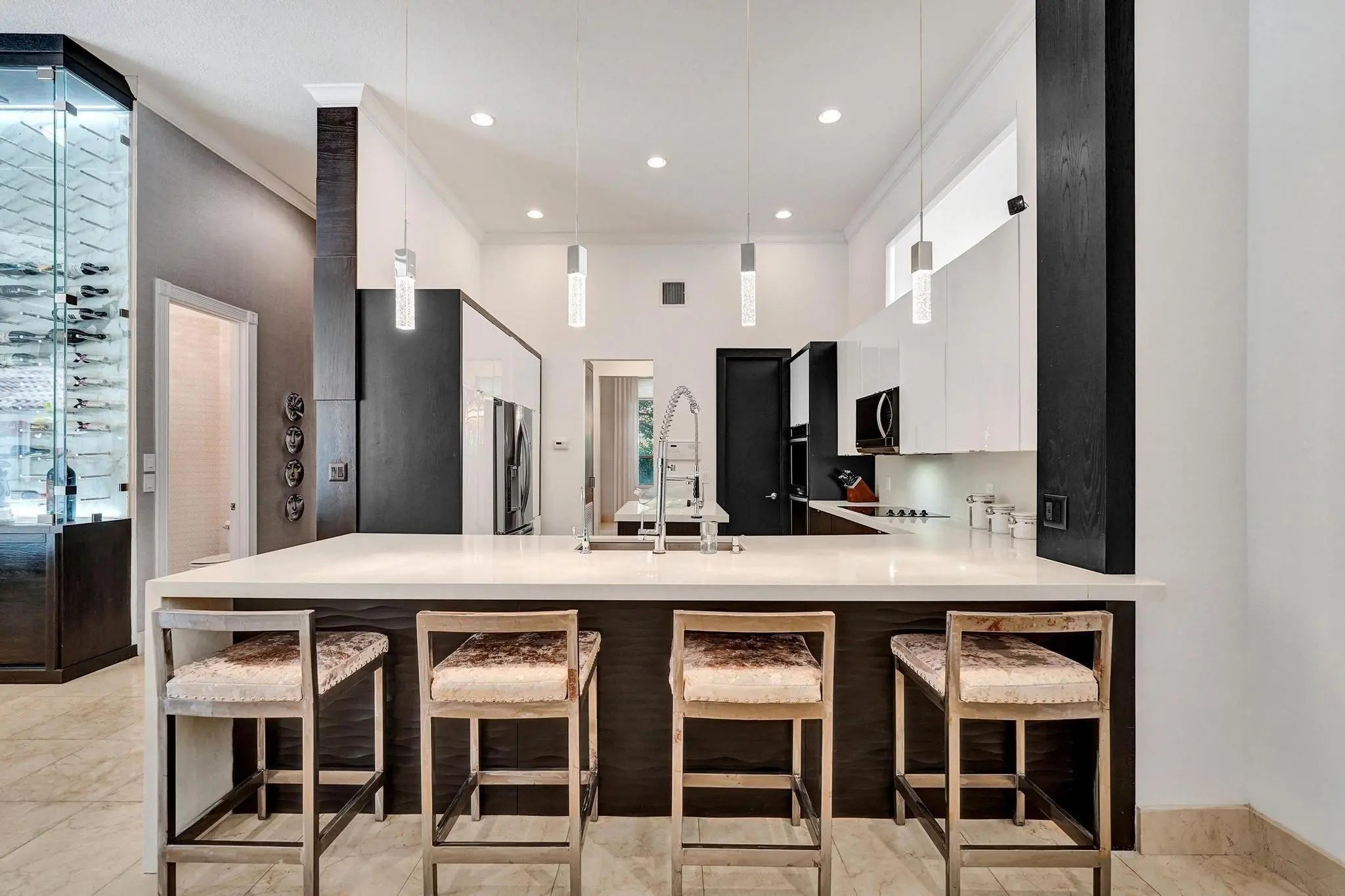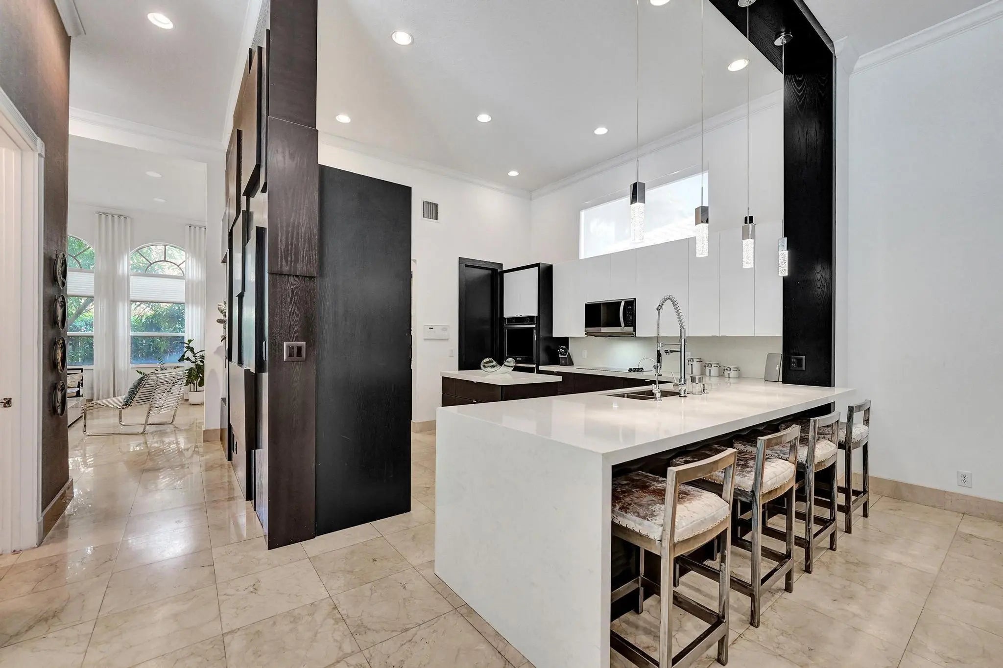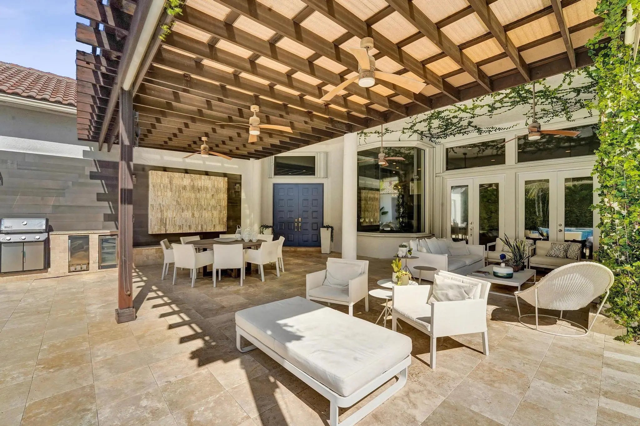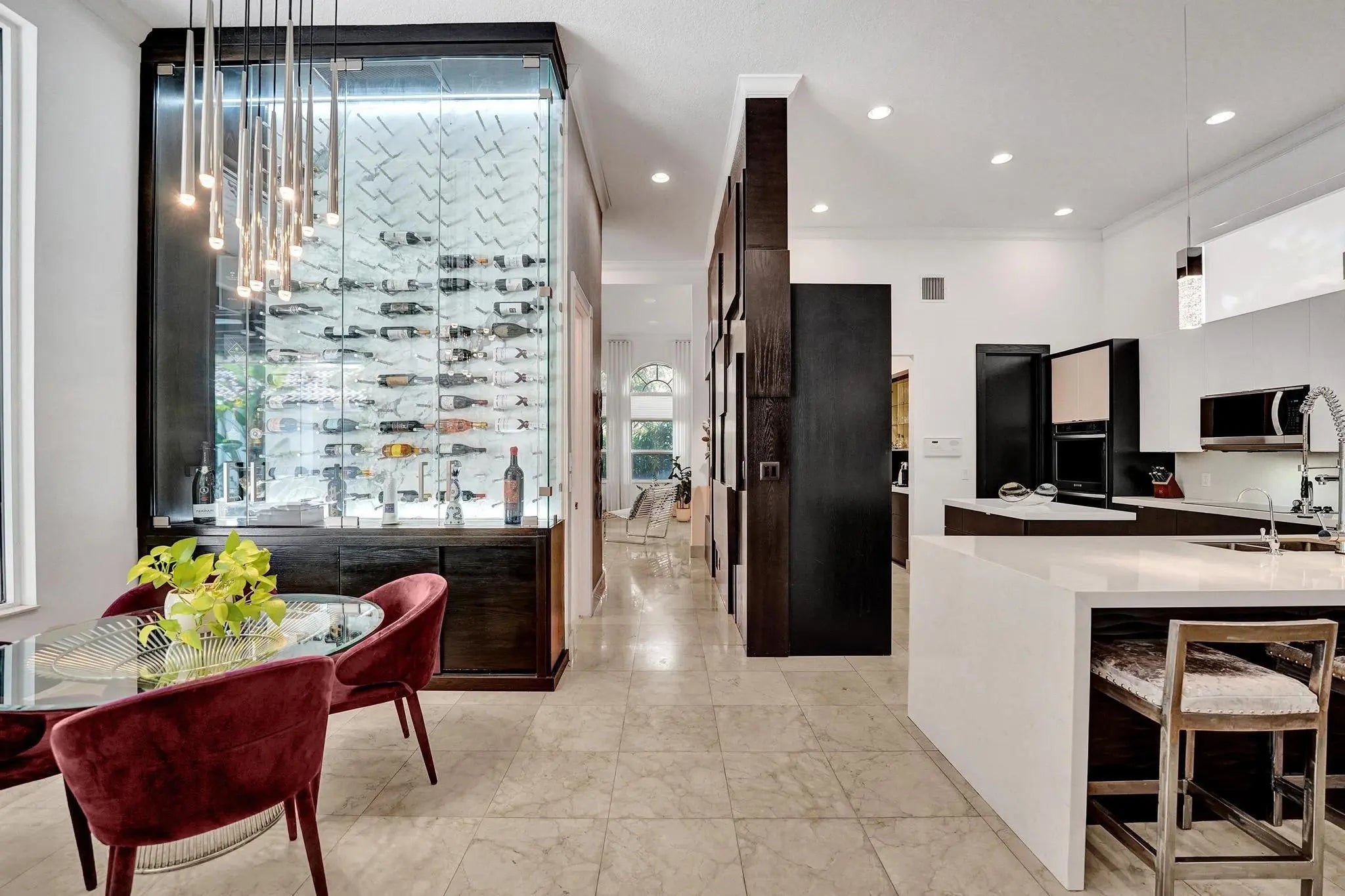Very rare extended Courtyard Model with an expanded freestanding guest suite and built-in office. 4 bedrooms 4 1/2 baths with all bedrooms having en-suite bath. Home features include a stunning master bedroom with large sitting area, double ovens, crown molding, custom drapes, decorative wine storage wall, central vac, marble floors throughout, accordion hurricane shutters and more beautiful upgrades. Enjoy outdoor luxury with a covered patio, stunning heated pool with spa waterfall, sport court built in grill. This is a unique opportunity to own an upgraded and rare floorplan in the falls with access to a plethora of community amenities. Property is designer decorated with furniture negotiable.