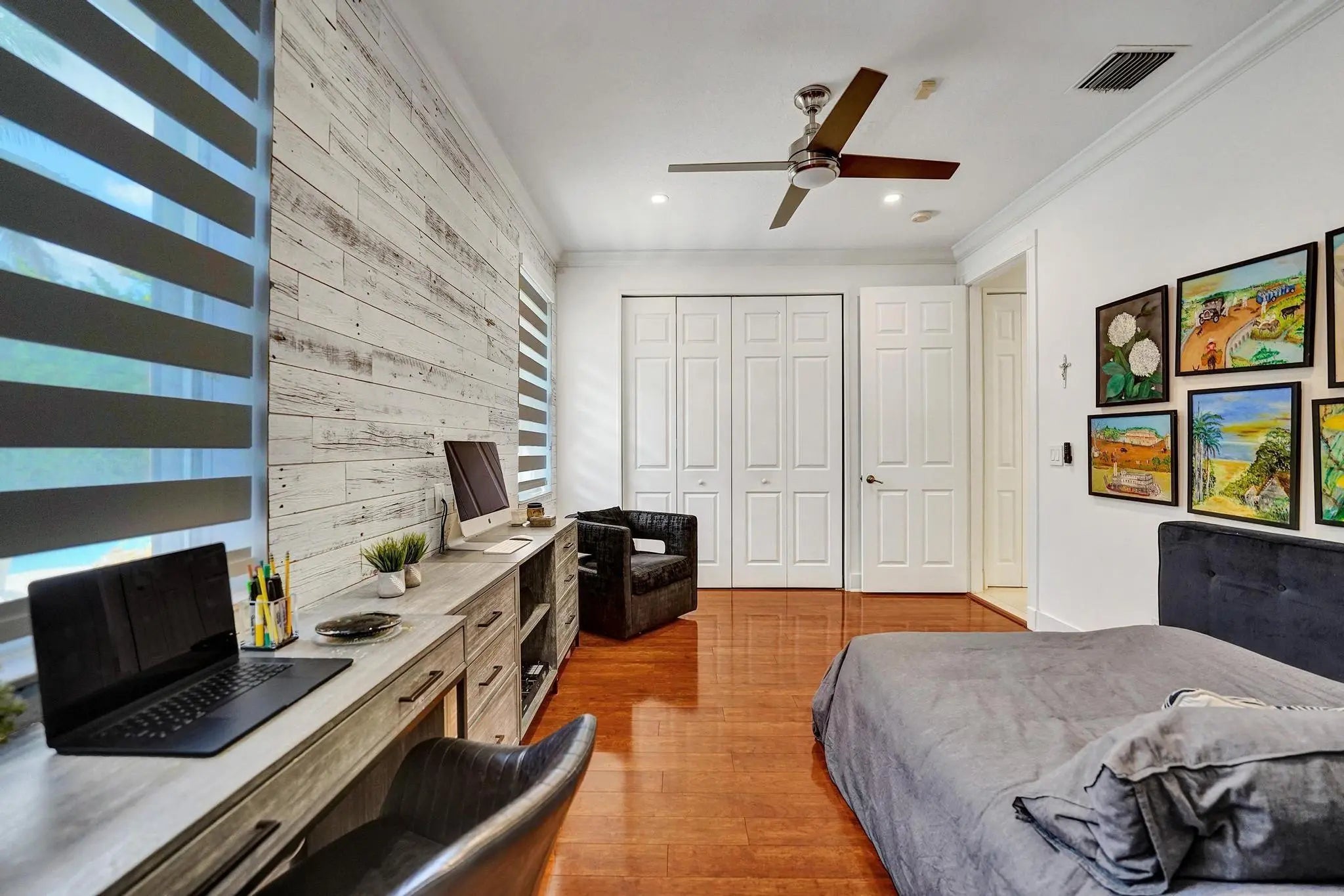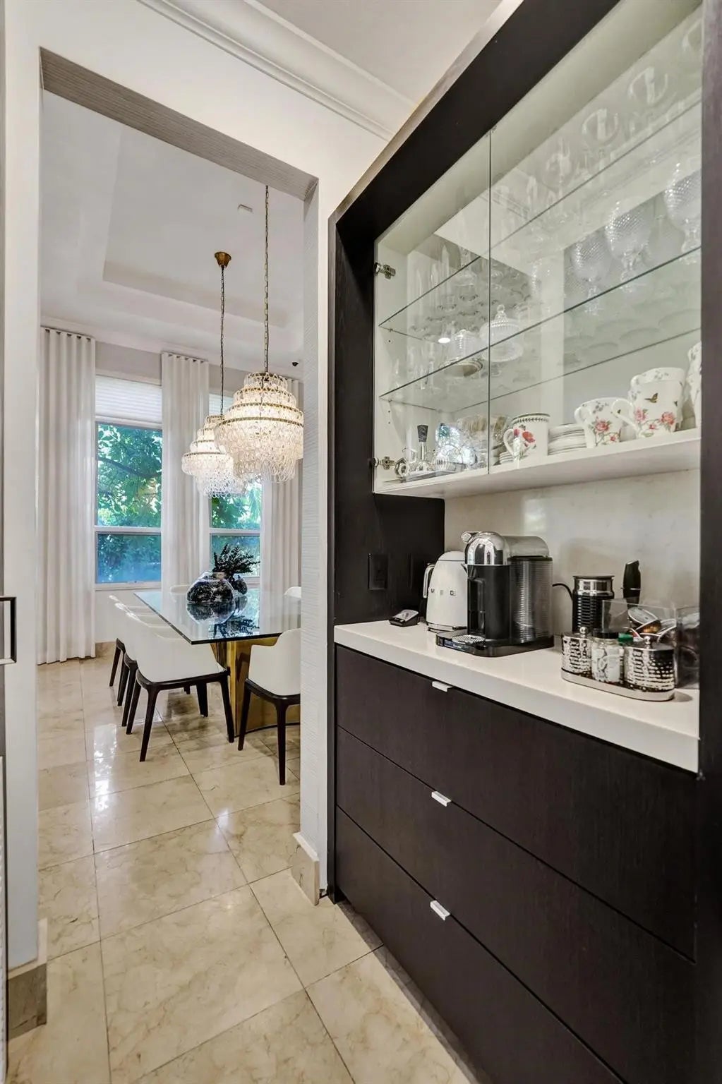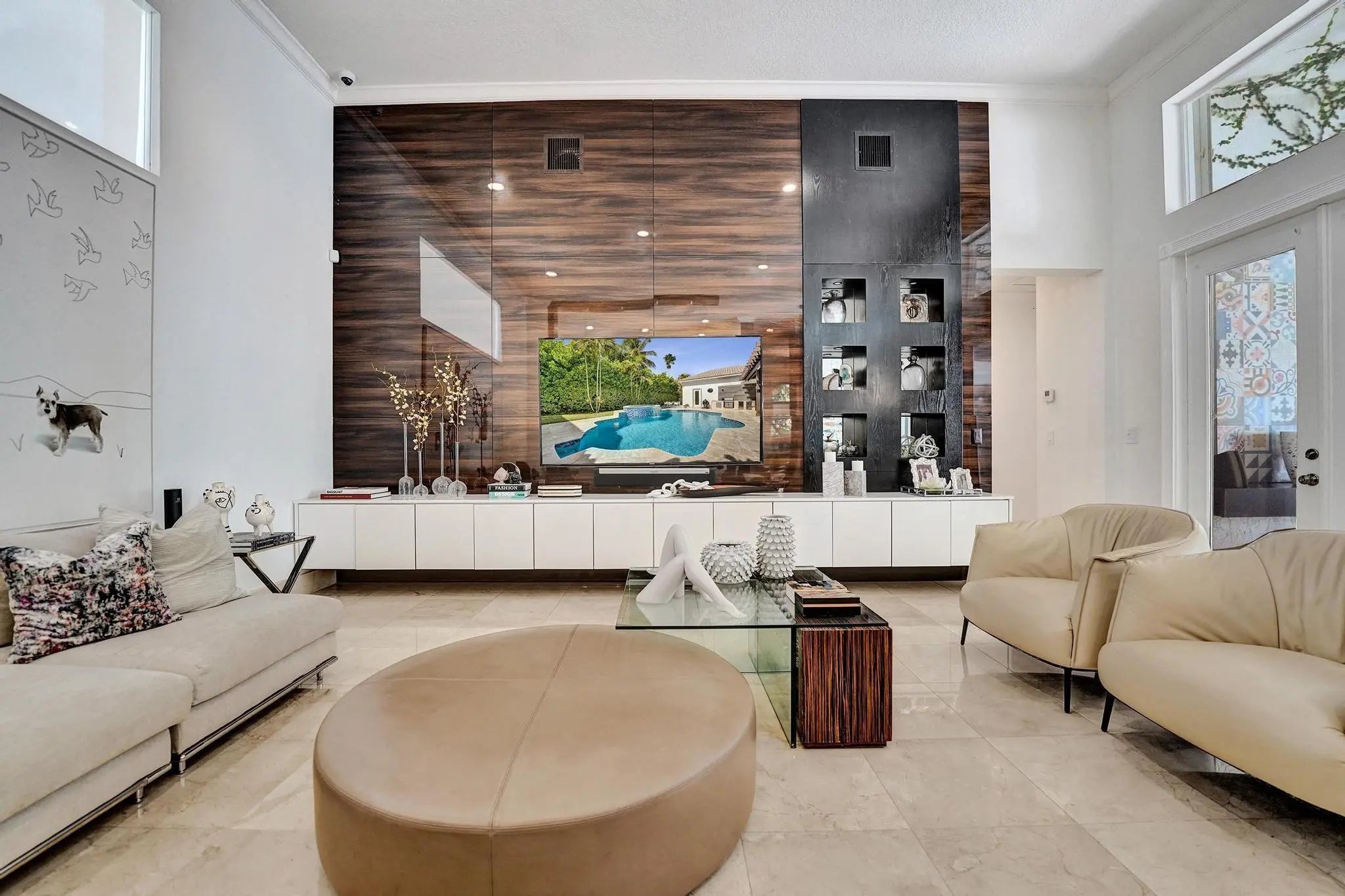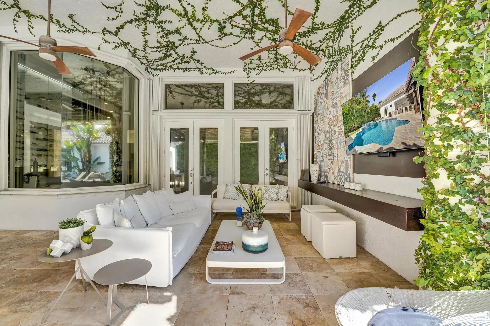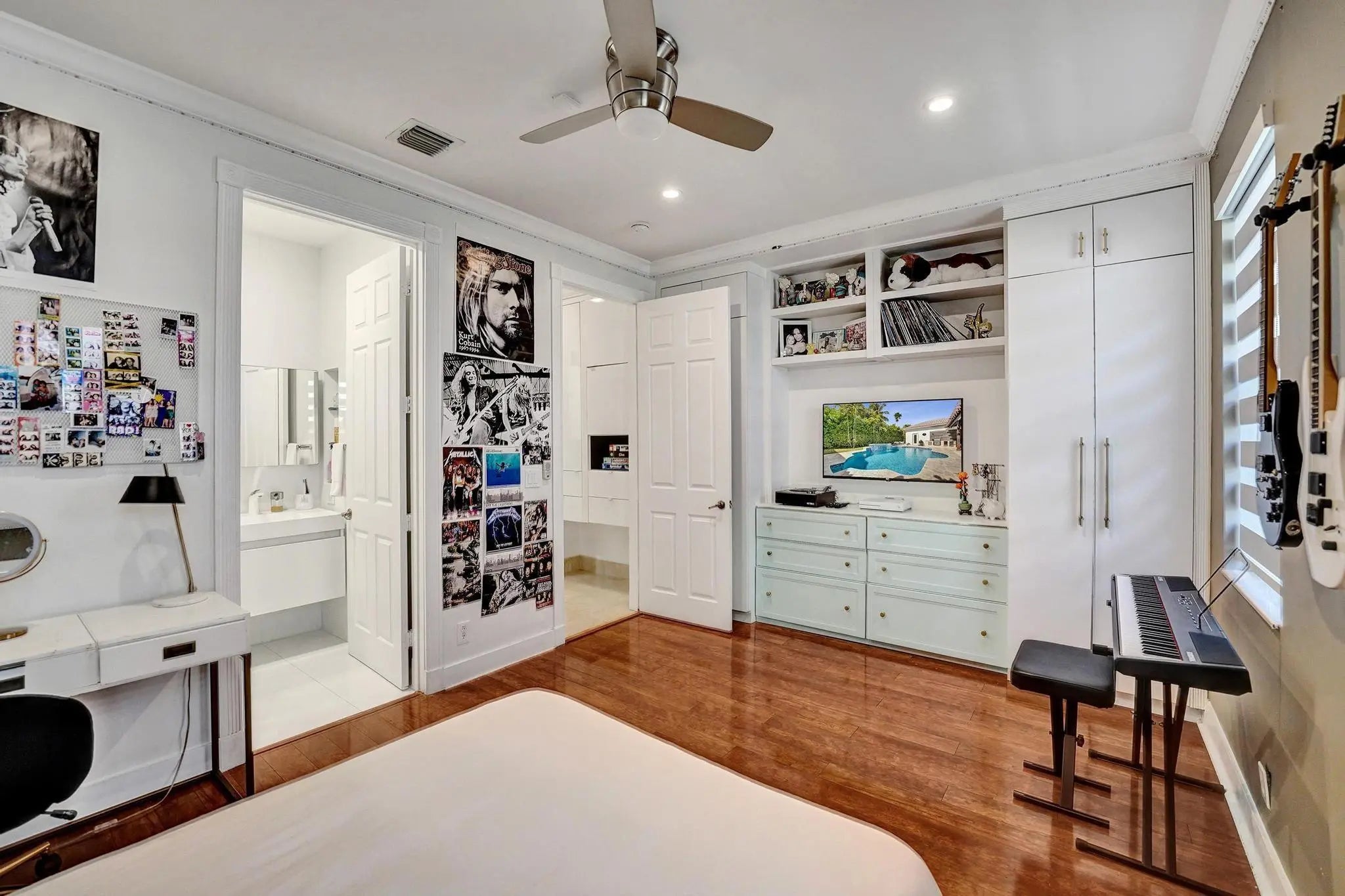 Very rare extended Courtyard Model with an expanded freestanding guest suite and built-in office. 4 bedrooms 4 1/2 baths with all bedrooms having en-suite bath. Home features include a stunning master bedroom with large sitting area, double ovens, crown molding, custom drapes, decorative wine storage wall, central vac, marble floors throughout, accordion hurricane shutters and more beautiful upgrades. Enjoy outdoor luxury with a covered patio, stunning heated pool with spa waterfall, sport court built in grill. This is a unique opportunity to own an upgraded and rare floorplan in the falls with access to a plethora of community amenities. Property is designer decorated with furniture negotiable.