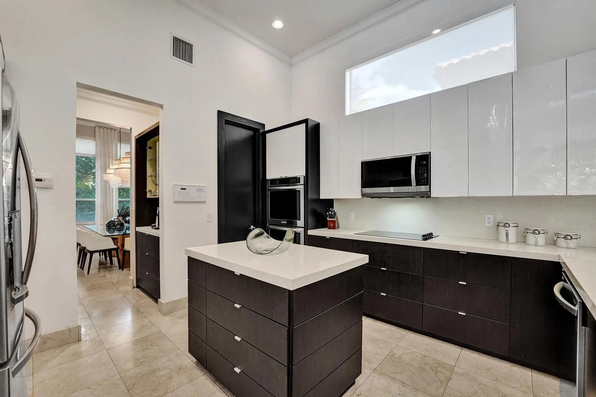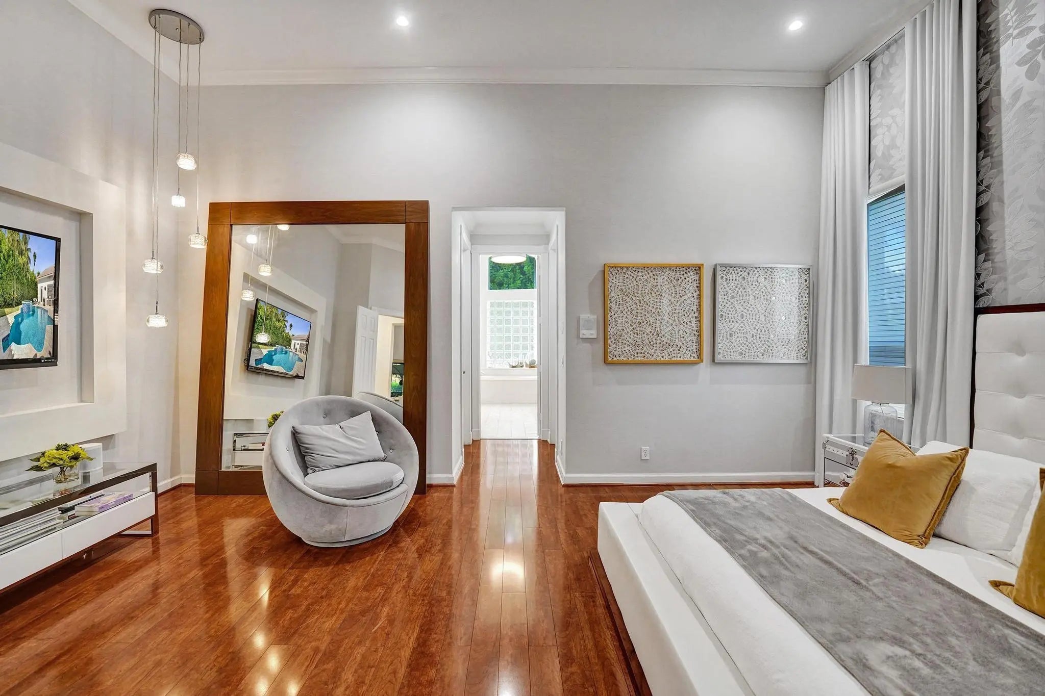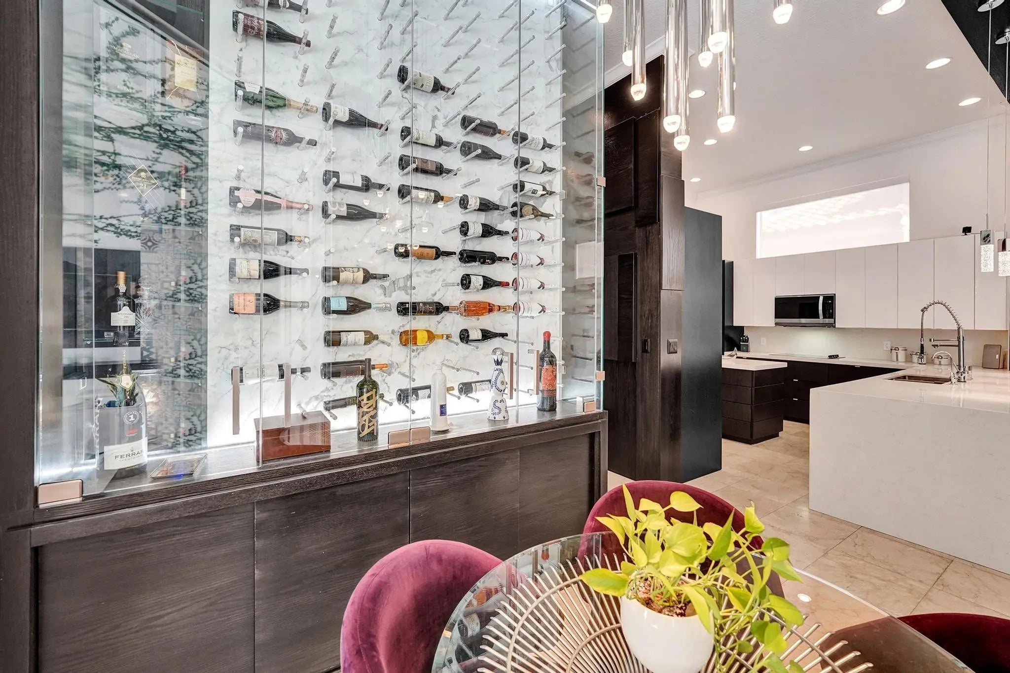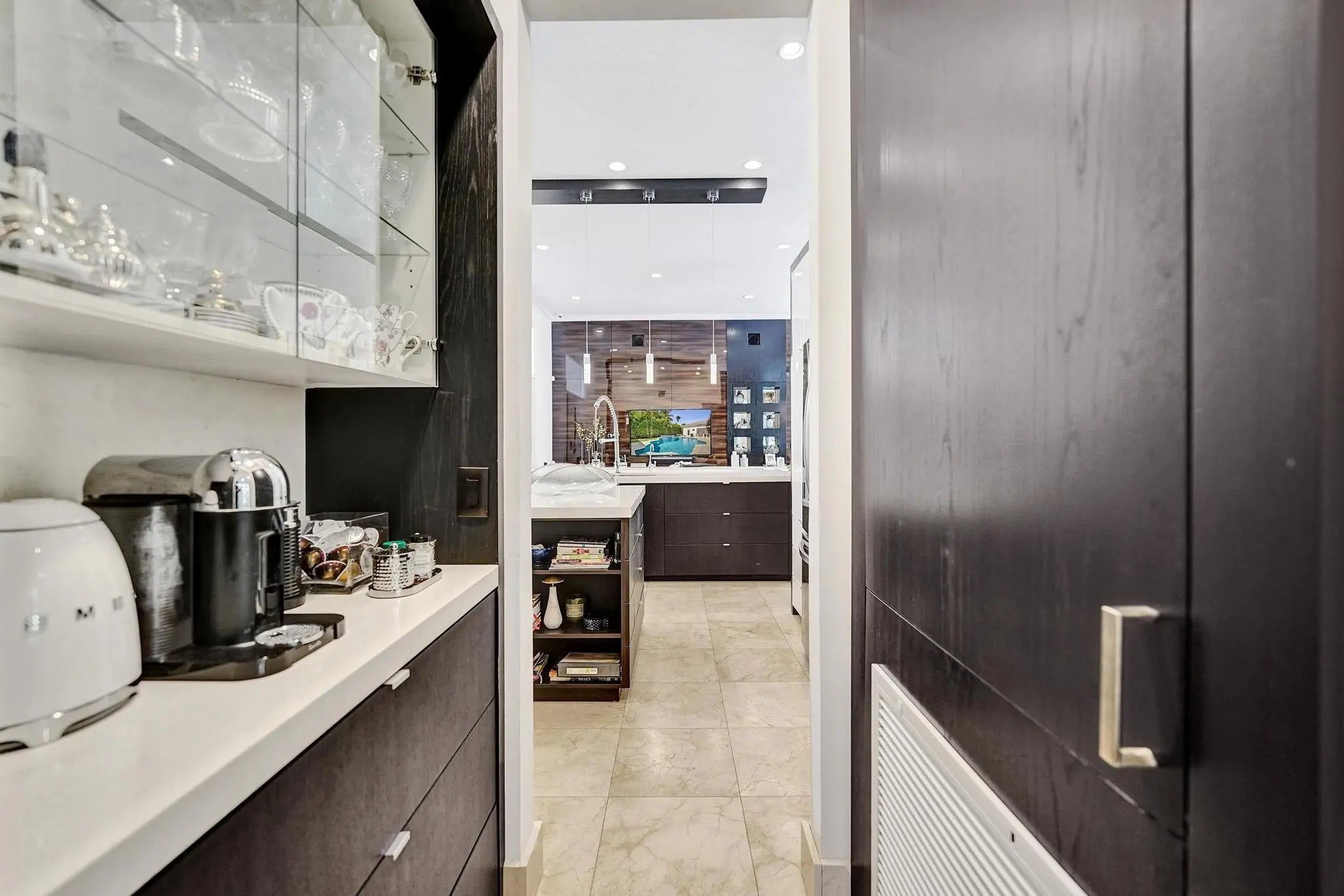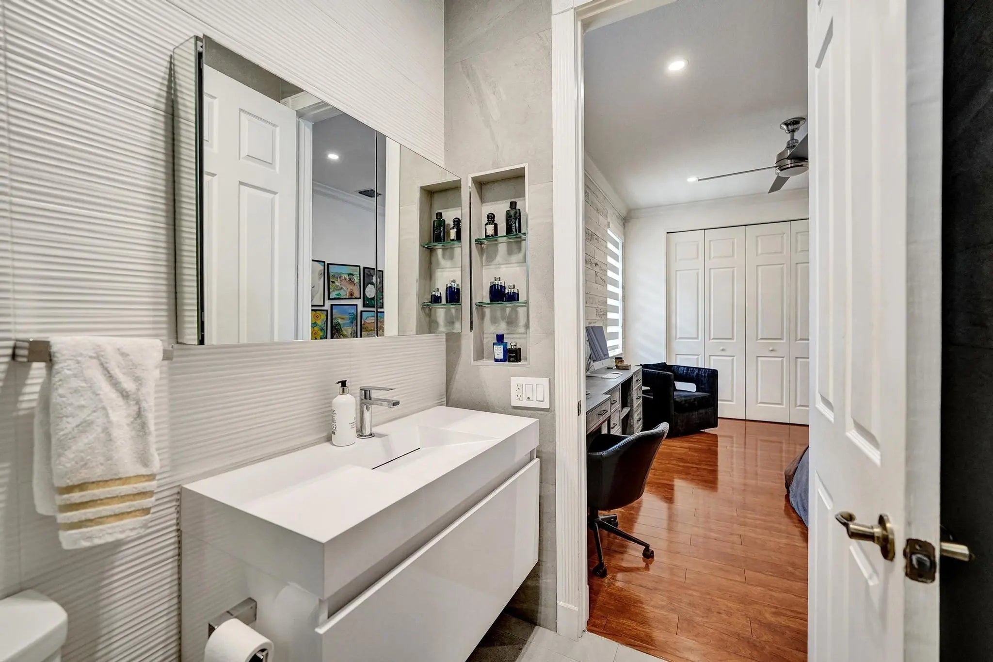 Very rare extended Courtyard Model with an expanded freestanding guest suite and built-in office. 4 bedrooms 4 1/2 baths with all bedrooms having en-suite bath. Home features include a stunning master bedroom with large sitting area, double ovens, crown molding, custom drapes, decorative wine storage wall, central vac, marble floors throughout, accordion hurricane shutters and more beautiful upgrades. Enjoy outdoor luxury with a covered patio, stunning heated pool with spa waterfall, sport court built in grill. This is a unique opportunity to own an upgraded and rare floorplan in the falls with access to a plethora of community amenities. Property is designer decorated with furniture negotiable.