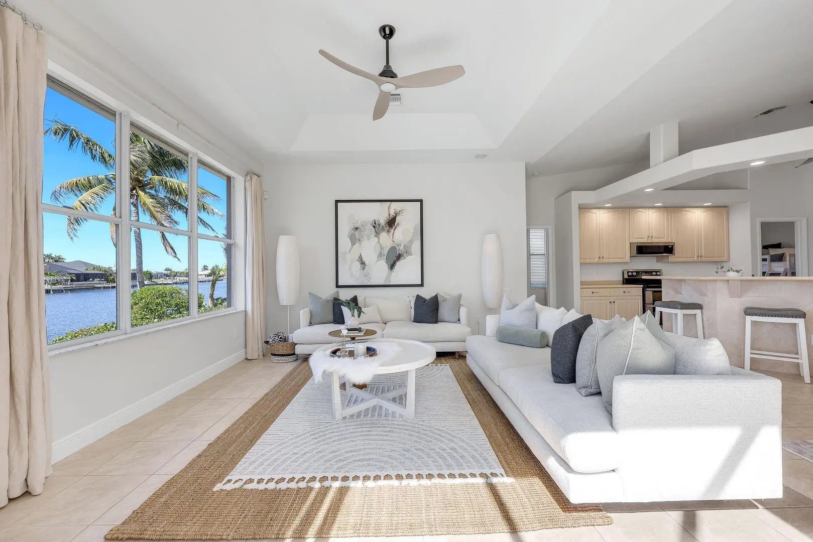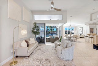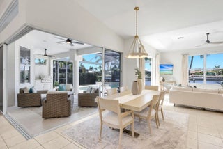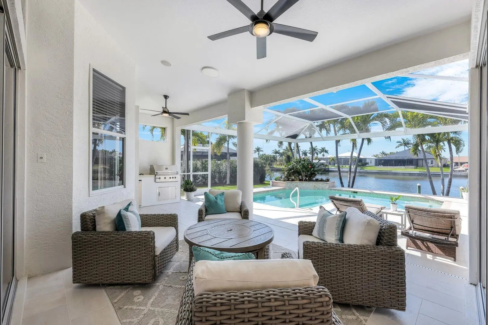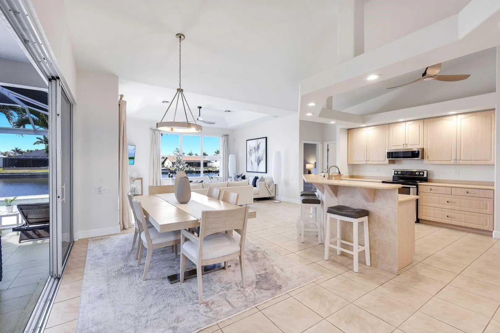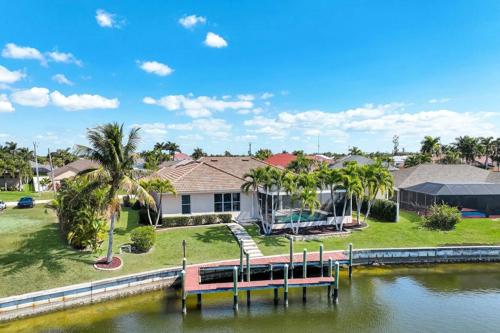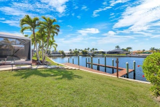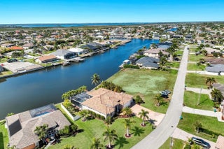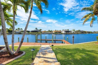 WESTERN EXPOSURE, GULF ACCESS, AND 240 FEET OF WIDE WATER VIEWS. Set on an oversized lot along a 240-ft-wide canal, this beautifully maintained home showcases a 2023 barrel tile roof, lush landscaping, lava rock with stamped concrete border, and an expansive driveway leading to a 3-car garage. Inside, French doors open to high ceilings, transom windows, tray detail, tile throughout, and 90-degree pocket sliders framing wide water views. The updated kitchen features new Whirlpool appliances with double ovens and a dry bar. The primary suite offers dual walk-in closets, fireplace, and spa bath. Enjoy a heated pool, new lanai, summer kitchen, and dock. Near Cape Harbour, Tarpon Point, dining, and shopping.