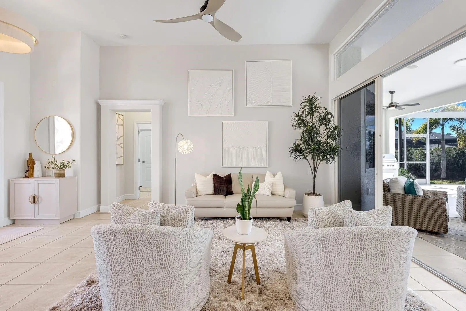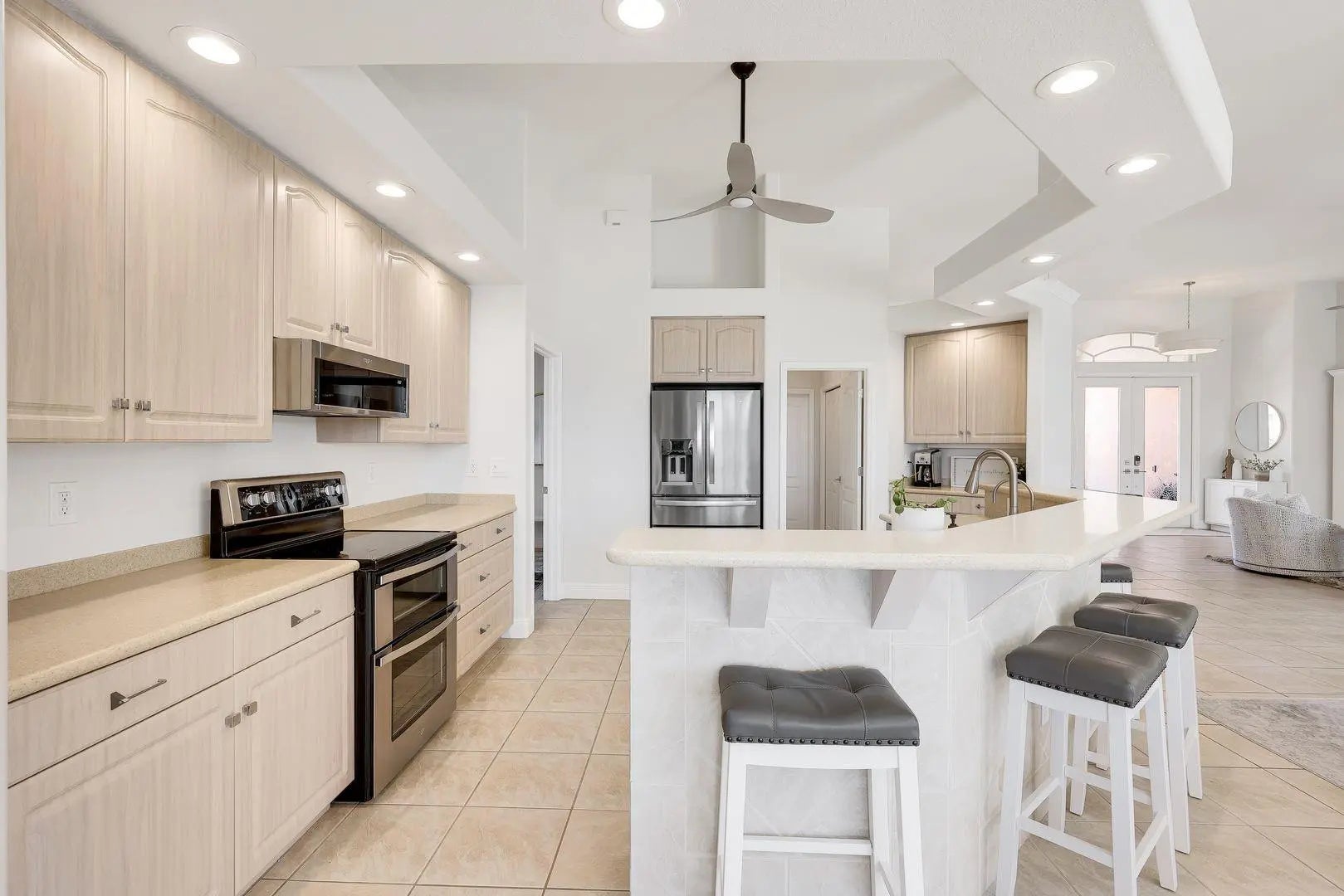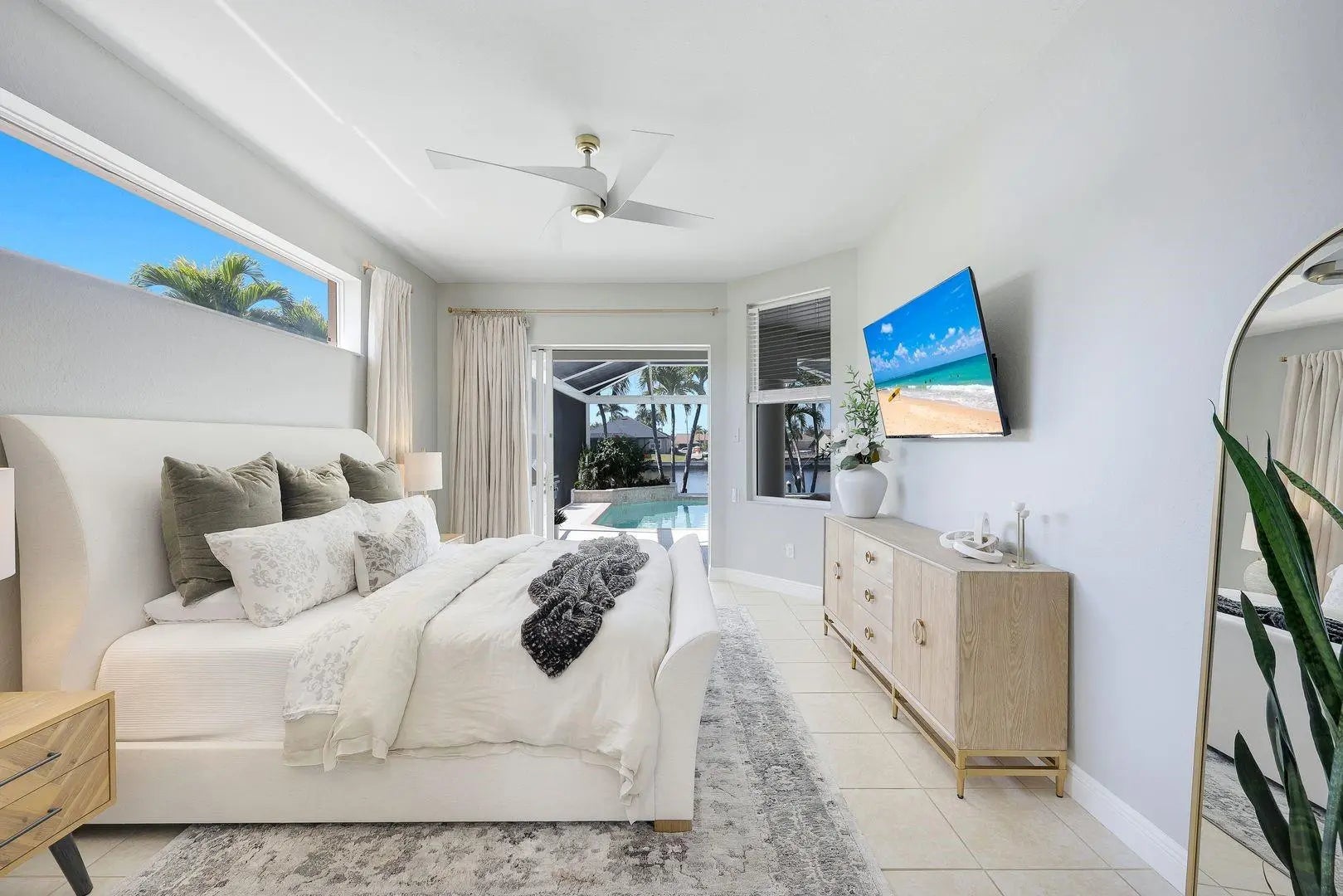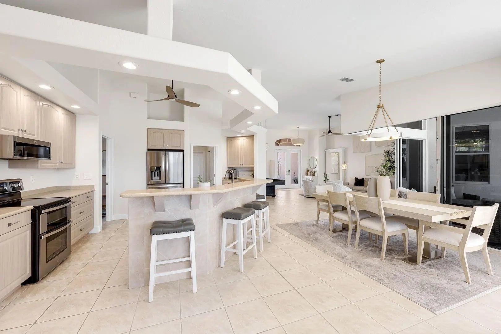 WESTERN EXPOSURE, GULF ACCESS, AND 240 FEET OF WIDE WATER VIEWS. Set on an oversized lot along a 240-ft-wide canal, this beautifully maintained home showcases a 2023 barrel tile roof, lush landscaping, lava rock with stamped concrete border, and an expansive driveway leading to a 3-car garage. Inside, French doors open to high ceilings, transom windows, tray detail, tile throughout, and 90-degree pocket sliders framing wide water views. The updated kitchen features new Whirlpool appliances with double ovens and a dry bar. The primary suite offers dual walk-in closets, fireplace, and spa bath. Enjoy a heated pool, new lanai, summer kitchen, and dock. Near Cape Harbour, Tarpon Point, dining, and shopping.