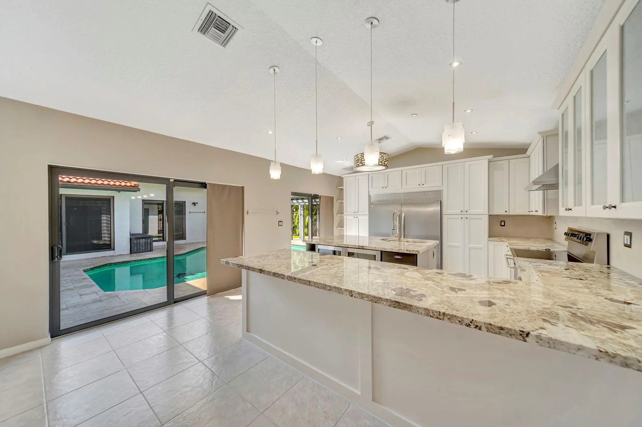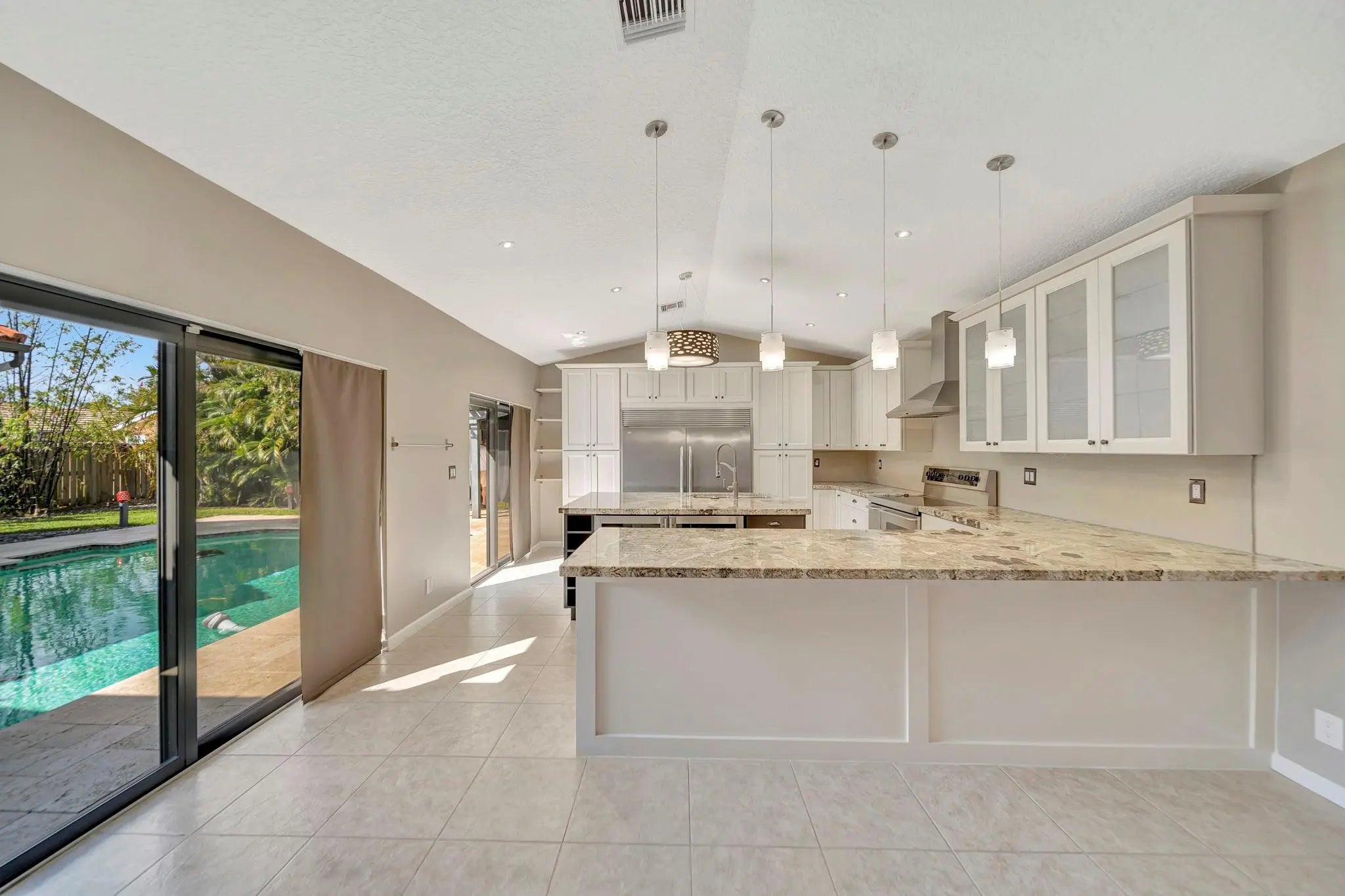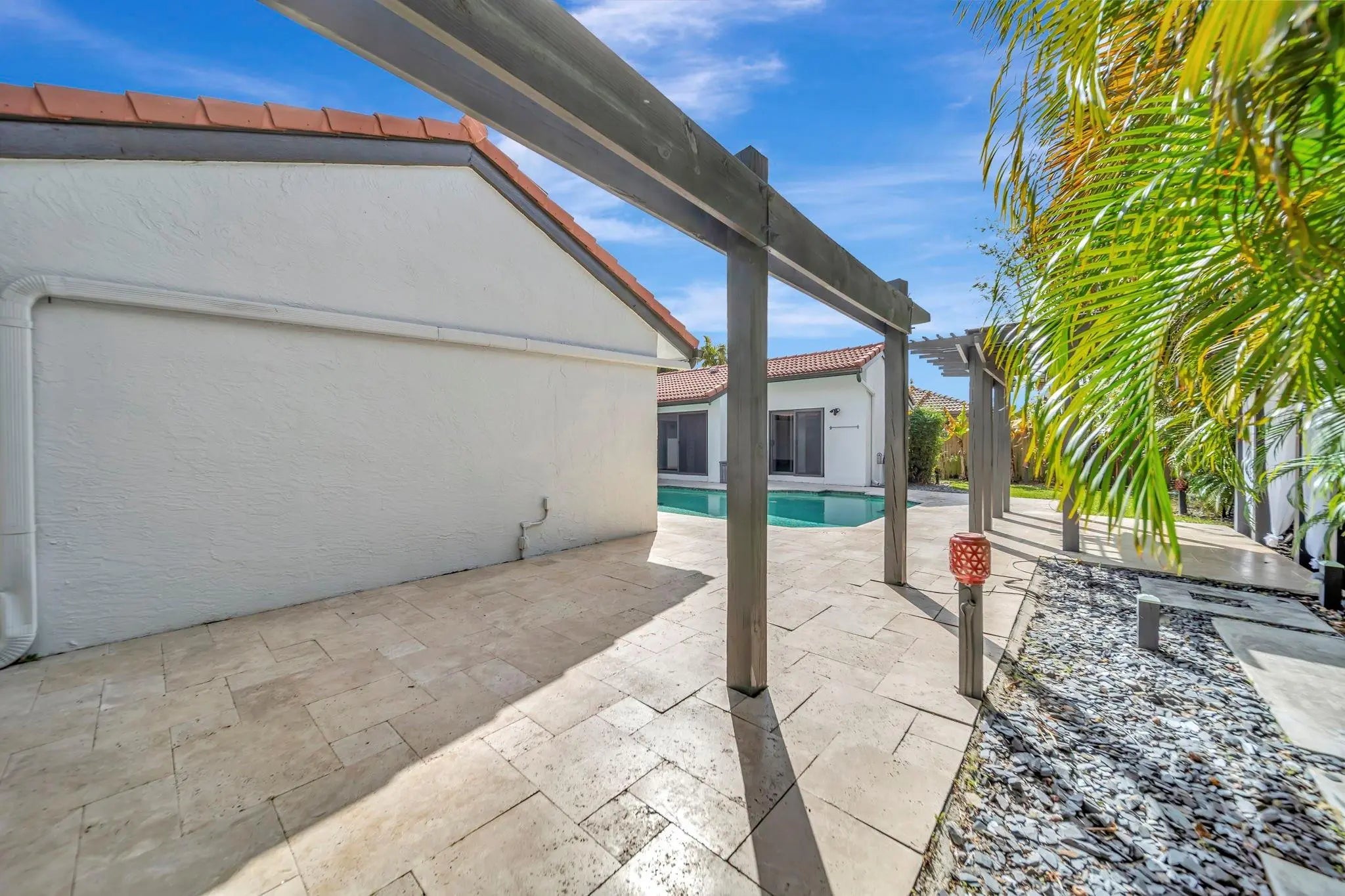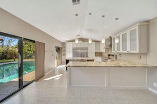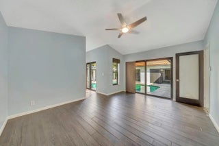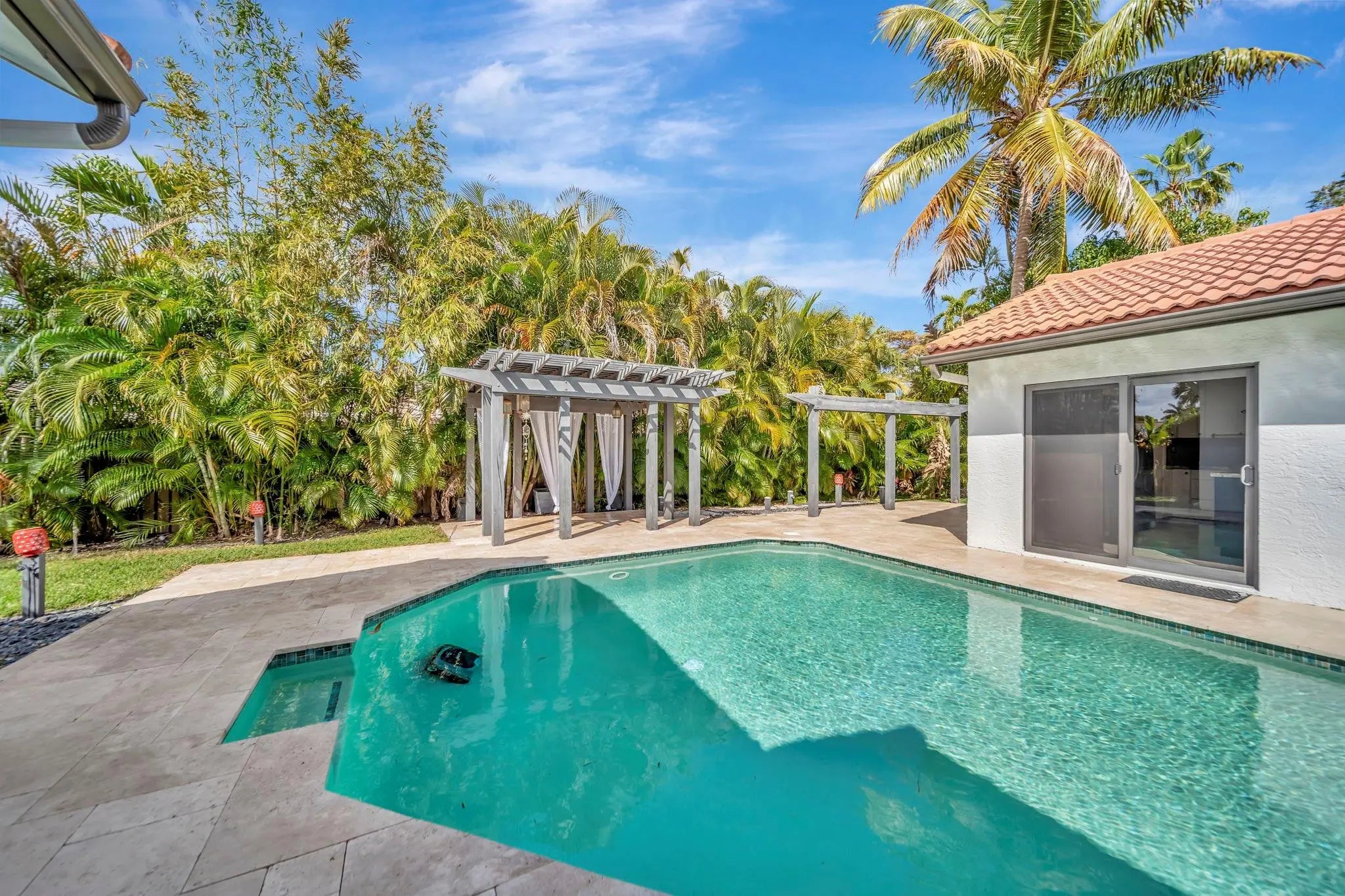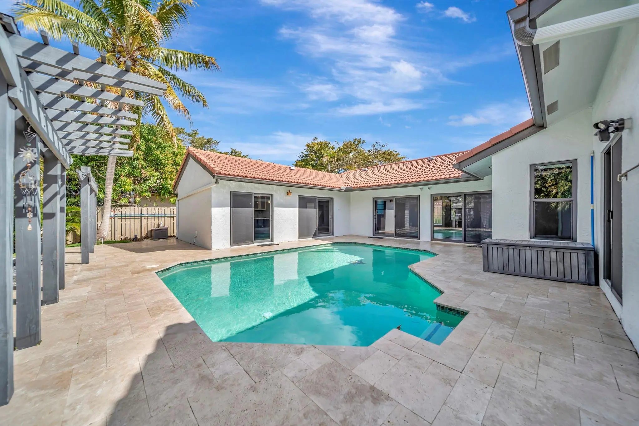 Beautiful 4/2 pool home on quiet cul-de-sac, offering perfect blend of style & functionality. Fully updated kitchen: open layout w/large center island, granite countertops, SS appliances, oversized double-door refrigerator, sleek oven w/vent hood & ample cabinetry. Tile throughout living area & new wood-like tile in bedrooms. Custom wet bar w/led lighting & ice fridge. Spa-inspired primary suite: stylish backsplash, designer vanity, led mirrors & seamless glass walk-in shower. Second bath updated: modern tile flooring, shower/tub combo & double-sink vanity. Travertine tile paved patio, resurfaced pool, stylish pergola & fruit trees creating outdoor retreat. Fully hurricane protected! Modern upgrades, thoughtful design & meticulous care make this home turnkey ready. Newer pool heater!