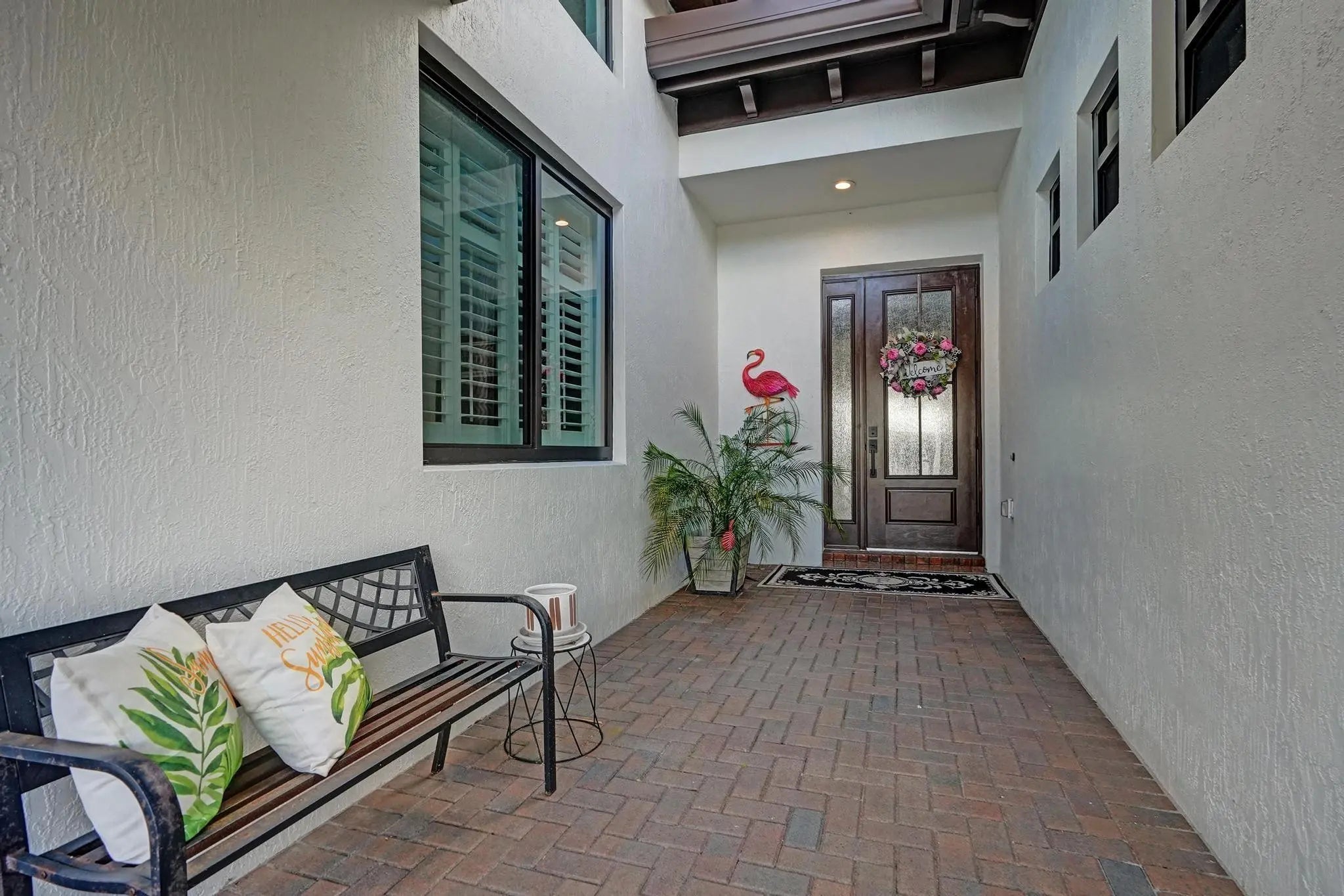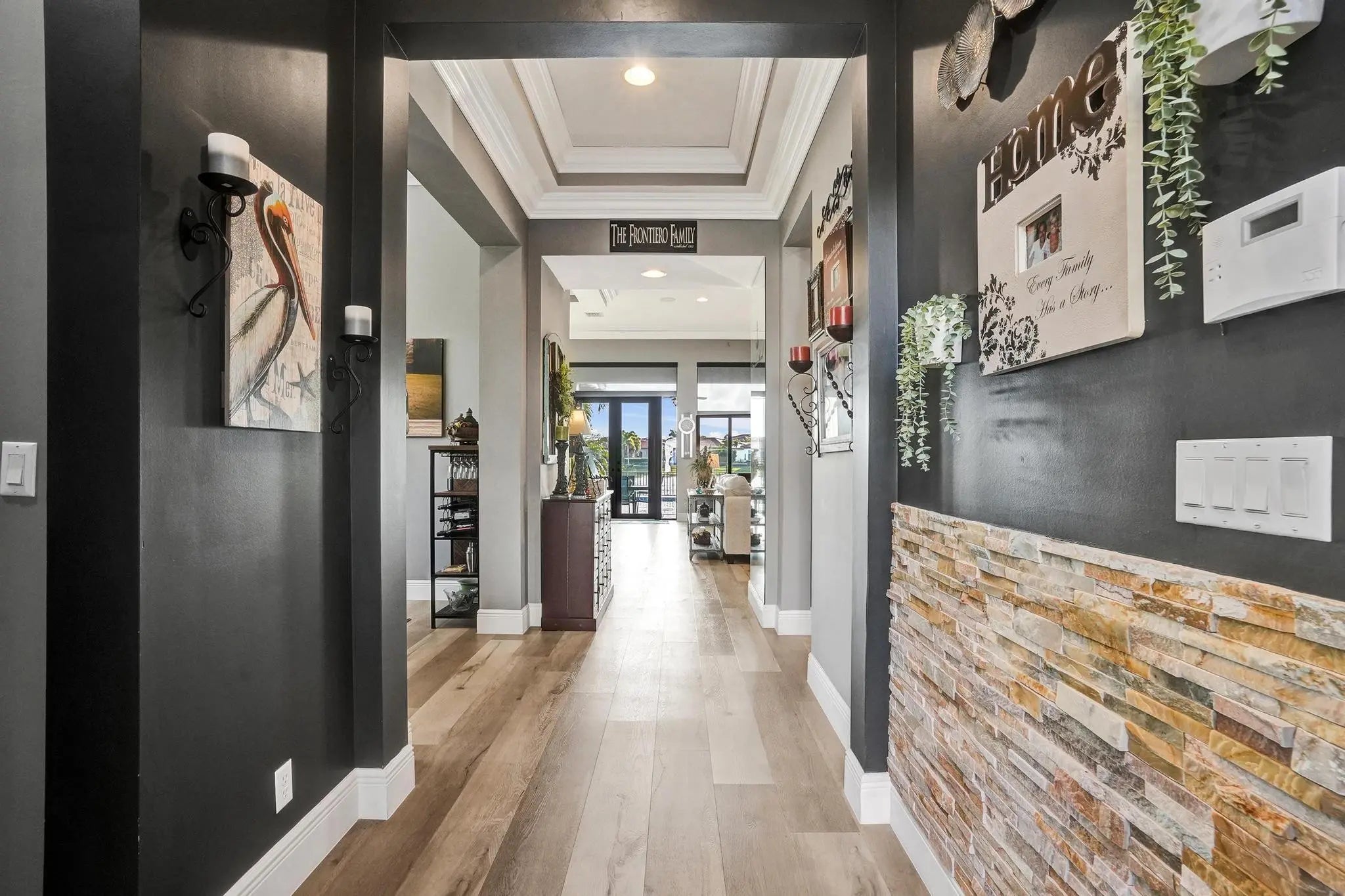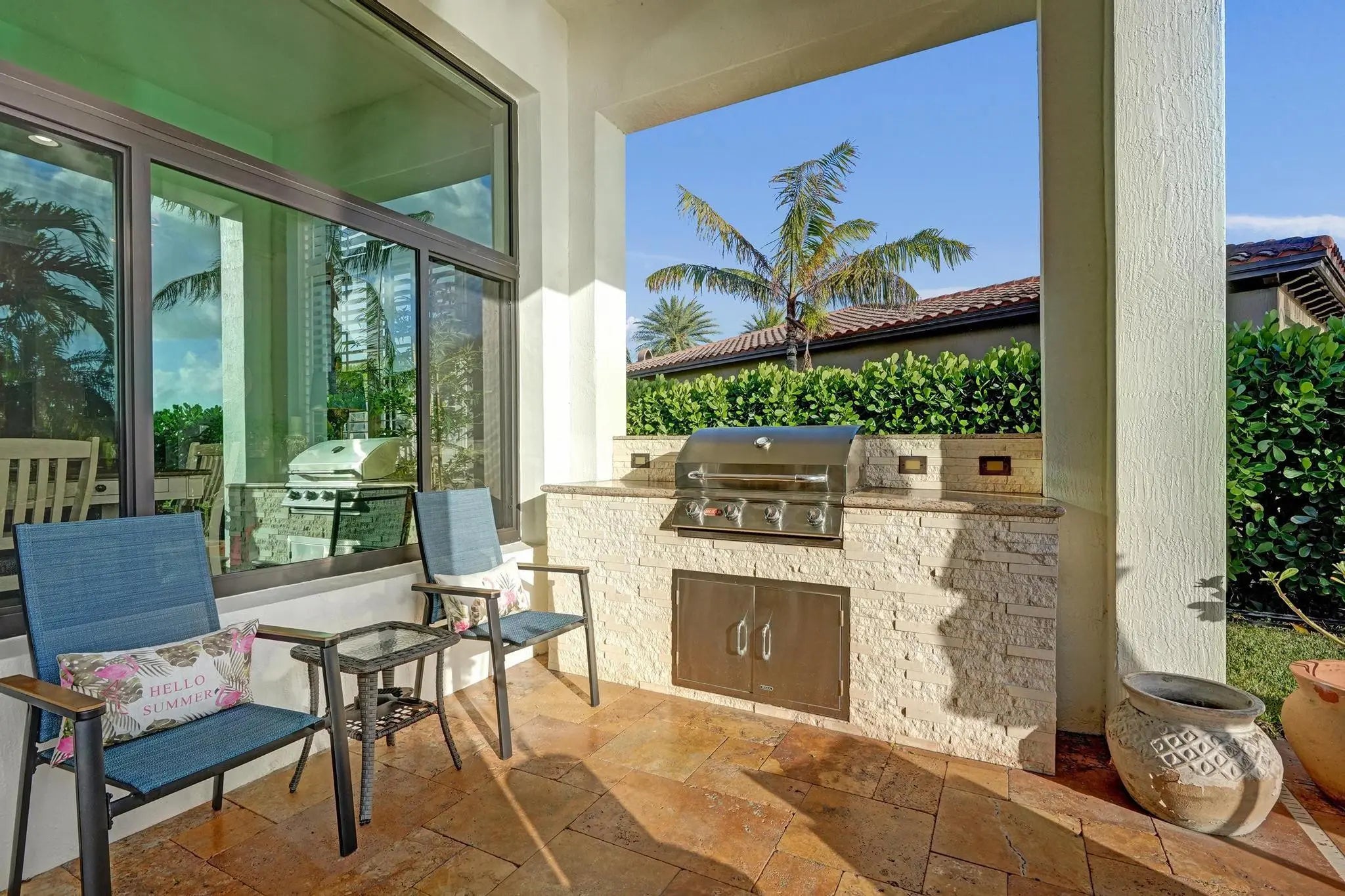 Stunning 4-bedroom, 3-bath, 3-car garage single-story home situated on a spectacular resort-style, fully fenced pie-shaped lakefront lot. Enjoy South Florida living at its finest with a new salt-chlorinated pool featuring fiber optic lighting, a rock waterfall, tiki hut, built-in summer kitchen with BBQ grill, travertine deck, impact windows and sliders. Inside, this beautifully upgraded home offers luxury vinyl flooring, plantation shutters, double coffered ceilings, and crown molding throughout. The luxurious primary suite and all bathrooms have been remodeled with deluxe finishes. The gourmet granite kitchen features solid wood cabinetry, stainless steel appliances, double ovens, spacious entertaining island. Located in prestigious Heron Bay with fabulous resort-style amenities.