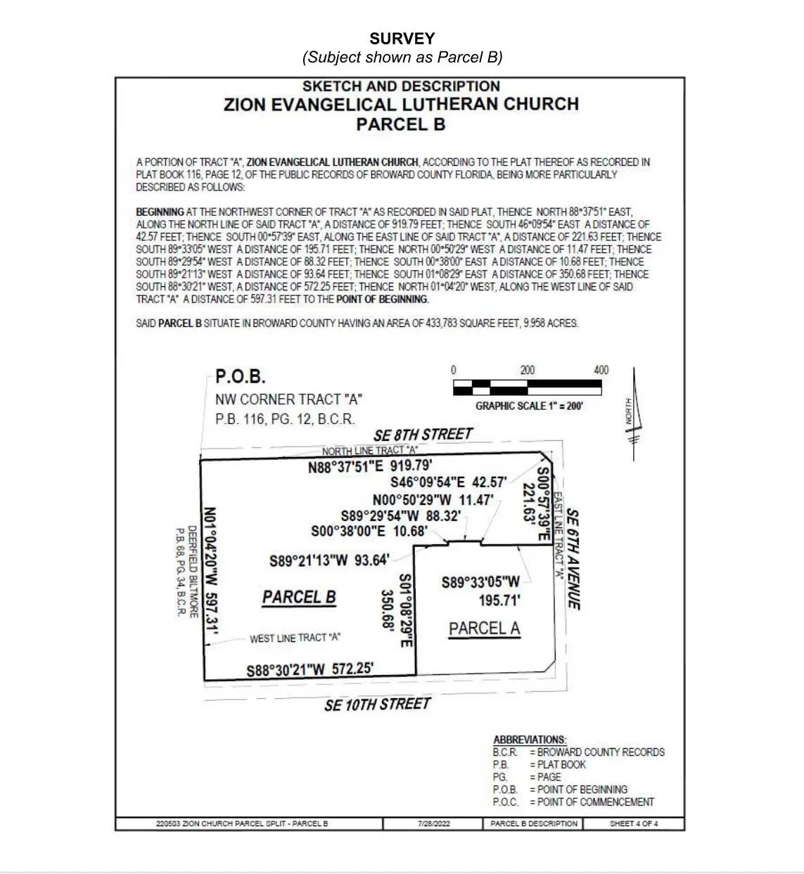 Extremely Rare Opportunity to purchase a +/- 10-acre High School campus in NE Broward County. 3 buildings totaling +/- 62,096 sf, + 1, 1440sf Portable building. Total of 35 classrooms including science & computer labs. 2-story gymnasium building with stage, cafeteria, commercial kitchen, offices, lounge, lockers, weight & training rooms, etc. Grounds have a football/soccer field, tennis, basketball and sand volleyball courts, baseball & softball diamonds and a playground/park. +/- 600 Student capacity. Over 570 ff on SE 10th St, signalized corner at SE 6th Ave. Minutes from many UHNW communities. Click on ''More'' for additional information. Site: 9.96 Acres 433,783sf CF Zoning -Community Facility Flood Zone AH +/- 573' on SE 10th St +/- 245' on SE 6th Ave Signalized Light Campus: 3 Masonry Buildings +/-62,096 adj sf 1 Portable Building +/- 600 Student Capacity 35 classrooms (incl. art, computer, and science labs) & media room. N Building: 16,400sf adj sf built in 1966 14 classrooms, media center teacher's lounge, offices and restrooms, copy room, restrooms S Building: 4260 adj sf built in 1966 4 classrooms and maintenance area w/office Portable Building: 1440sf 2 classrooms Gymnasium Building: +/- 41,436 adj sf built in 1984 15 classrooms (incl, science and computer labs), offices, stage, cafeteria, kitchen, weight room, training room, boys/girls locker rooms, refrigeration and storage rooms. Grounds: Football/soccer field, softball and baseball diamonds, 2 tennis courts, 2 basketball courts, 1 sand volleyball court, playground/park 60 dedicated parking spots plus cross access/parking agreement with Zion Lutheran. Tenant: Somerset Academy Key Middle/High School Irreplaceable location: 1.3 miles to I-95 2 miles to Boca Raton 2.4 miles to Lighthouse Point 4 miles to Hillsboro Mile 6.5 miles to Parkland 11 Miles to Delray Beach 14 miles to Fort Lauderdale Terms: Sold "As Is" subject to Buyer's inspections Existing CF zoning - Seller will not consider any offer subject to a change in zoning No Financing Contingencies Somerset Academy tenancy Shared access/parking agreement. Please allow +/- 3 weeks for offer response time. POF Letter to accompany all offers. *Zion Lutheran Church and Preschool are not part of +/- 10-acre school campus sale and will not consider any offer to purchase which includes either the church and/or preschool. All information is believed accurate but is not guaranteed and may be subject to errors and omissions and subject to changes without notice. All measurements are approximate.