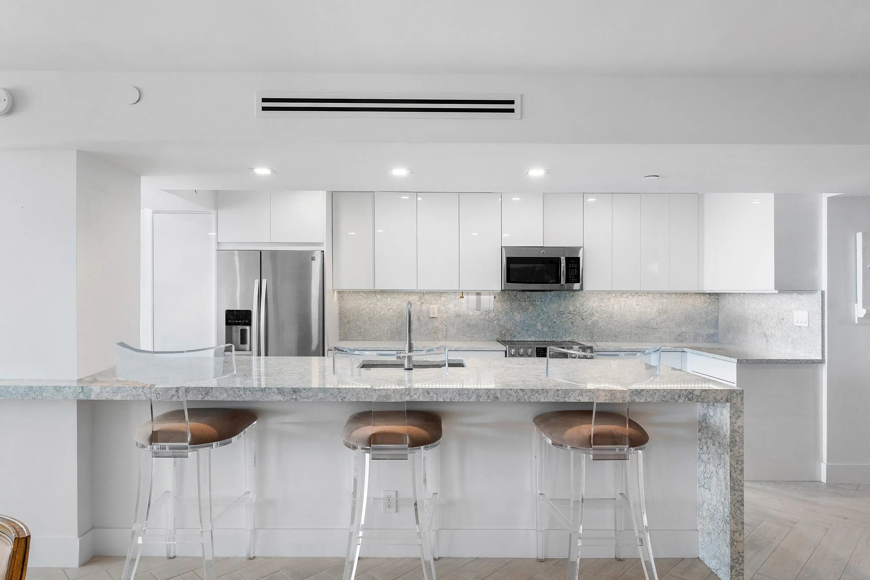 Enter into coastal modern luxury with this fully renovated 2,400sqft, 2-bedroom, 2.5-bathroom oceanfront residence at the exclusive 3600 S Ocean. Accessible via a private elevator entrance, this elegantly designed condo boasts breathtaking direct ocean views to the east and serene sunset vistas to the west from its ultra-large private balconies. The open-concept kitchen w/ ultra-long island and great room are an entertainer's dream, featuring detailed quartz countertops, high-end appliances, a wet bar, and a wine fridge. The residence showcases chevron wood tile flooring throughout, impact glass windows, fitted walk-in closets, and spa-inspired bathrooms. Additional conveniences include an in-unit washer/dryer and two covered parking spaces. Enjoy resort-style living with an oceanfront... pool, fitness center, and private beach access in this boutique building. Located moments from Eau Palm Beach, the Four Seasons, premier shopping, and dining, with easy access to PBI Airport and Downtown West Palm Beach. Luxury coastal living at its finest.