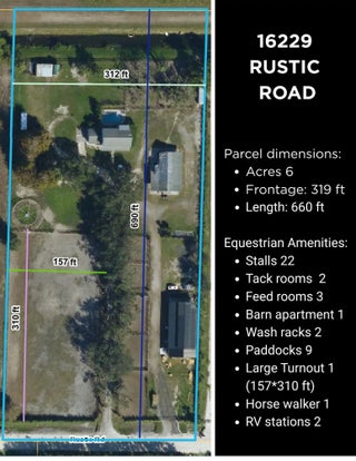 EXCEPTIONAL TURNKEY EQUESTRIAN FACILITY ON 6 ACRES IN RUSTIC RANCHES ESTATES Beautiful equestrian property offering privacy, charm, and functionality in the heart of Rustic Ranches. Walking distance to Wellington's Environmental Preserve and just a short hack to top Wellington shows, with miles of trails at your doorstep. The 4BD/2.5BA home features 2,288 sq ft under air, a garage, pool, and outdoor spaces. Equestrian amenities include 2 new barns (22 stalls), groom's quarters, a horse walker, 7 paddocks, a large field, and room for a riding arena. High and dry property with drainage, public and well water, irrigation, double-fencing, mature oaks, and more. Move-in ready! A MUST-SEE for the discerning equestrian seeking a move-in-ready facility in the heart of Wellington.