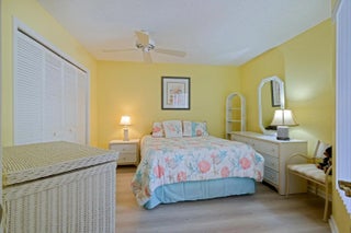 This updated two-bedroom, two-bathroom condo in Montego Cove, a 55-plus community, features a spacious courtyard patio and an enclosed porch with lake views. Inside, you'll find newer LVT flooring, an updated kitchen with granite countertops, and a generous living and dining area. The primary suite has walk-in closets, and there's storm protection with accordion hurricane shutters. Community amenities include two swimming pools, tennis and pickleball courts, and a clubhouse for social activities. Conveniently located near downtown Stuart, US-1 shopping, local beaches, and medical facilities.