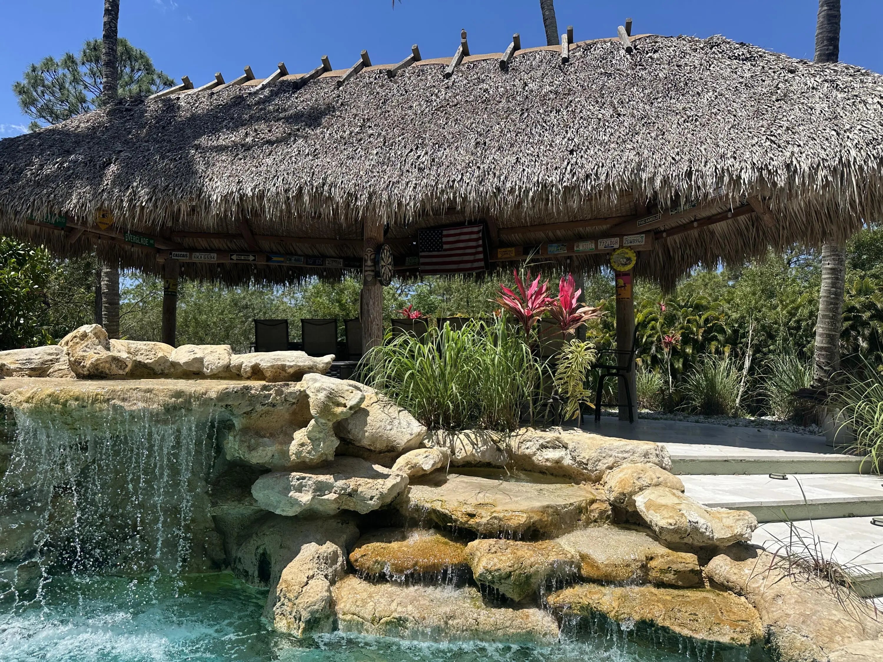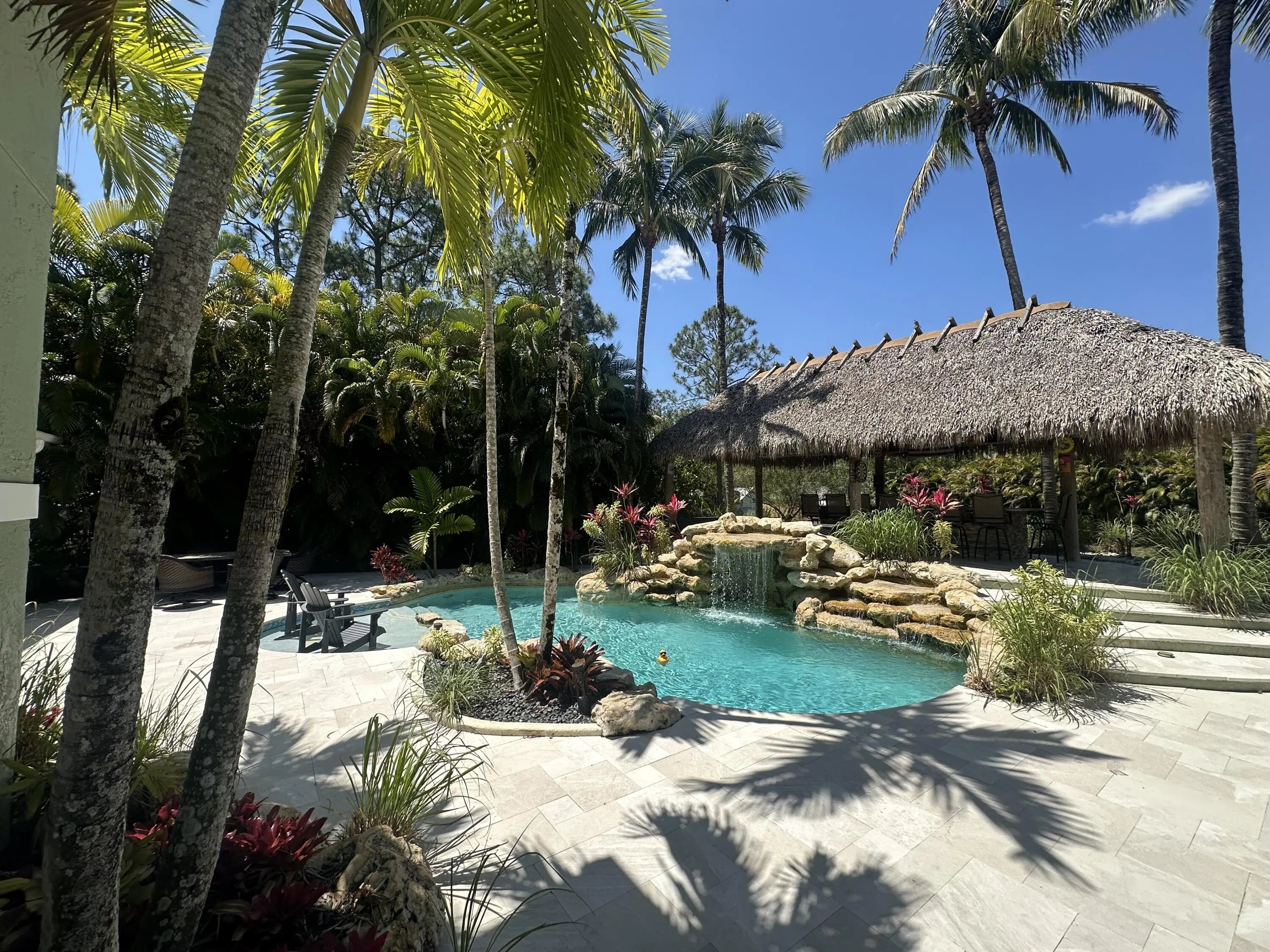 Exquisite Jupiter Farms Estate! Own a slice of tropical paradise in the prestigious Jupiter Farms community. This fully furnished 4-bedroom, 2.5-bathroom custom masterpiece redefines luxury living, blending unparalleled elegance with the laid-back allure of a private oasis. Tropical Haven: Indulge in a Margaritaville-inspired backyard with a sparkling pool, custom tiki bar, and shaded tiki hut—perfect for lavish entertaining.Spacious Elegance: Four expansive bedrooms and 2.5 spa-like bathrooms, complemented by impact windows/doors for security and sophistication.Versatile Retreat: Fully air-conditioned detached garage, ideal as a guest suite, executive office, or studio.No HOA=Freedom: Embrace unrestricted luxury in this AG/Residential enclave.RV/Boat Paradise: Pad with 30&50 amp