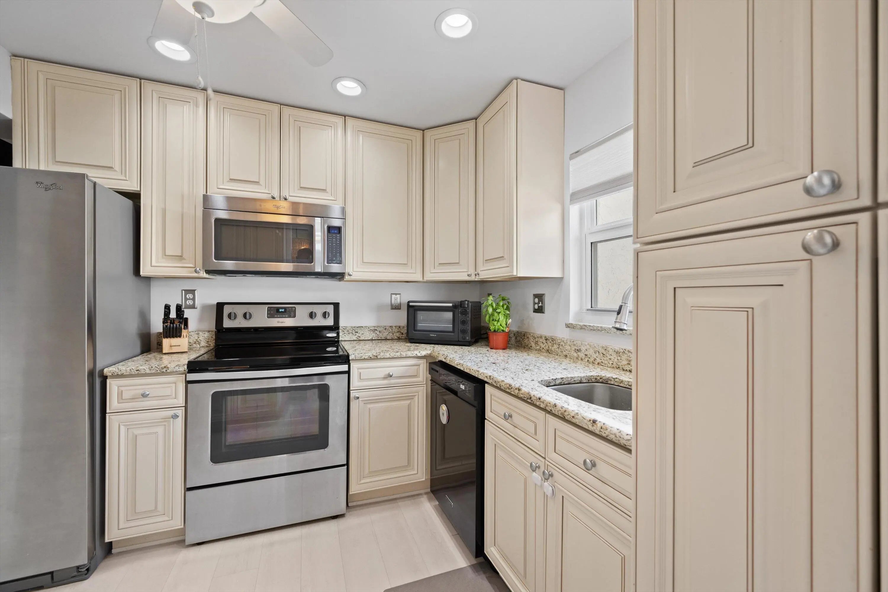 Welcome to coastal living at its finest with direct beach access! Nestled in the heart of South Palm Beach, this stunning condo offers an open and airy layout with southeastern exposure. The unit features three spacious bedrooms, including a primary ensuite, providing both comfort and style. Custom-fitted closets provide ample storage space, ensuring an organized and clutter-free home. The living area boasts recently remodeled and permitted bathrooms, updated electrical panel. new laminate flooring, lighting, fresh paint, and hurricane impact windows fitted with hurricane shutters on the patio for peace of mind. Kitchen is equipped with stainless steel appliances and roll-out shelving in the pantry fitted with real wood cabinetry. Professionally decorated, furnishings negotiable.