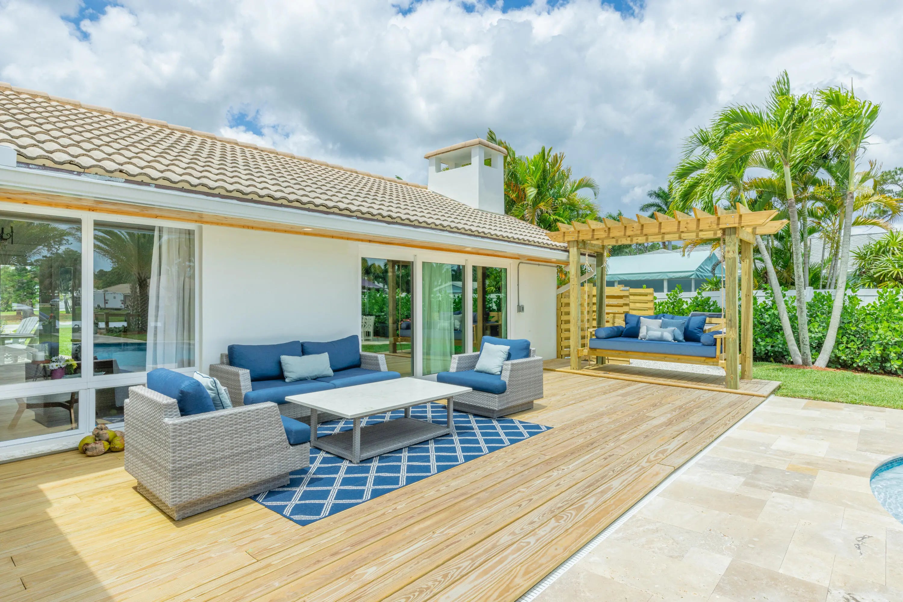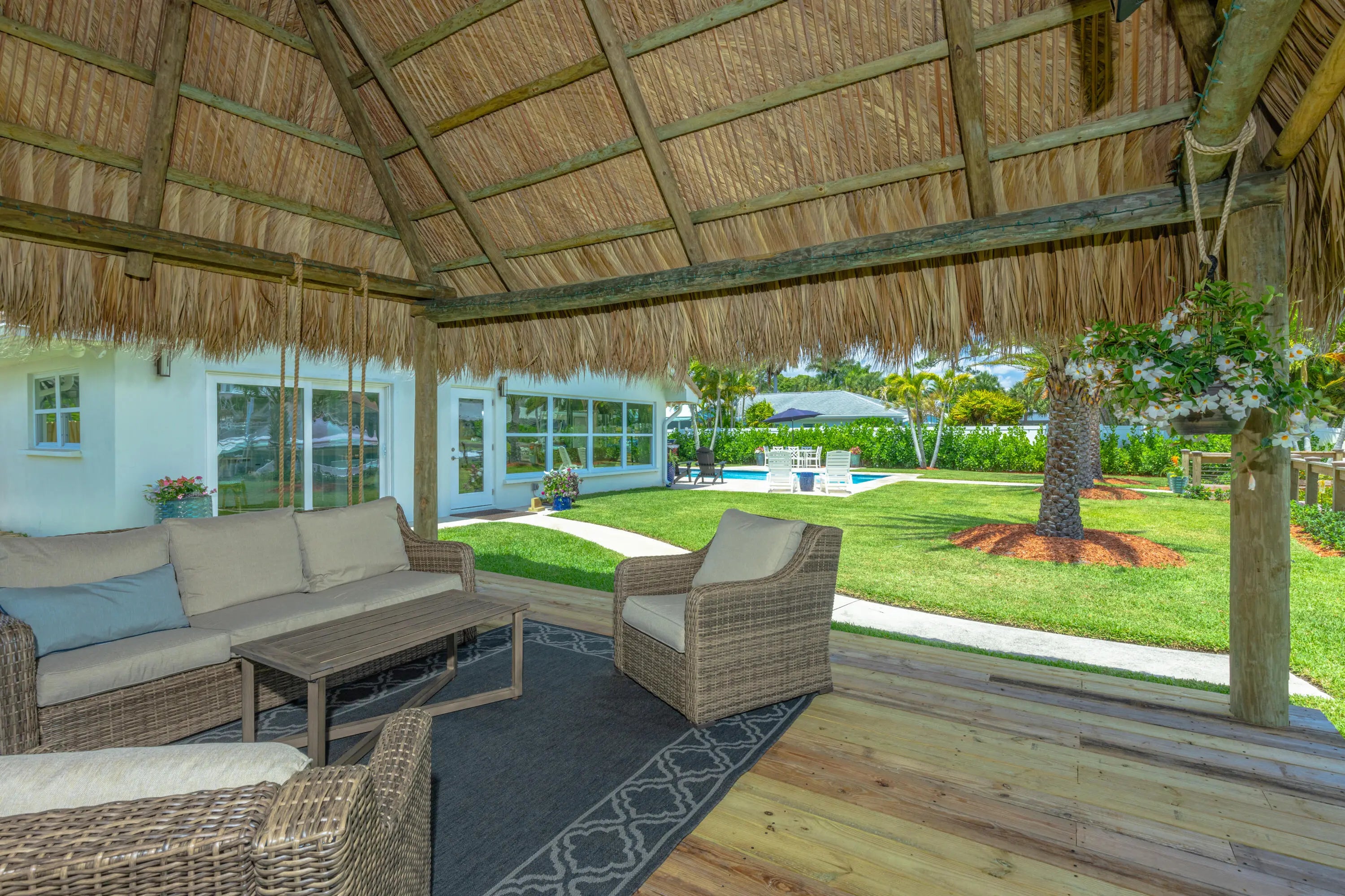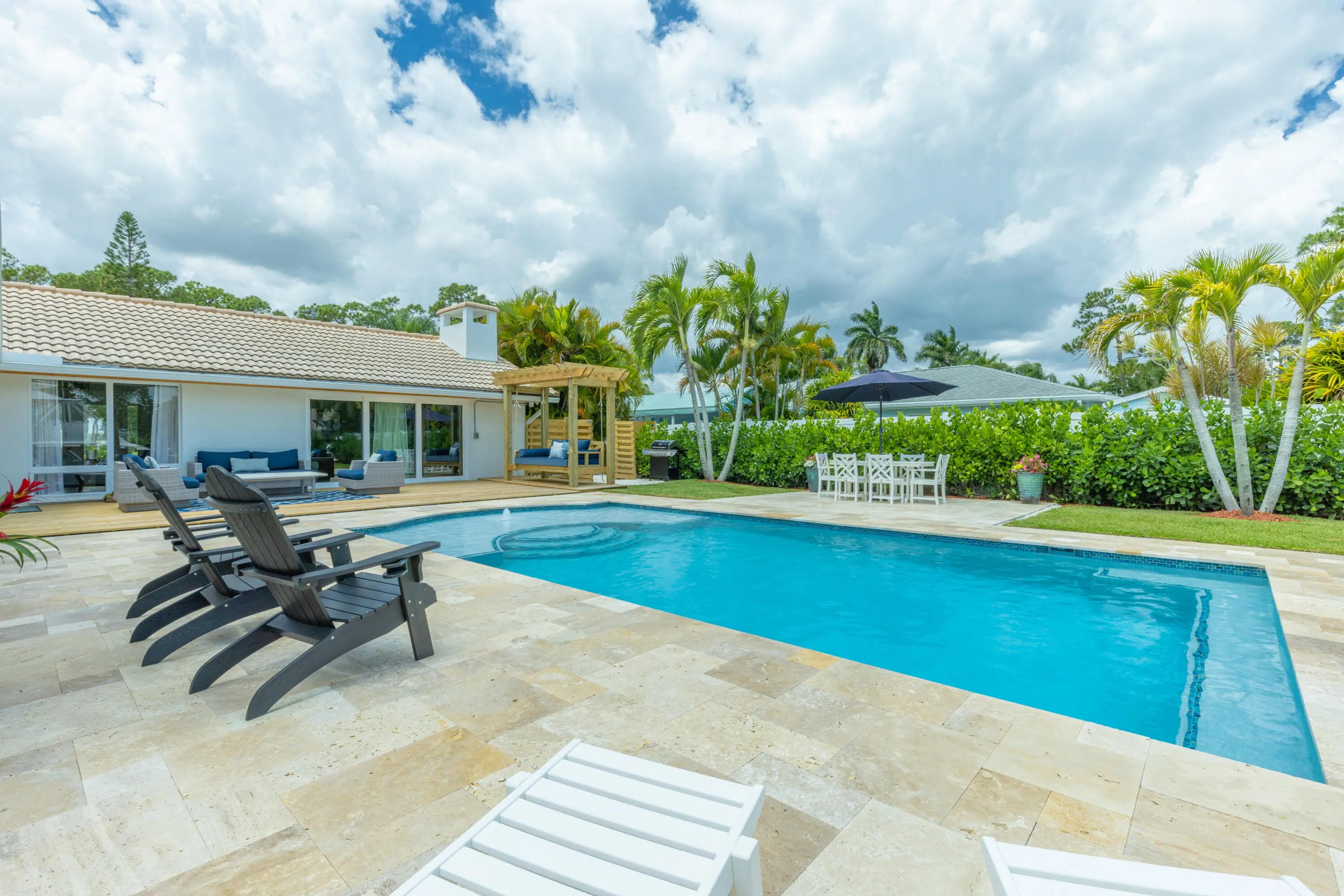 WATERFRONT OCEAN ACCESS & SALTWATER POOL W/ PRIVATE DOCK AND TIKI HUT. Positioned at the St. Lucie River, this beautifully remodeled home is complemented with a modern coastal décor and is fully equipped and furnished for your stay. Whether you're an avid boater or just looking for a gorgeous spot to relax, you're sure to find yourself sunbathing by the crystal clear pool that overlooks a private dock where you can tie up or fish for a variety of species. The dock is equipped with a cleaning station, electric, & water for your watercraft. Relax & swing under the large private Tiki Hut while watching your favorite show & eating your favorite meal fresh off the grill. Currently accepting next season offers Monthly Rates: Off-Season: $8500; Mid-Season:$12K; Season: $16K.(taxes&fees apply)