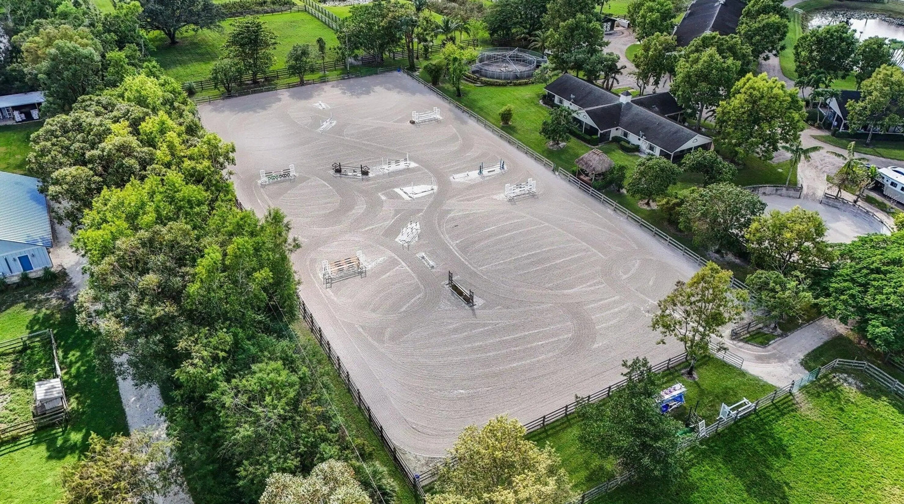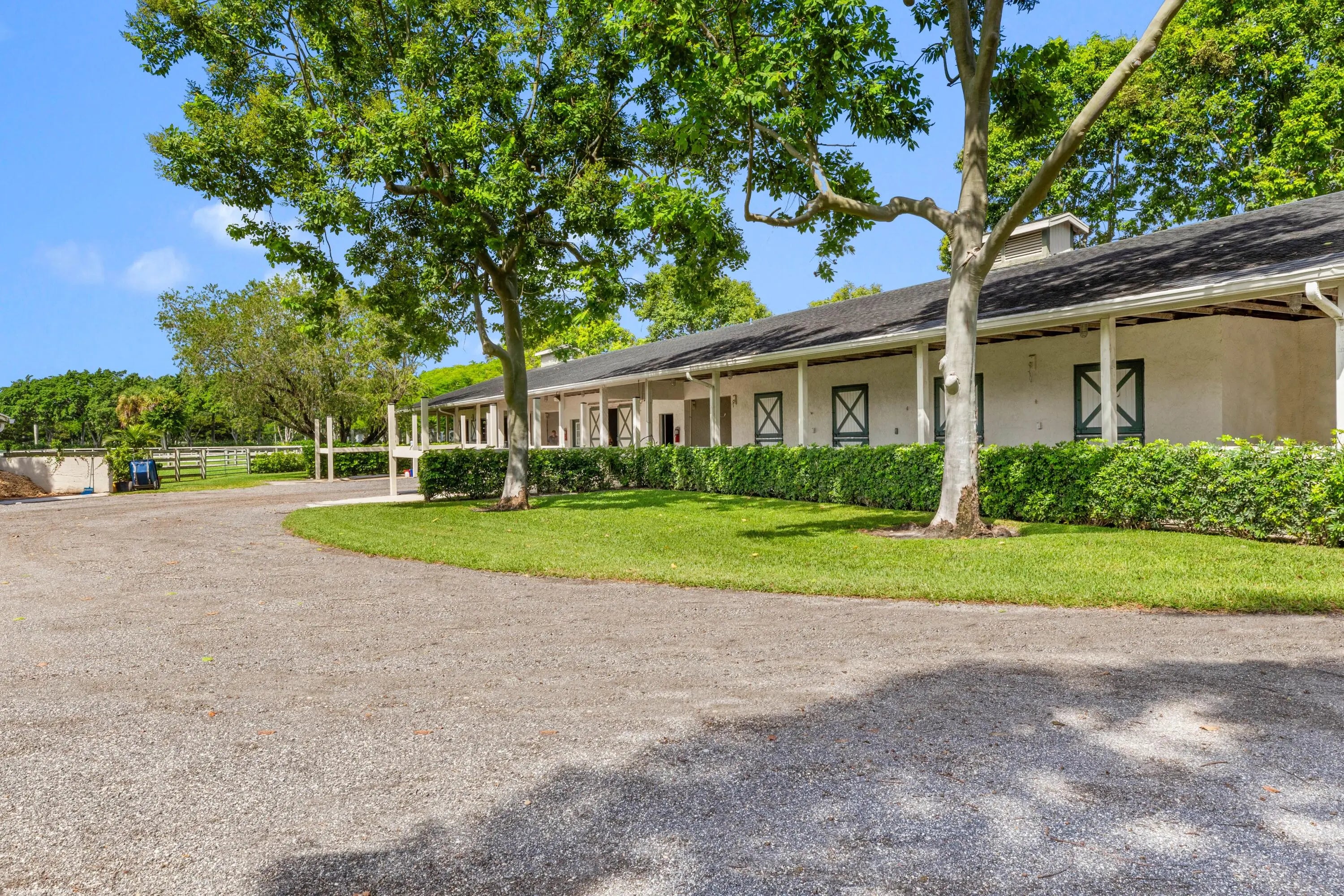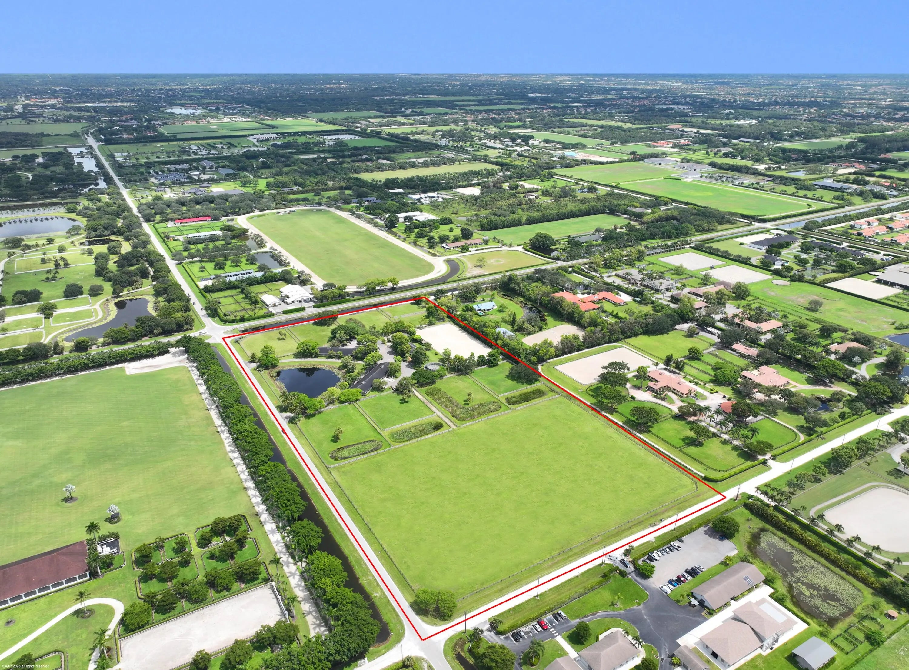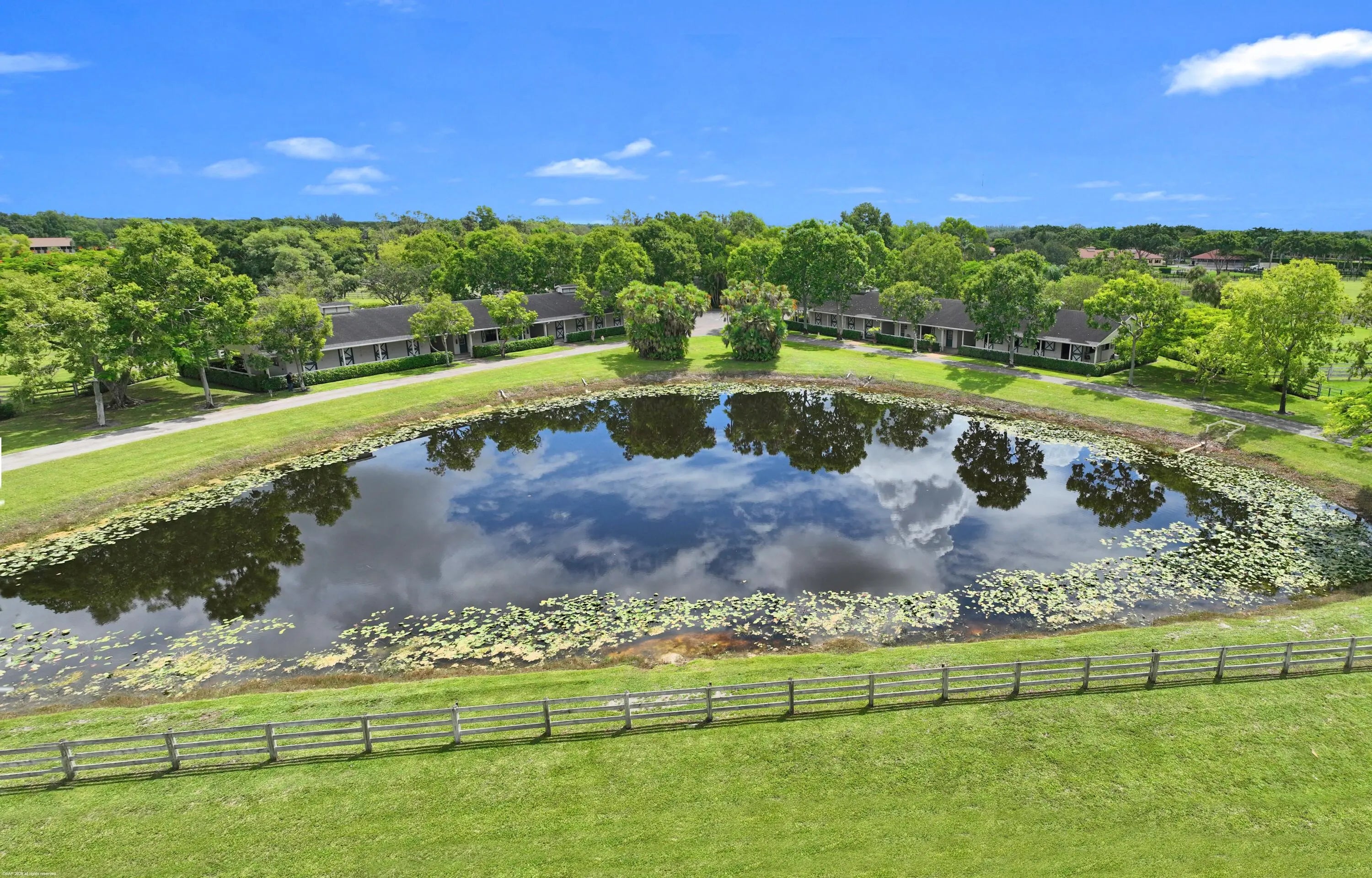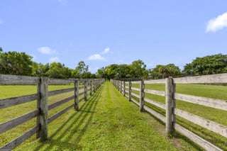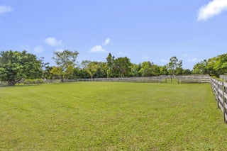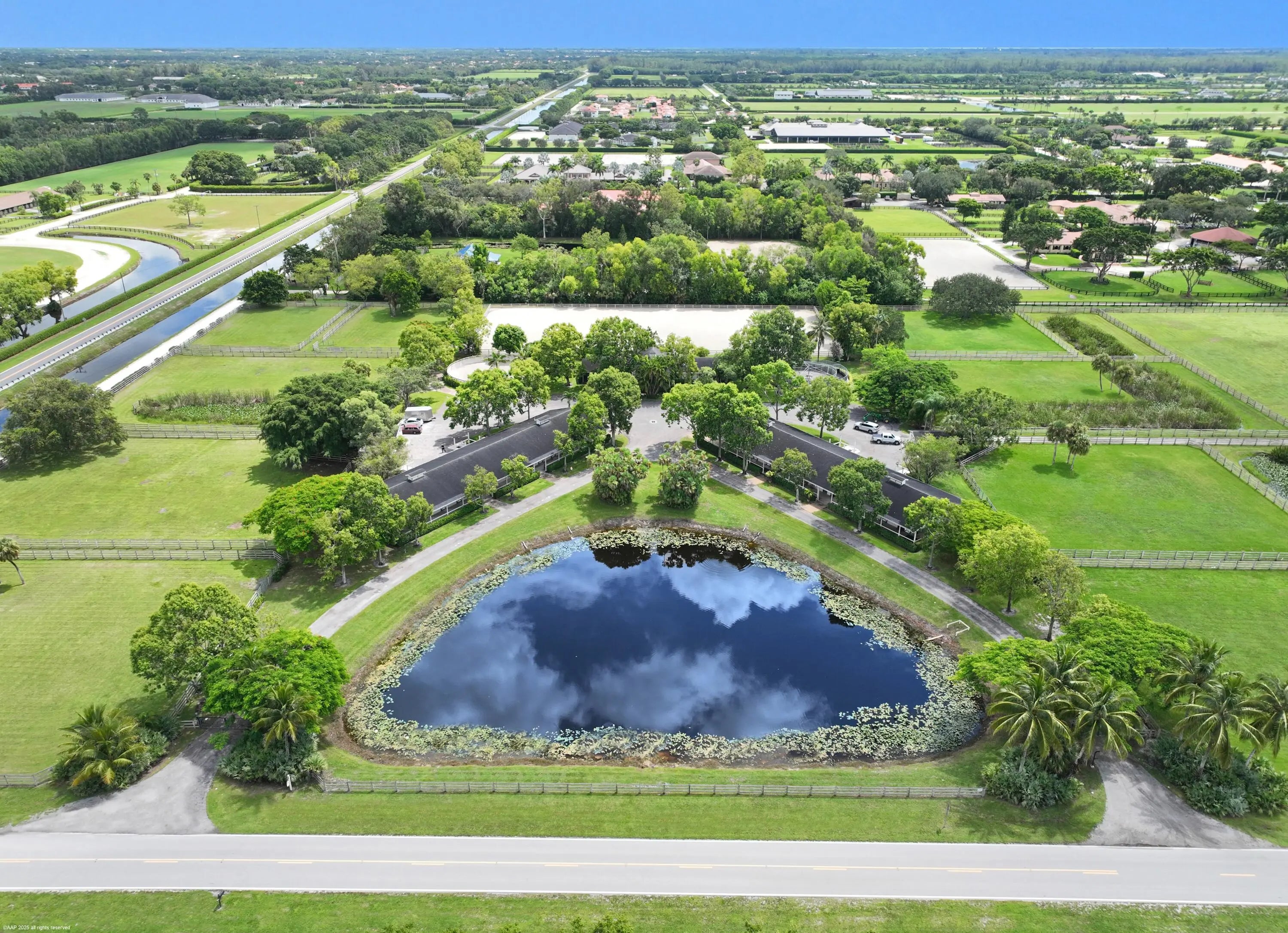 Exceptional 19.83-acre equestrian estate, just a short ride to the Wellington International show grounds and National Polo Center. This spacious equestrian compound is a testament to dedicated equestrian pursuits, offering an unparalleled training environment with two mirror-image barns housing 32 stalls. The expansive grounds feature a new 150' x 300' all-weather arena with a covered viewing area, a sprawling 7-acre grass riding field, a round pen with all-weather footing, and a Kraft five-horse walker. Nine oversized grass paddocks provide ample room for turnout, a true luxury in Wellington. The property also includes two 3-bedroom 1 bath staff apartments and a separate owner's lounge, ensuring comfort and privacy. With two screened patios overlooking the tranquil pond, this is a rare find offering an uncompromising blend of functionality and luxury, for equestrian pursuits.