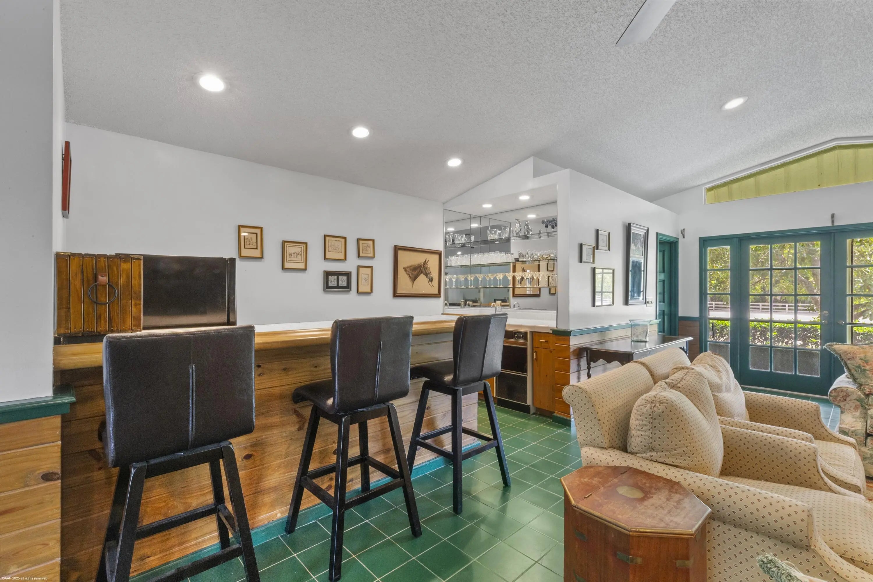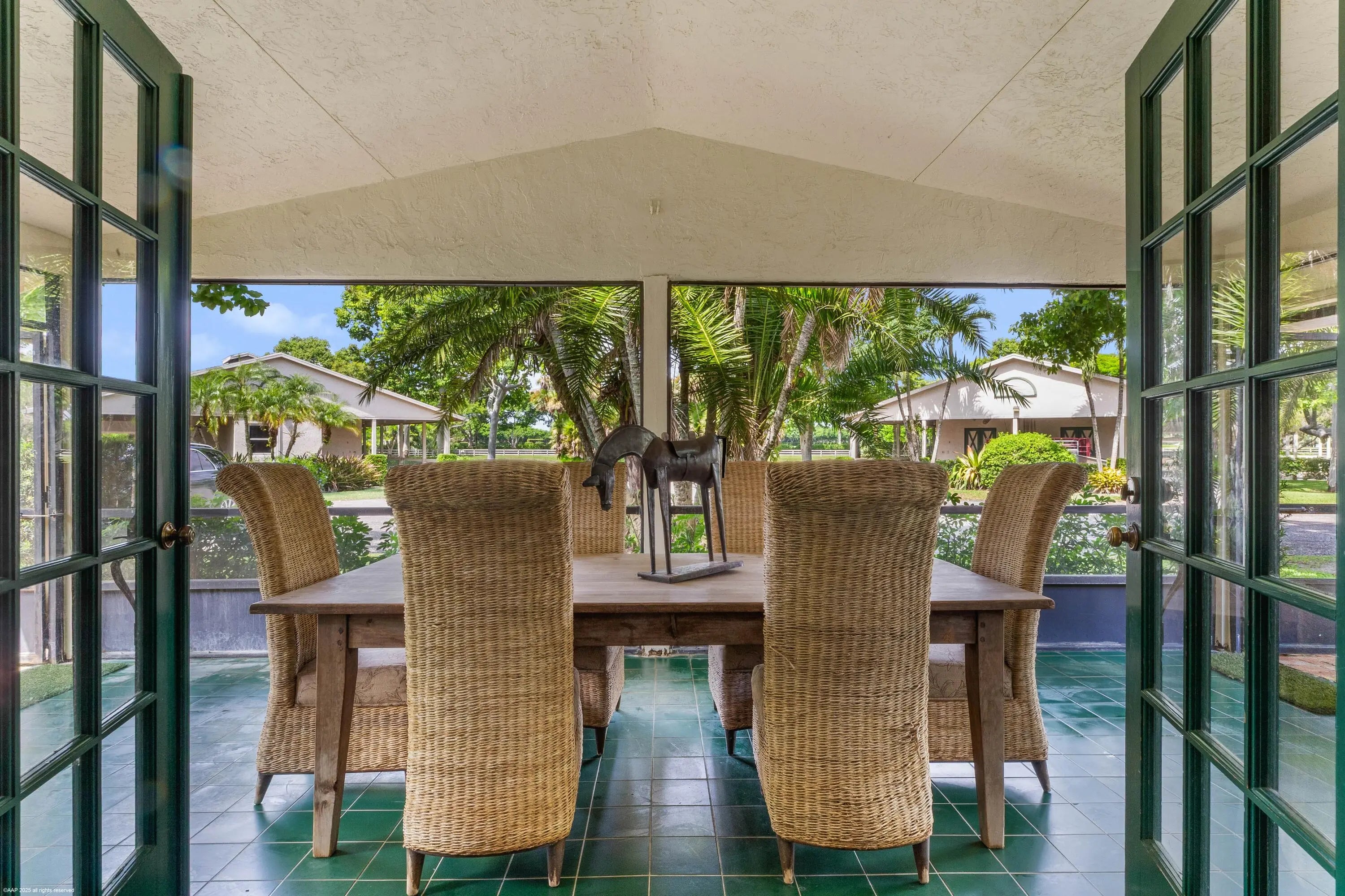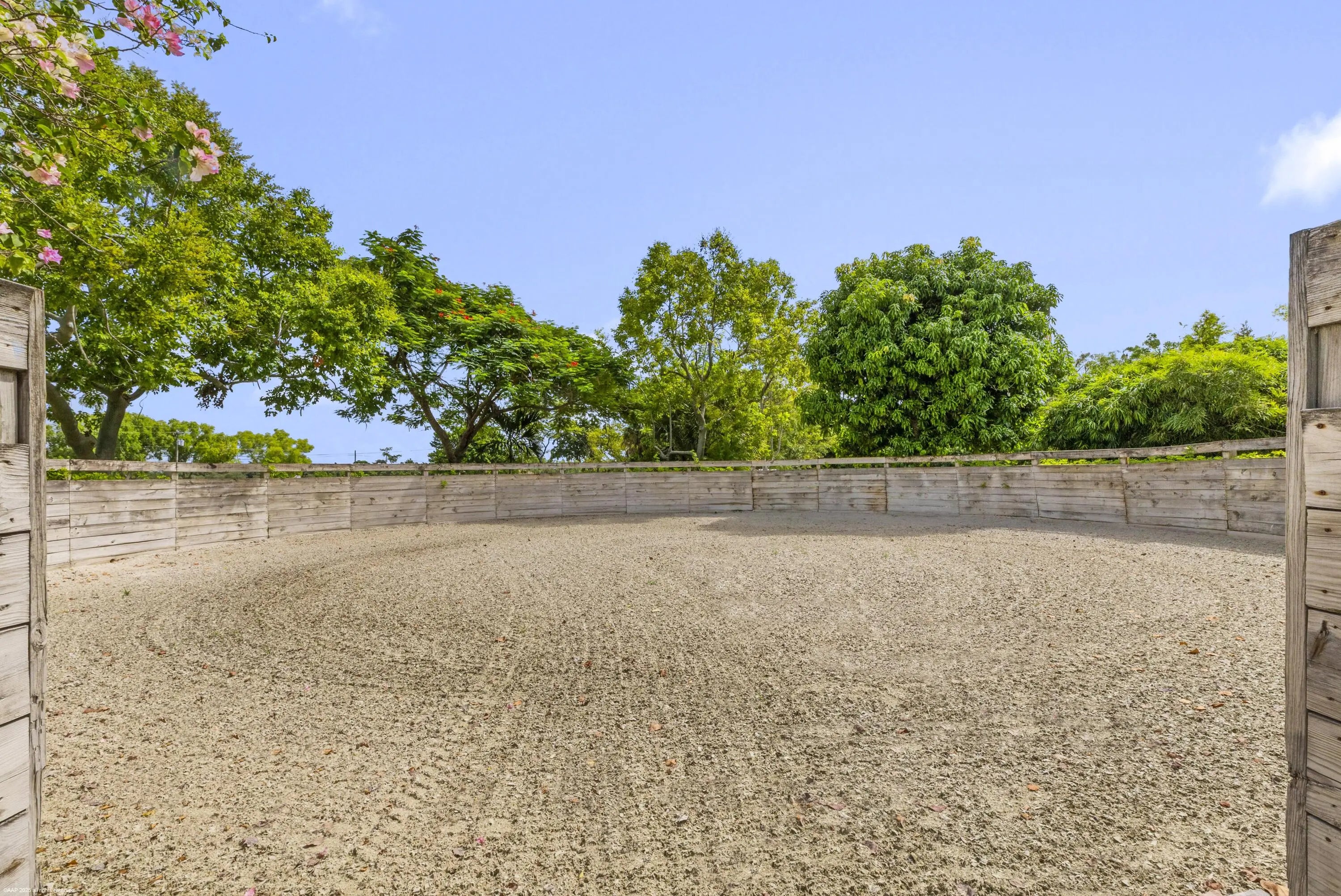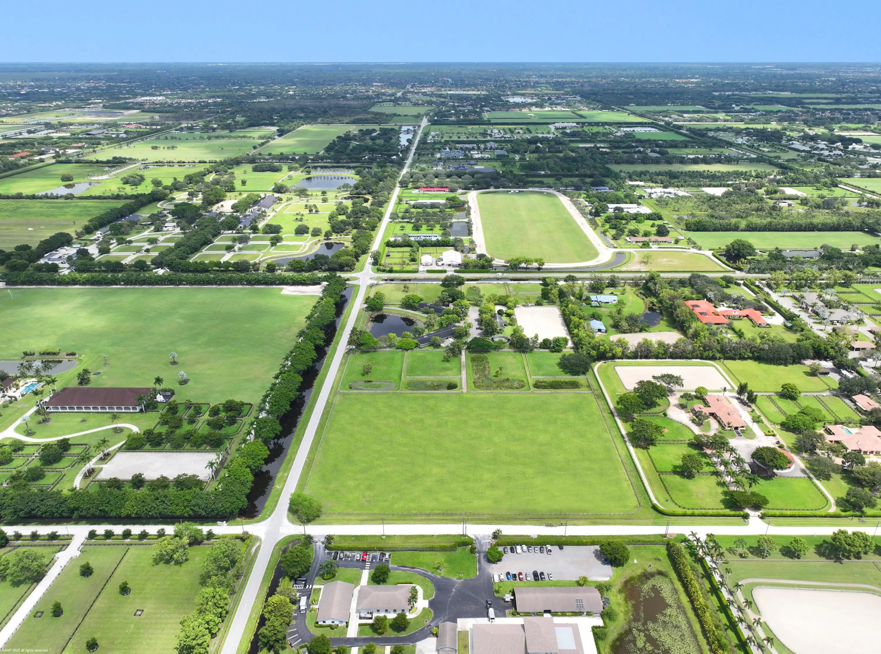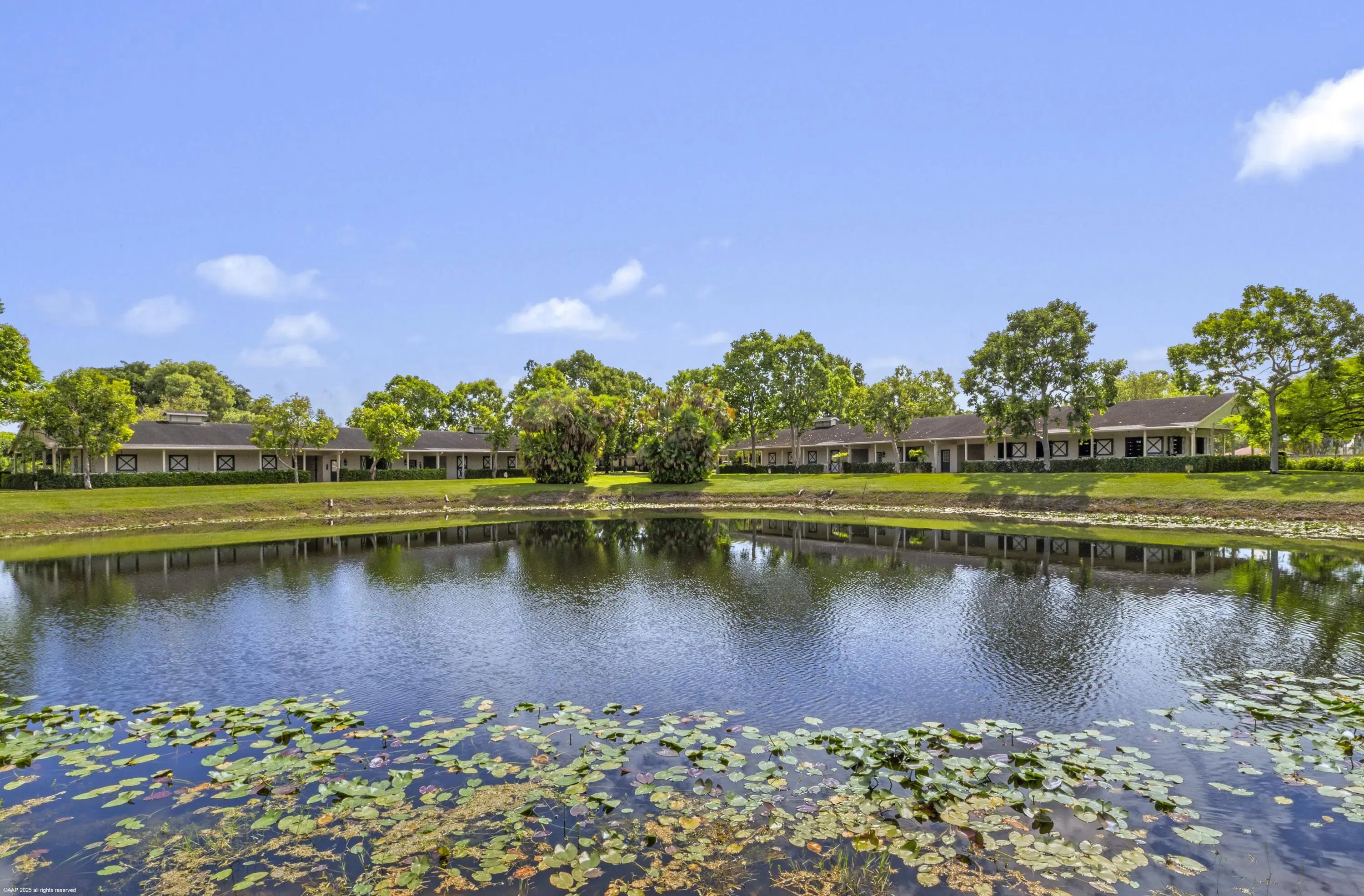 Exceptional 19.83-acre equestrian estate, just a short ride to the Wellington International show grounds and National Polo Center. This spacious equestrian compound is a testament to dedicated equestrian pursuits, offering an unparalleled training environment with two mirror-image barns housing 32 stalls. The expansive grounds feature a new 150' x 300' all-weather arena with a covered viewing area, a sprawling 7-acre grass riding field, a round pen with all-weather footing, and a Kraft five-horse walker. Nine oversized grass paddocks provide ample room for turnout, a true luxury in Wellington. The property also includes two 3-bedroom 1 bath staff apartments and a separate owner's lounge, ensuring comfort and privacy. With two screened patios overlooking the tranquil pond, this is a rare find offering an uncompromising blend of functionality and luxury, for equestrian pursuits.