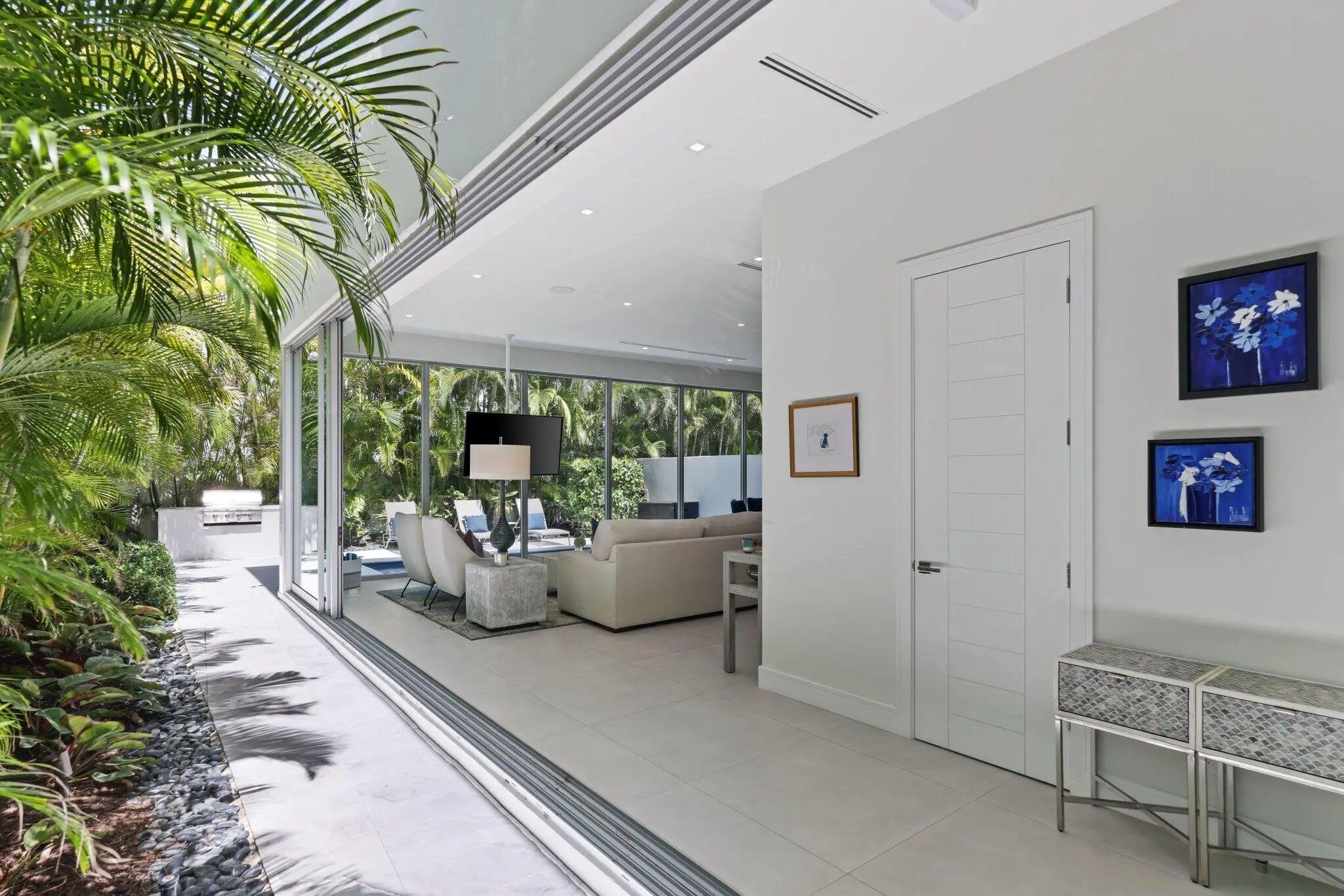Absolutely stunning and impeccably maintained modern beachside home. This furnished townhome is perfectly situated just one block from Boca Raton's pristine beach and moments from restaurants and shops of Deerfield Beach. Designed with an open floor plan and dramatic floor-to-ceiling windows, this residence is filled with natural light and offers serene views of the private pool, loggia, and lush tropical landscaping. From the moment you enter the impressive foyer, you are welcomed into your own slice of paradise. The gourmet kitchen features Sub-Zero appliances, a natural gas cooktop, custom floor-to-ceiling soft-close cabinetry, and an oversized walk-in pantry. Each of the three spacious bedrooms are en suite, while the primary suite and spa-like bath showcase captivating ocean views.