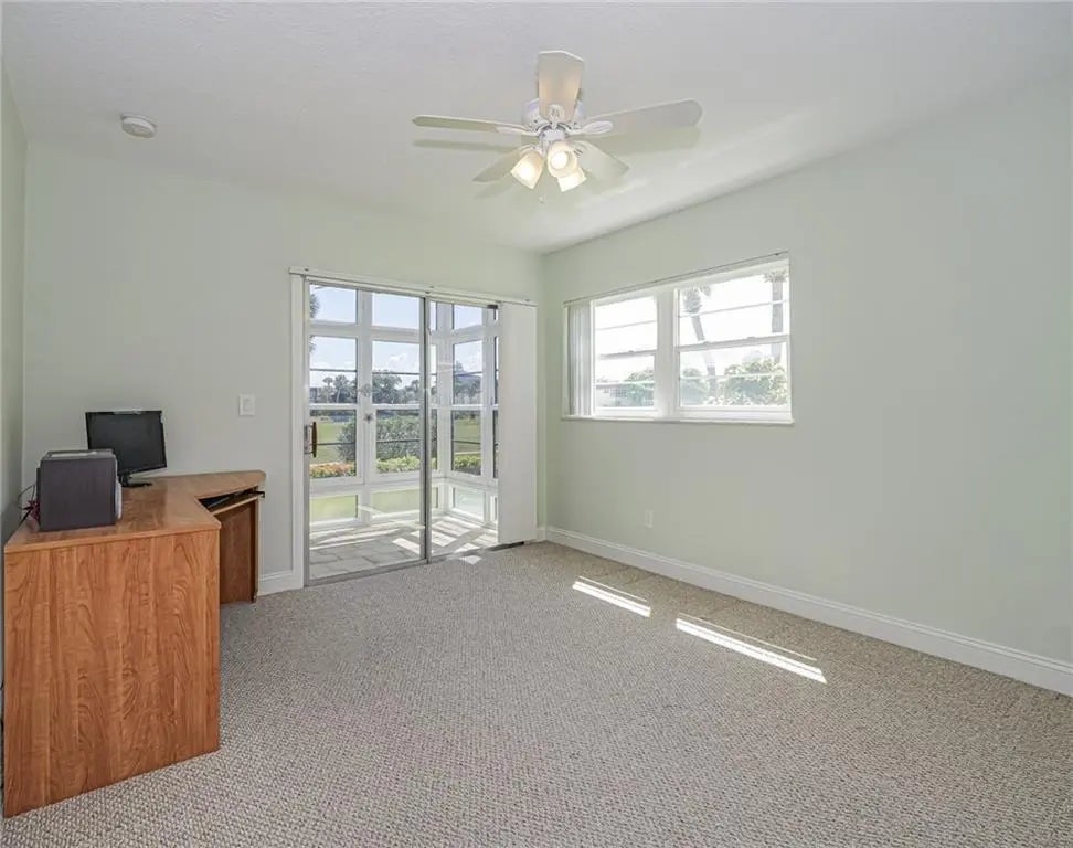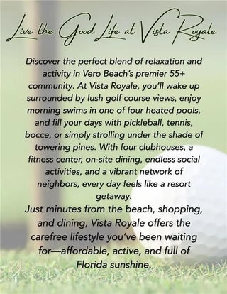 SIMPLY STUNNING REMODEL IN VISTA ROYALE! Beautifully remodeled 2/2 1st floor condo that blends modern elegance w/ the active lifestyle of Vero Beach's premier 55+ community. Every detail has been thoughtfully updated, starting w/ impact windows & doors for peace of mind, a 2023 roof, 2023 AC & private enclosed paver patio offering sweeping views of golf course & shimmering lake. Inside, you'll find a light-filled open floor plan, highlighted by an updated kitchen w/ sleek finishes and completely renovated baths that bring a touch of luxury to everyday living. Office photo is virtually staged.