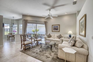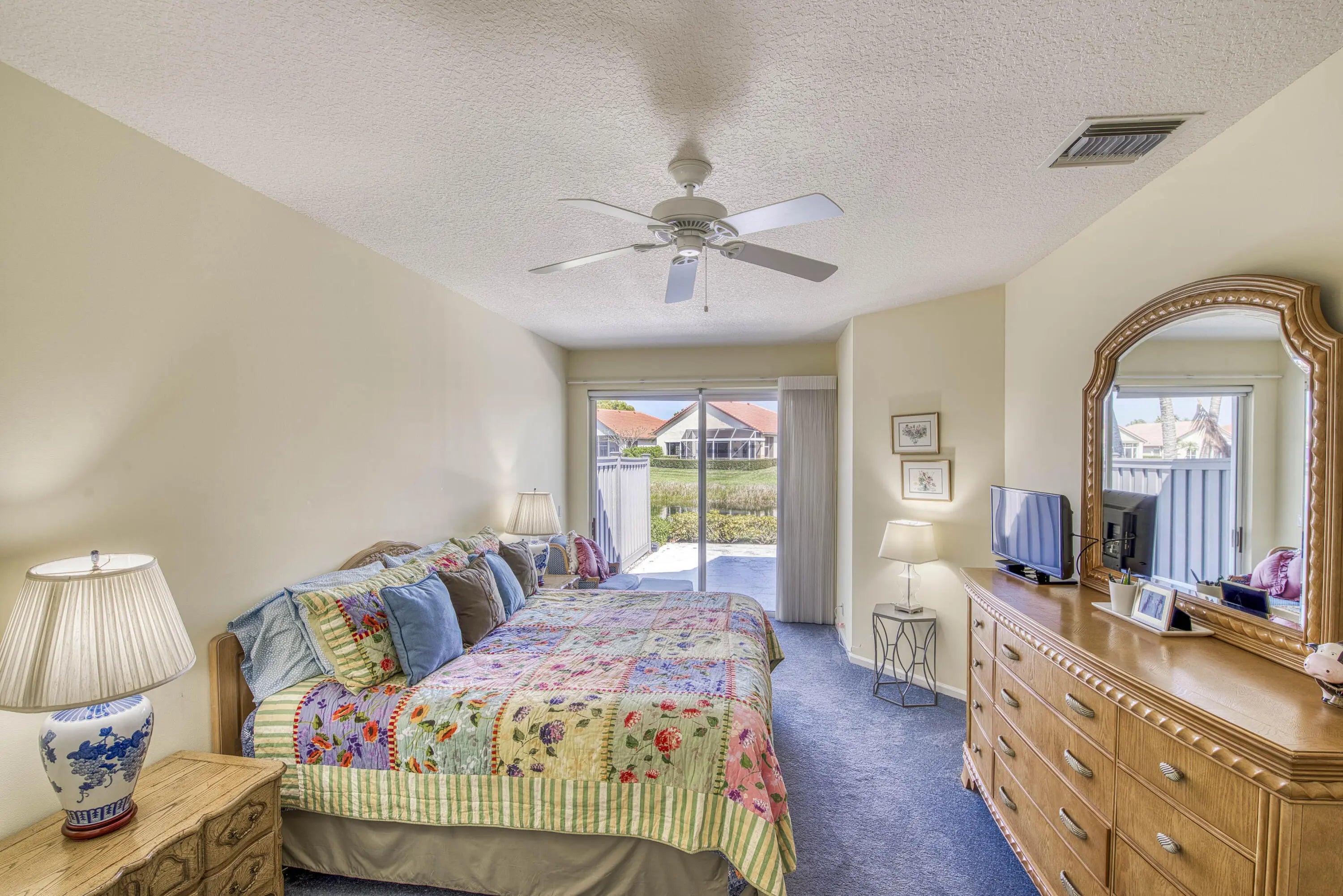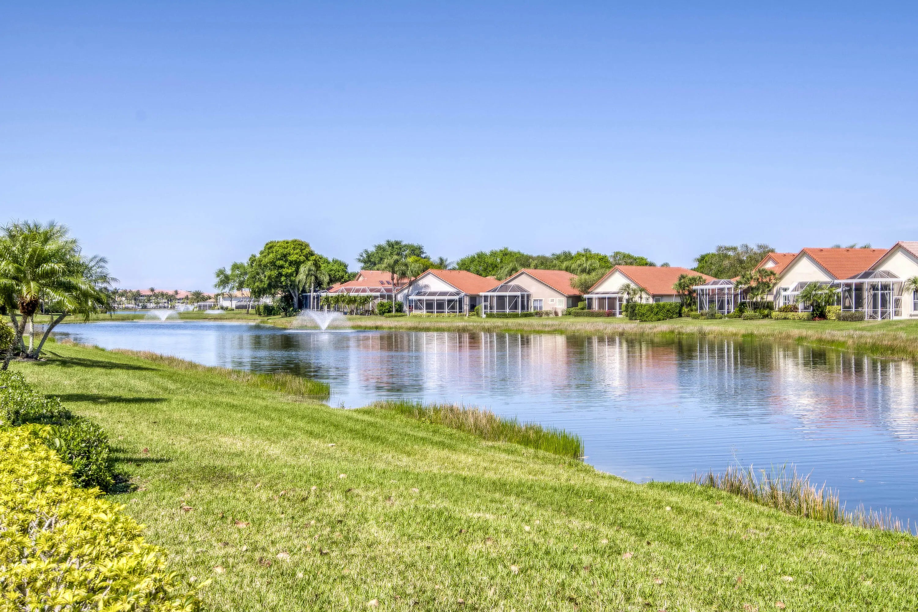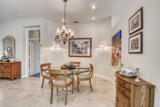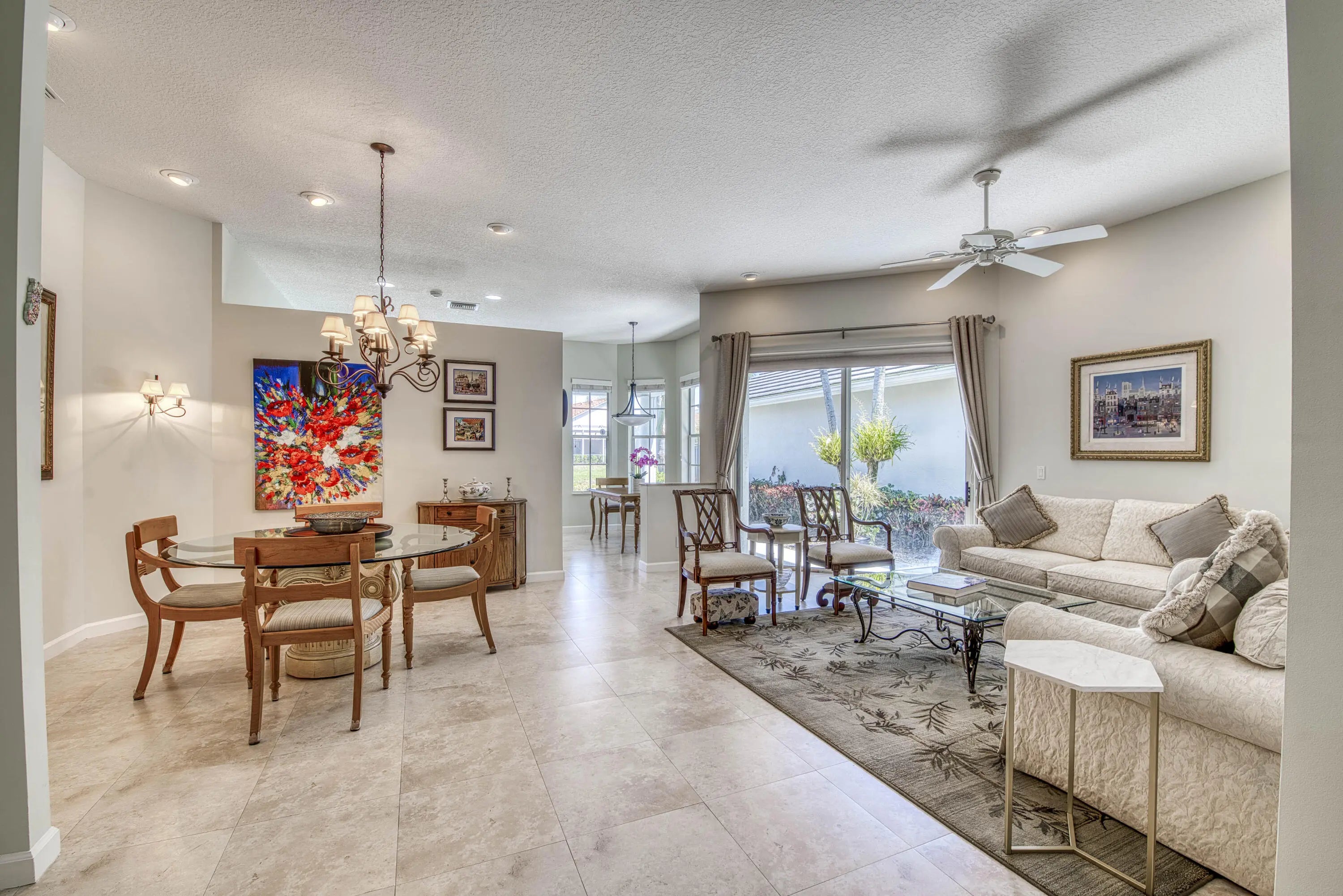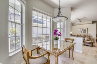 Welcome to this 2,023 sq ft CBS single-family home, featuring 3 bedrooms and 3 bathrooms in the prestigious Masters at Eagleton neighborhood of PGA National. The bright living room is filled with natural light from sliding glass doors and recessed ceiling lighting, complemented by off-white walls and neutral stone-look tile. Adjacent, the formal dining area offers a chandelier, wall sconces, and recessed lighting, seamlessly connecting to the open-concept living space. The kitchen boasts linen-toned paneled cabinets, granite countertops, a neutral mosaic glass tile backsplash, black appliances, a prep island with sink and dishwasher, and a sunny breakfast nook in a bay window. The cozy family room overlooks tranquil lake views and provides access to the covered patio. A spacious office with en-suite bath offers flexibility as a guest suite. The primary suite features a seating area, walk-in closet, and private en-suite with dual vanities, Roman tub, glass-enclosed shower, and water closet. The guest bedroom is bright and comfortable, offering generous closet space and perfect for welcoming visitors. Outdoor living is enhanced by a covered side patio off the living and family rooms and an open back patio off the primary bedroom, perfect for relaxing or entertaining while enjoying serene lake views.
