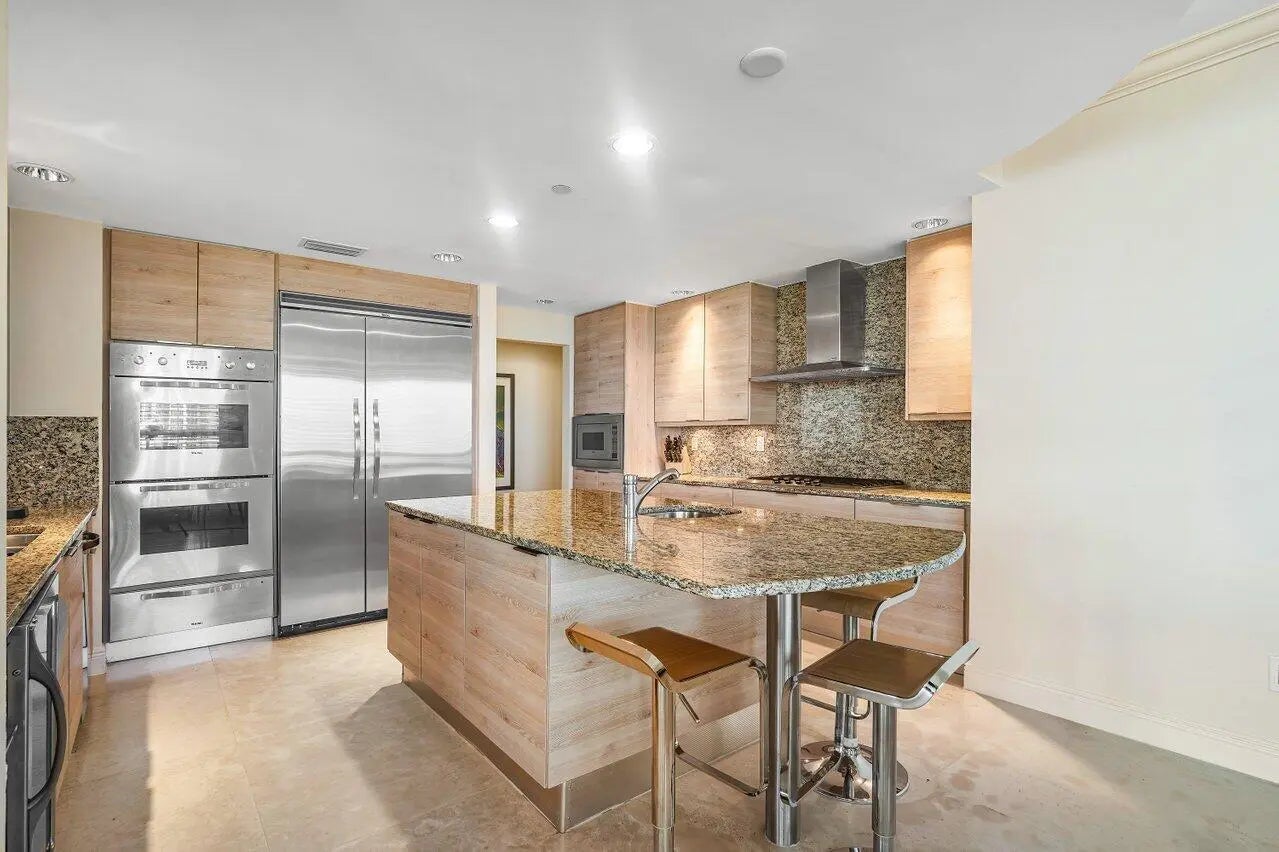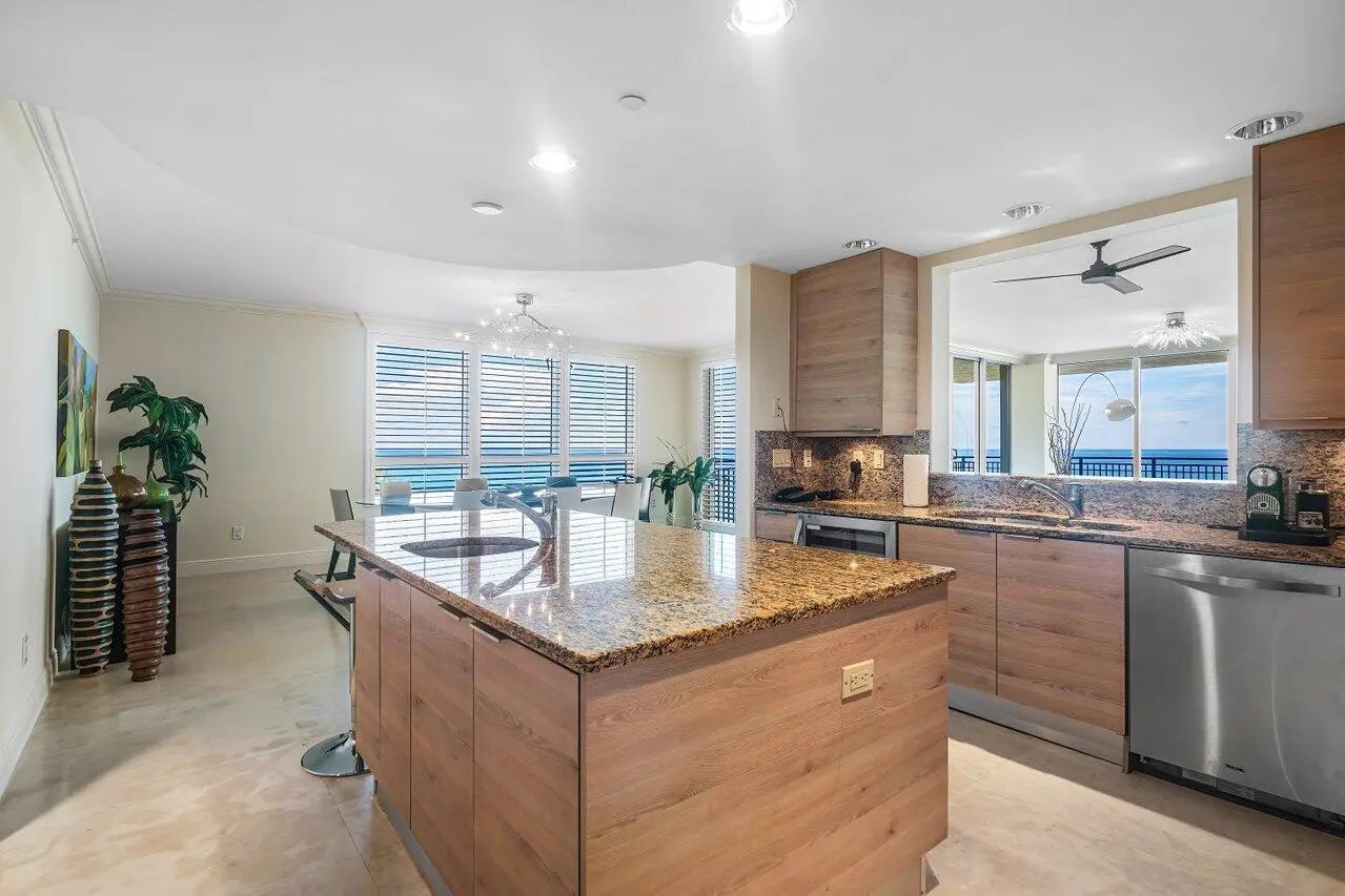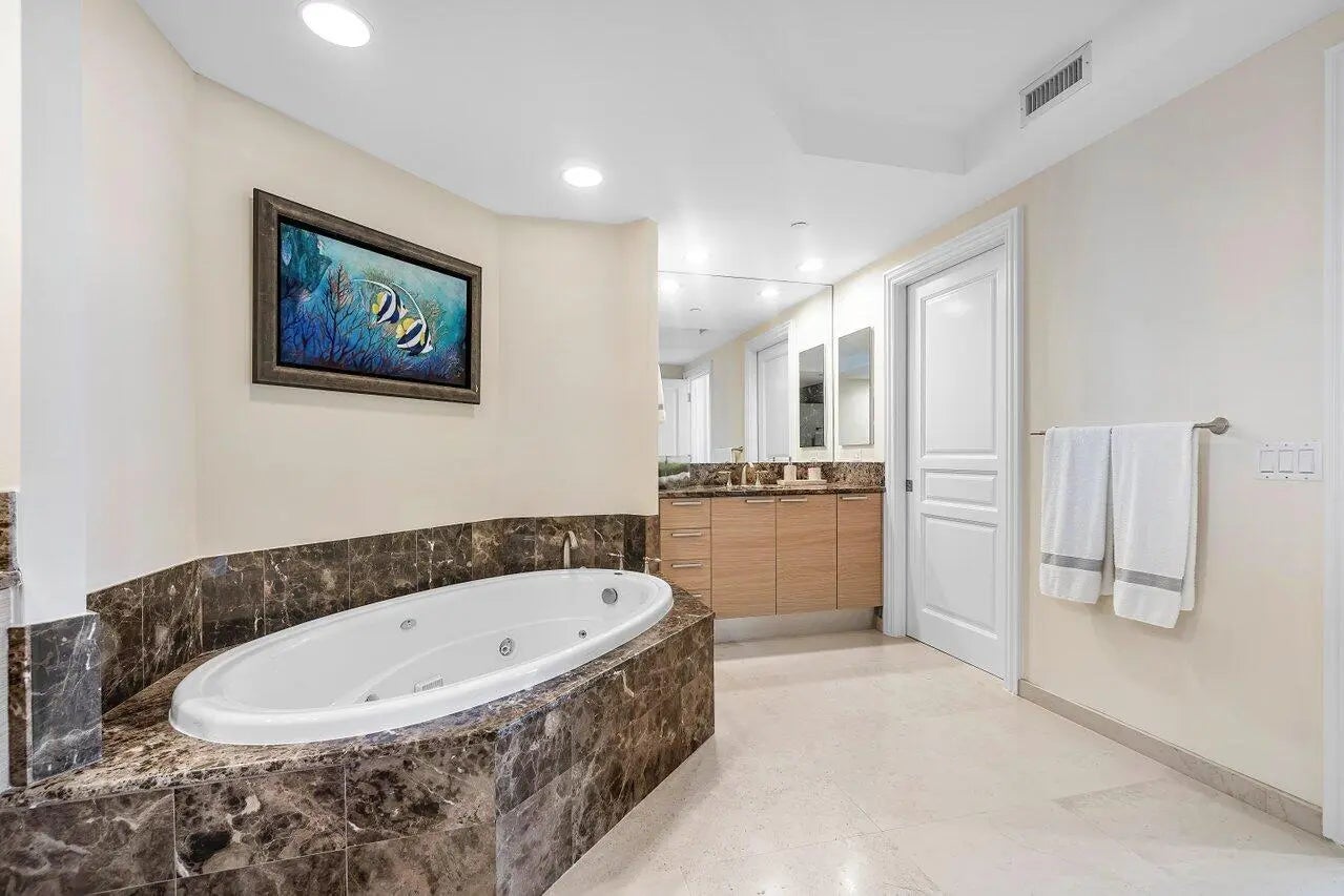 The Private Residences of the Resort on Singer Island. The condominium showcases a split floor plan, encompassing 3 bedrooms and 3.5 bathrooms, with each bedroom featuring an en-suite bathroom and walk-in closet. The kitchen is well-appointed with granite countertops, stainless steel appliances, and a wine cooler. Marble flooring extends throughout the property, which also includes a full-size washer and dryer. Residents enjoy access to the Palm Beach Marriott's comprehensive amenities, such as two pools, a whirlpool, multiple dining venues, a fitness center, Si Spa, a billiard room, social rooms, a movie theater, valet parking, a 24-hour business center, an elevator, a lobby, an on-site manager, a sauna, sidewalks, a spa-hot tub