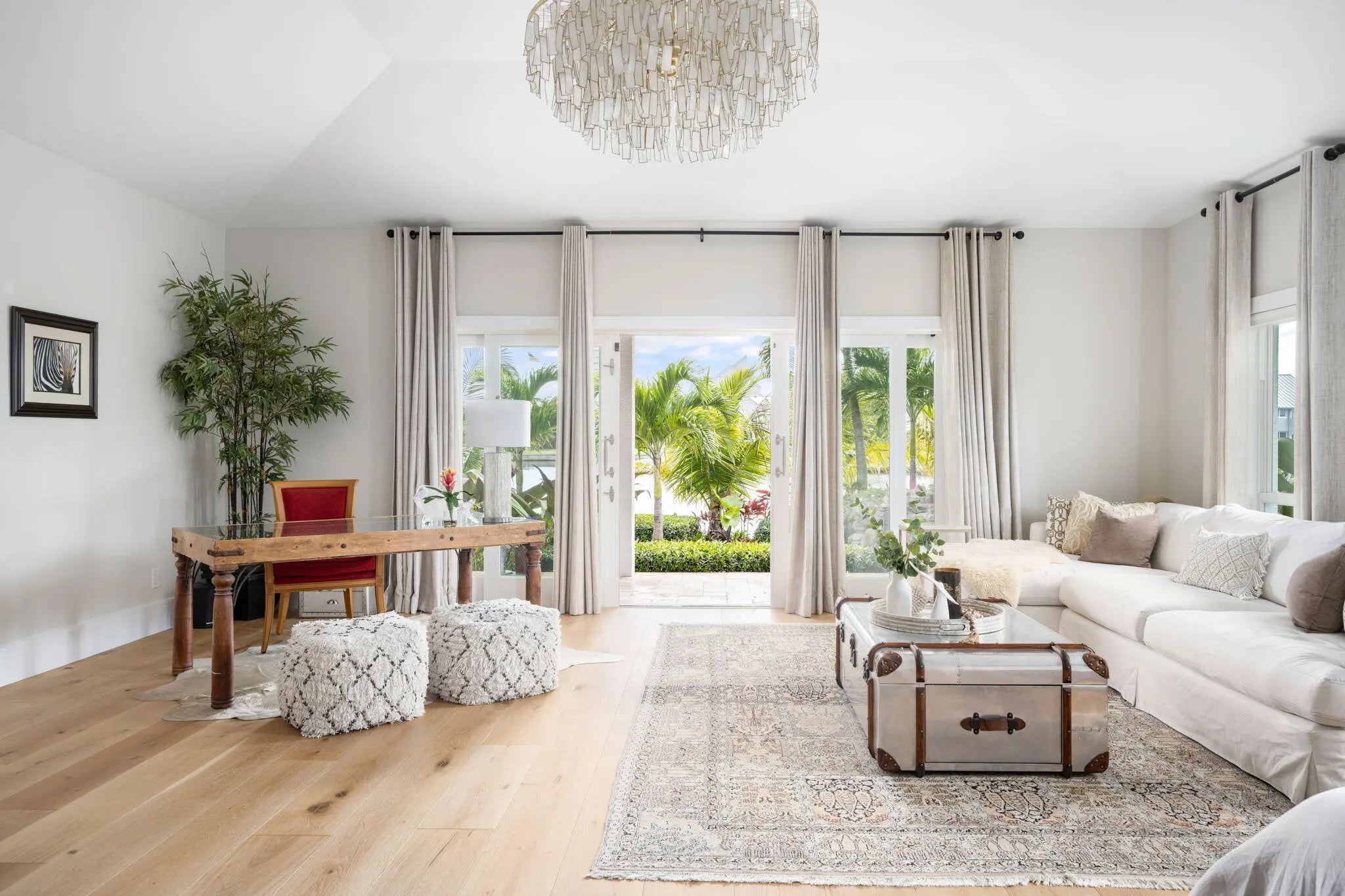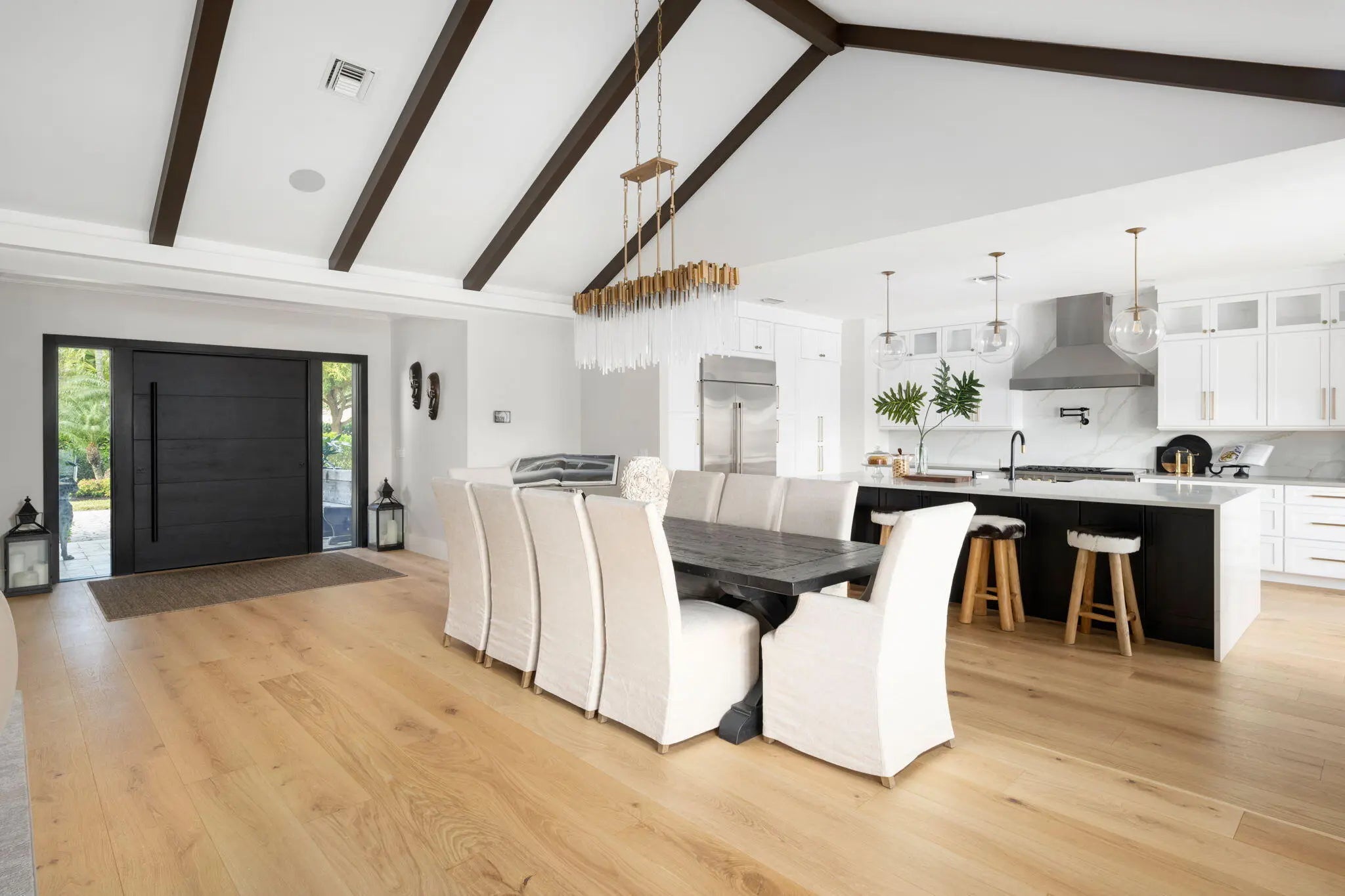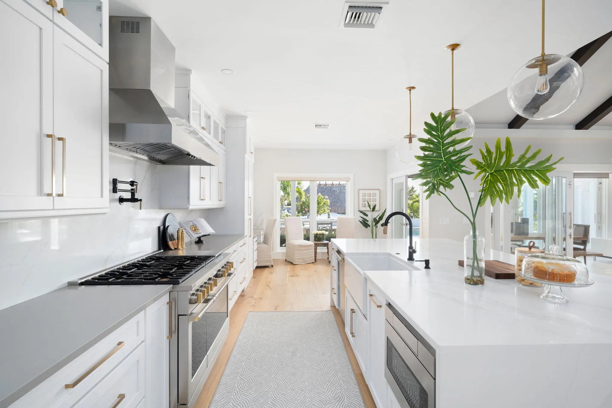 This IS a boater's dream! Over 184 feet of PROTECTED DEEP-WATER frontage, a 98' Ipe wood dock, 24,000 LB lift, & quick access to the intracoastal! Recent renovations transformed this 5,500+ SF home into a modern, luxurious retreat that seamlessly blends indoor & outdoor living. Privacy is enhanced by lush landscaping & authentic Chickee Tiki huts, creating multiple areas for entertaining or enjoying the Florida lifestyle. Spacious updated floor plan with a gourmet kitchen, spacious room sizes & private en-suite bedrooms. All impact glass sliders & windows! Nothing has been missed here!