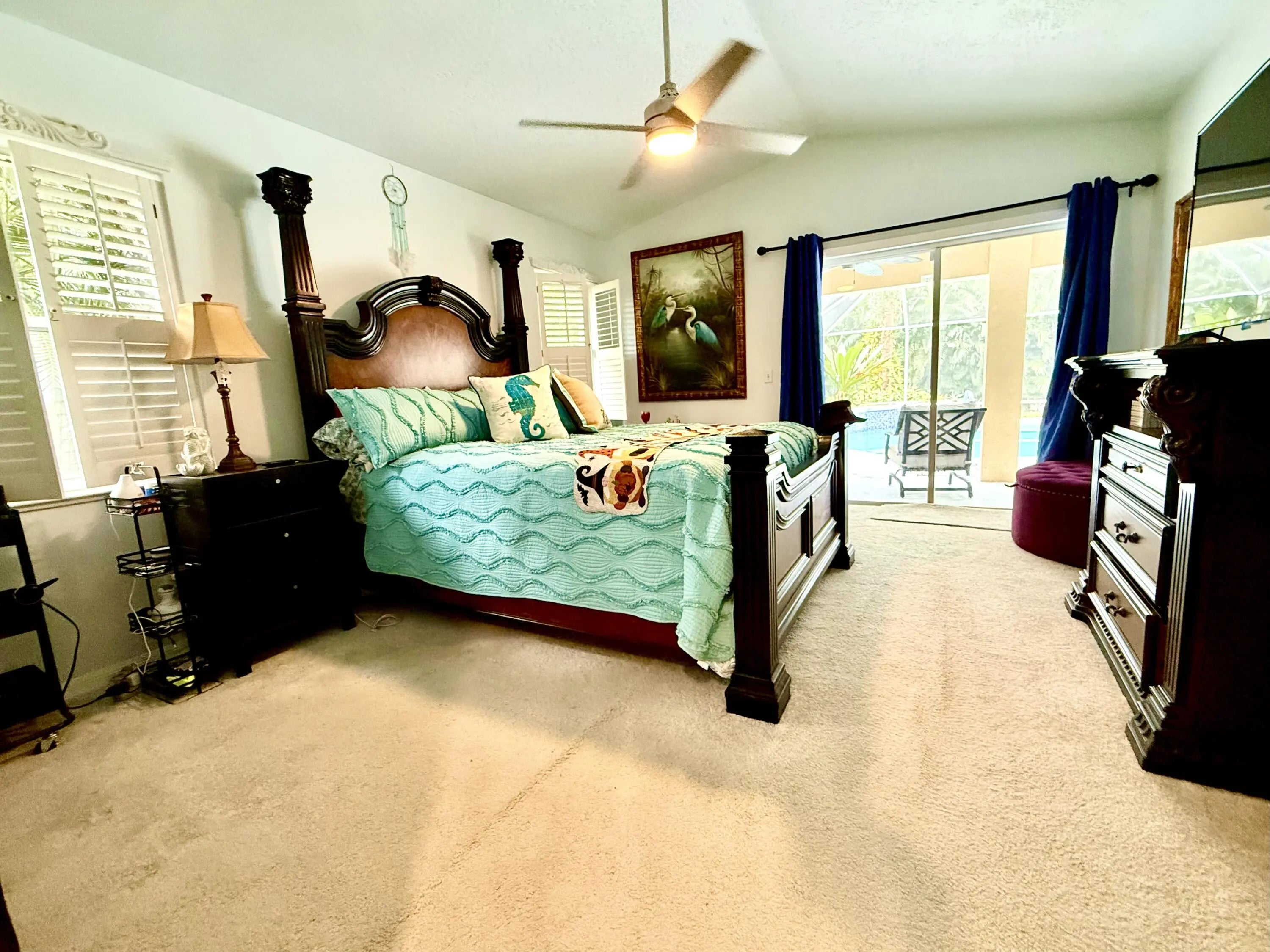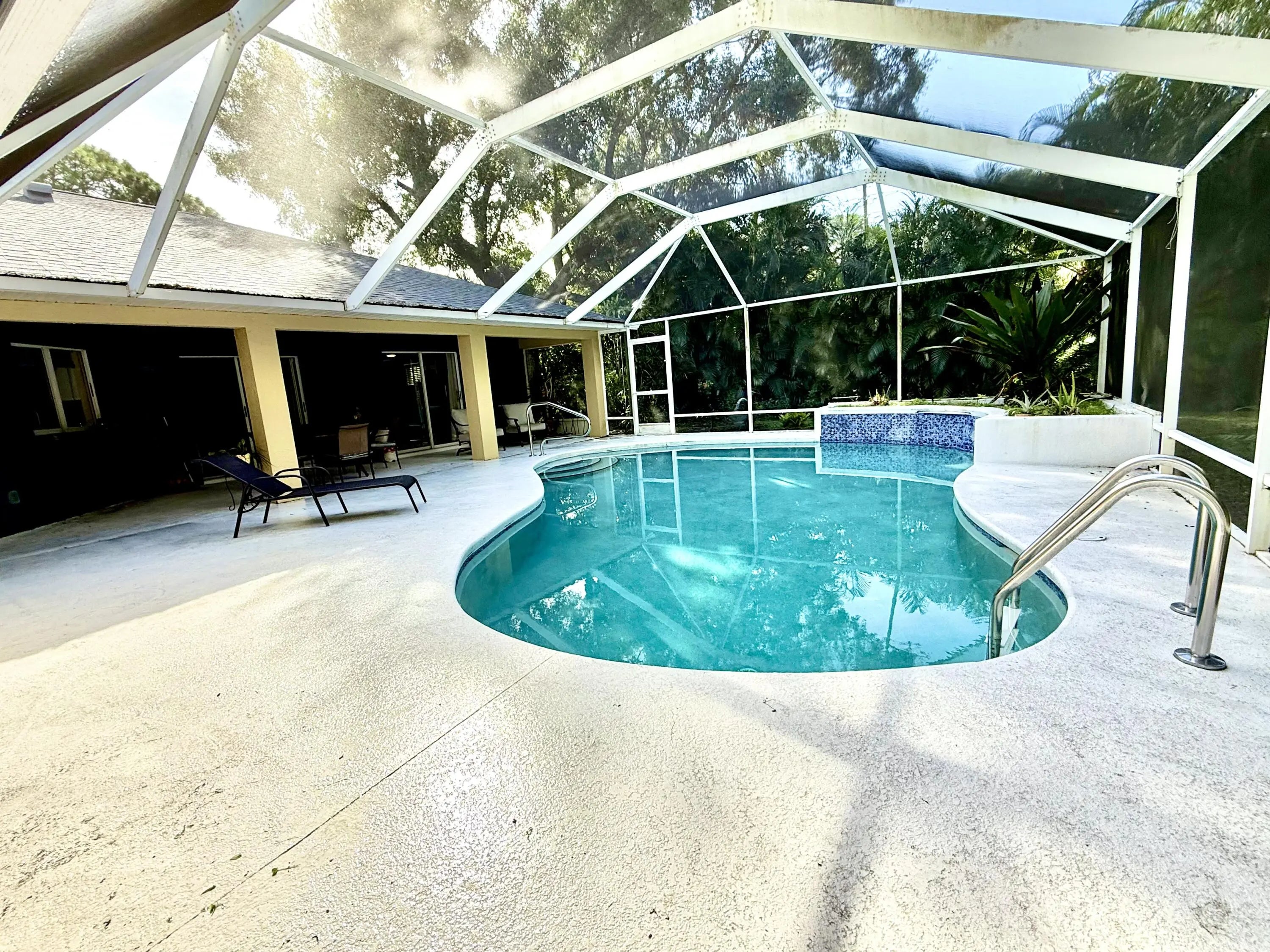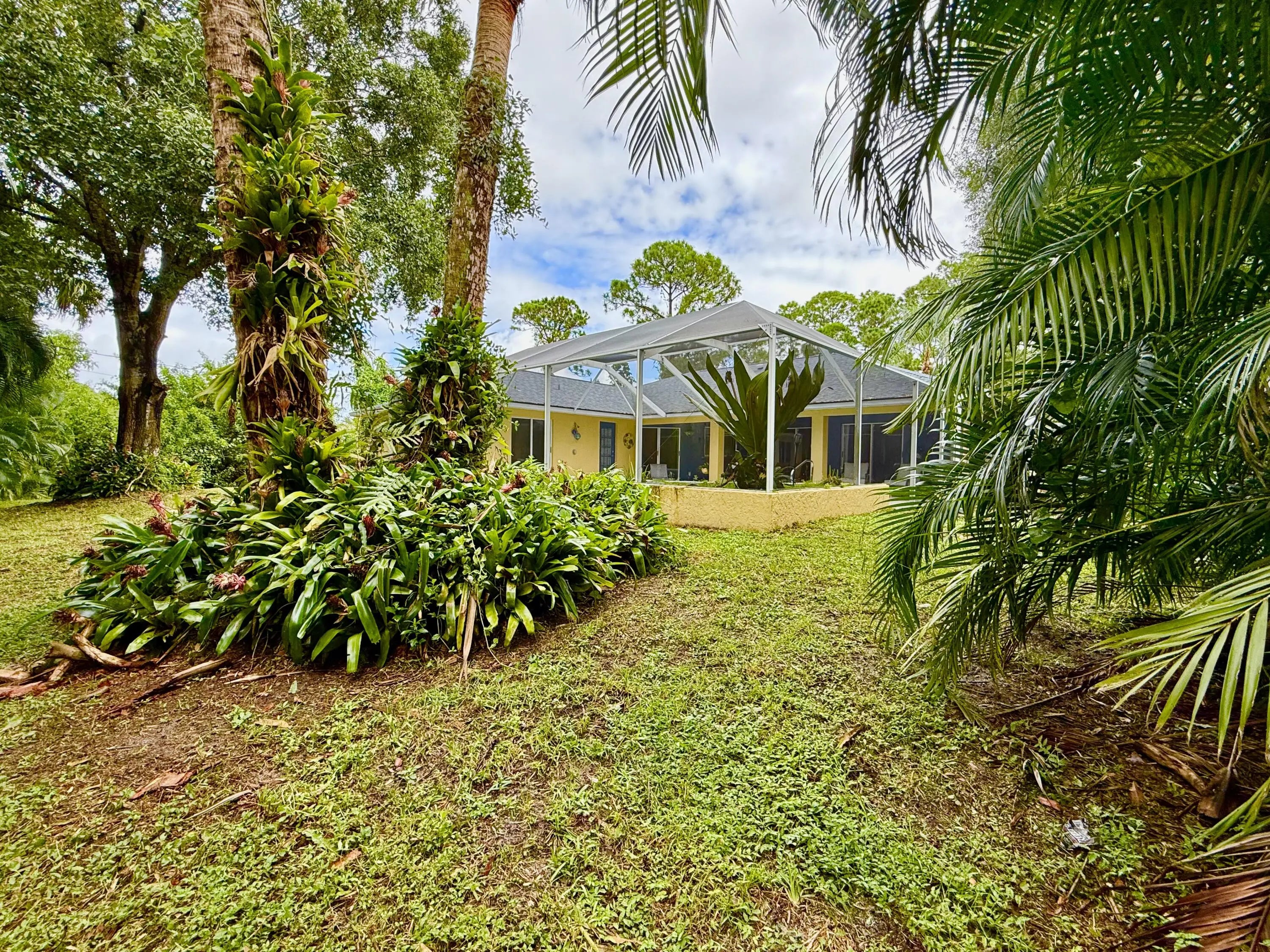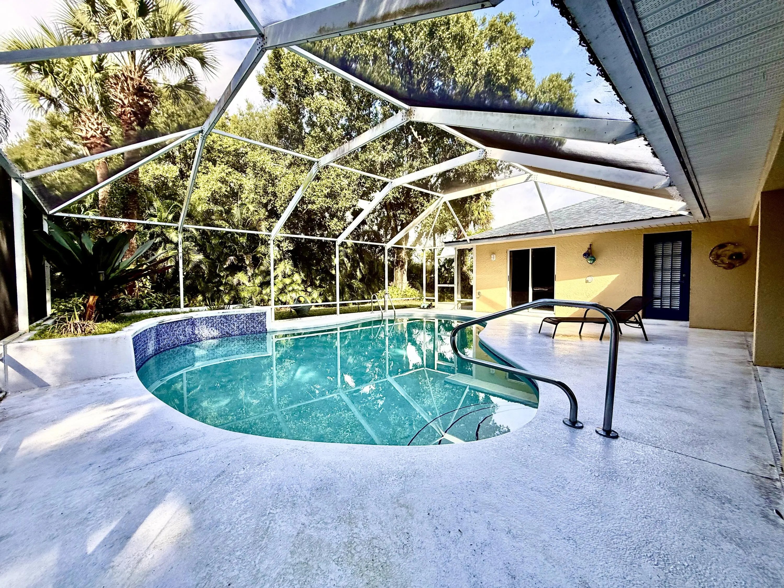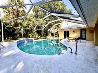 Discover this charming 3-bedroom, 2-bathroom pool home offering 1,900 square feet of comfortable living in a serene, tropical setting. The warm yellow stucco exterior features elegant arched windows, mature palm trees, and a spacious two-car garage, The backyard showstopper is a stunning screened-in pool with mosaic tile accents and an expansive deck—perfect for lounging and entertaining in your own resort-style retreat. Inside, enjoy bright, open living spaces with tile flooring throughout. This move-in-ready home perfectly blends indoor comfort with outdoor living