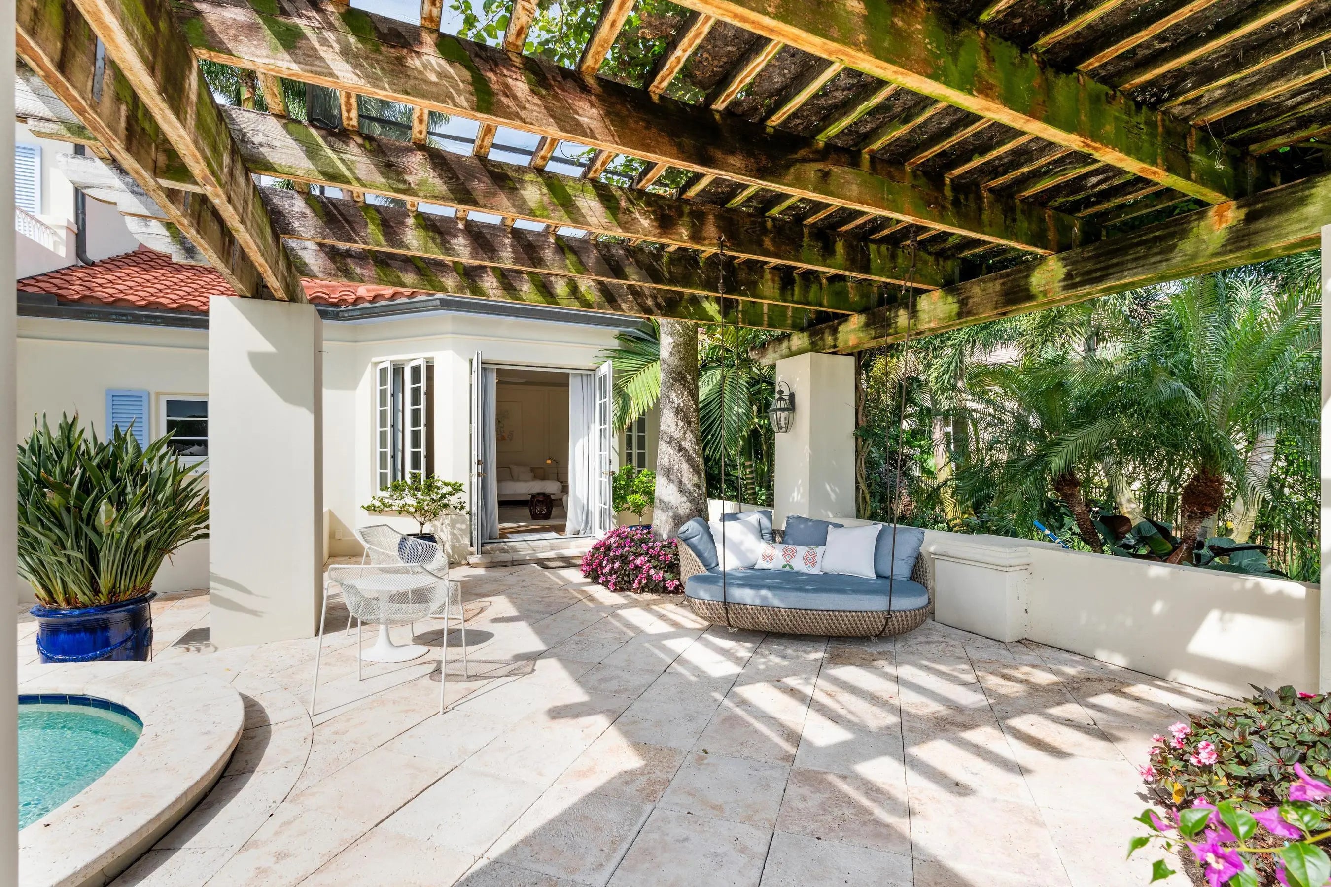 Luxury meets timeless elegance in this stunning 5-bedroom, 6.1-bath estate in the Palm Beach Polo Club, surrounded by lush tropical landscaping and serene preserve views. From the moment you enter through the private front courtyard, you'll be captivated by the European-inspired charm, marble and wood flooring, and abundant natural light streaming through custom shutters and French doors. The thoughtfully designed floor plan offers a 3-way bedroom split for ultimate privacy. The primary suite is conveniently located on the main floor, featuring direct access to a tranquil sitting area under a pergola by the pool. Upstairs, two bedrooms and two baths overlook the preserve from a private balcony, while an additional two-bedroom, two-bath guest suite sits above the 3-car garage, complete with private side-yard access and its own driveway, perfect for multi-generational living or guests. Enjoy elegant entertaining in the formal living and dining rooms, both opening to the covered patio and resort-style pool. The spacious family room off the chef's kitchen includes a wet bar, separate coffee station, and access to both the poolside patio and a second pergola-covered sitting area. Outdoors, the backyard is a private oasis featuring a sparkling pool, fountain, putting green, and multiple spaces for relaxation. Other highlights include a whole-house generator, impact windows and doors, 2015 roof, newer AC units, and a brick-paver driveway framed by mature Areca palms. Located in the heart of Wellington, this home offers the best the area has to offer, including world-class equestrian venues, premier schools, upscale shopping, and exceptional dining, all within minutes. A true private paradise that perfectly blends sophistication, comfort, and the Wellington lifestyle.